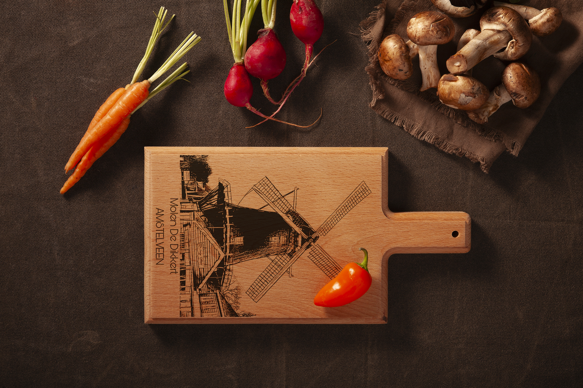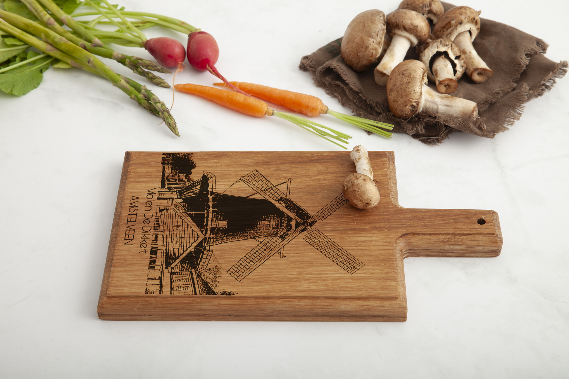 Inspired by the iconic Molen De Dikkert, this handcrafted cheese board brings the charm of Amstelveen’s history into your home. Each board is made from premium beech wood, featuring a detailed engraving of De Dikkert windmill, adding a unique touch to your kitchen decor.