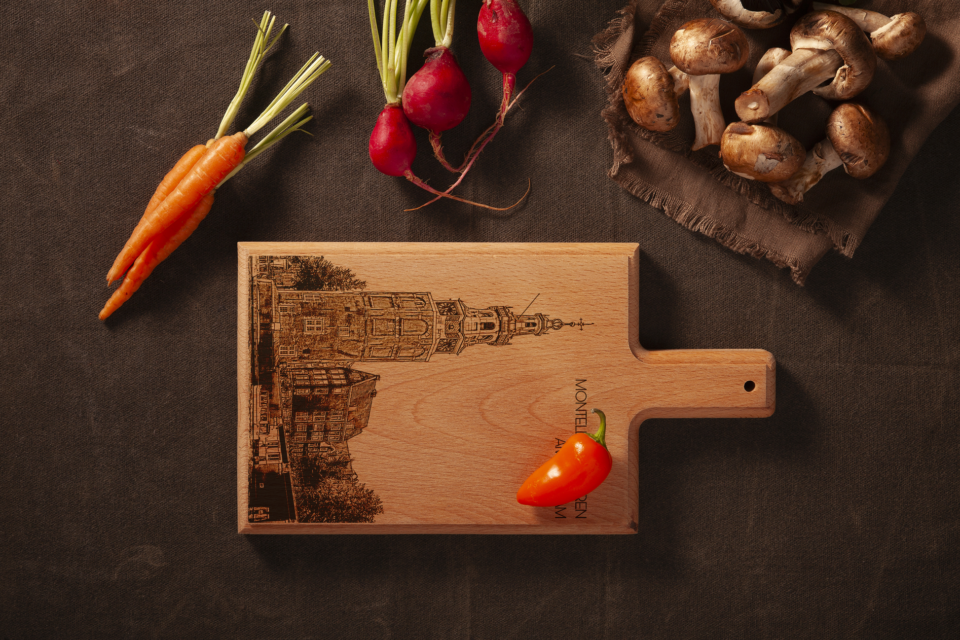 Inspired by the historic Montelbaanstoren tower in Amsterdam, this handcrafted cheese board captures a piece of Dutch history for your kitchen. Made from premium beech wood, it features a detailed, hand-drawn engraving of the iconic Montelbaanstoren, adding elegance to any occasion.