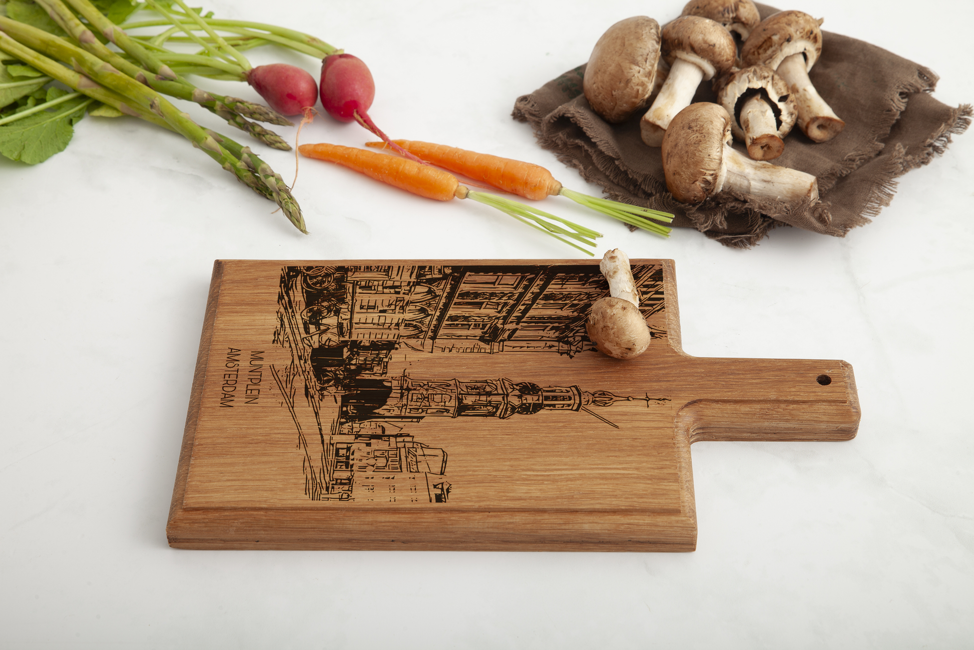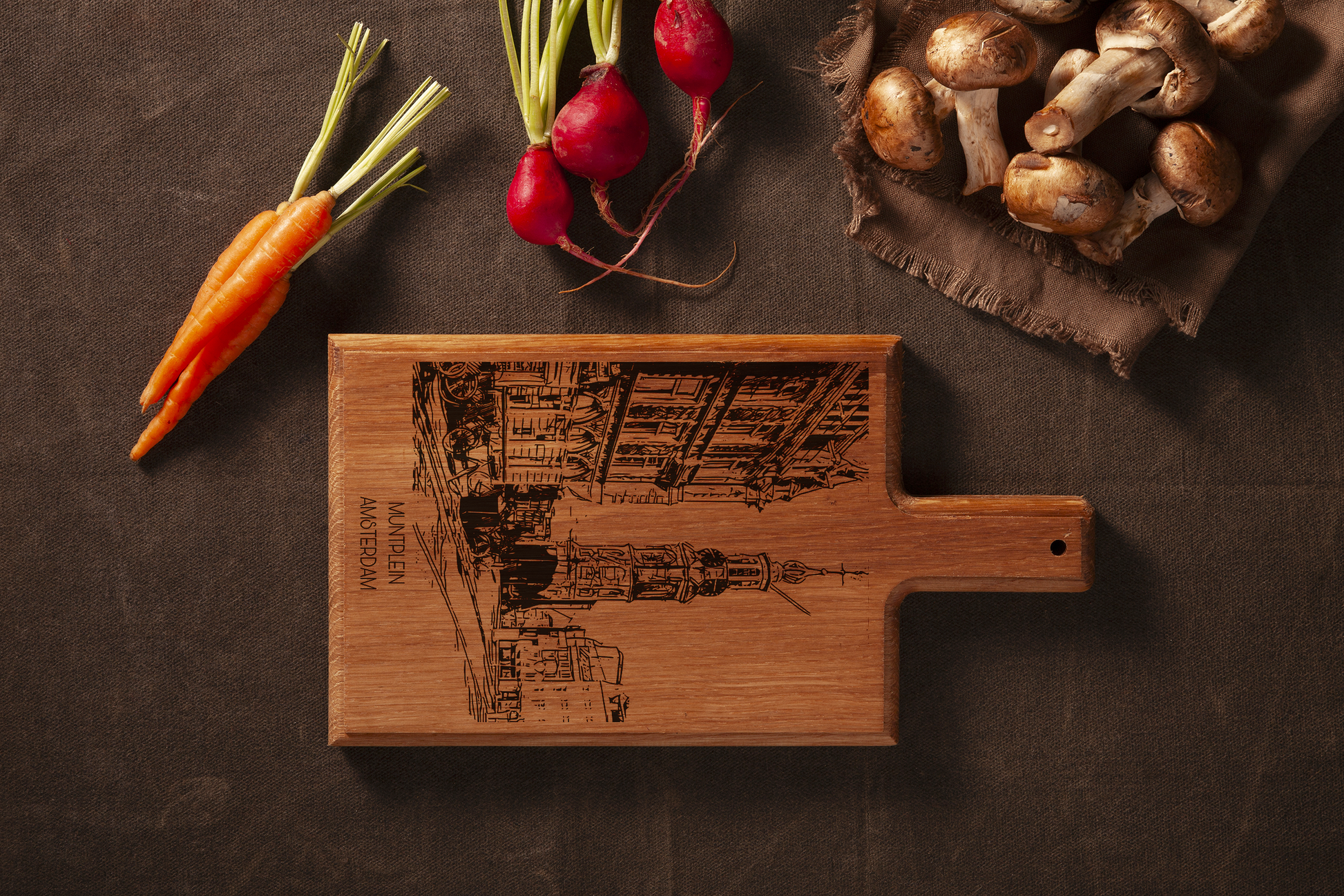 Inspired by the famous Muntplein in Amsterdam, this handcrafted cheese board captures the essence of Dutch history and architecture. Made from premium beech wood, it features a detailed, hand-drawn engraving of Muntplein, adding a unique touch to your kitchen or dining table.