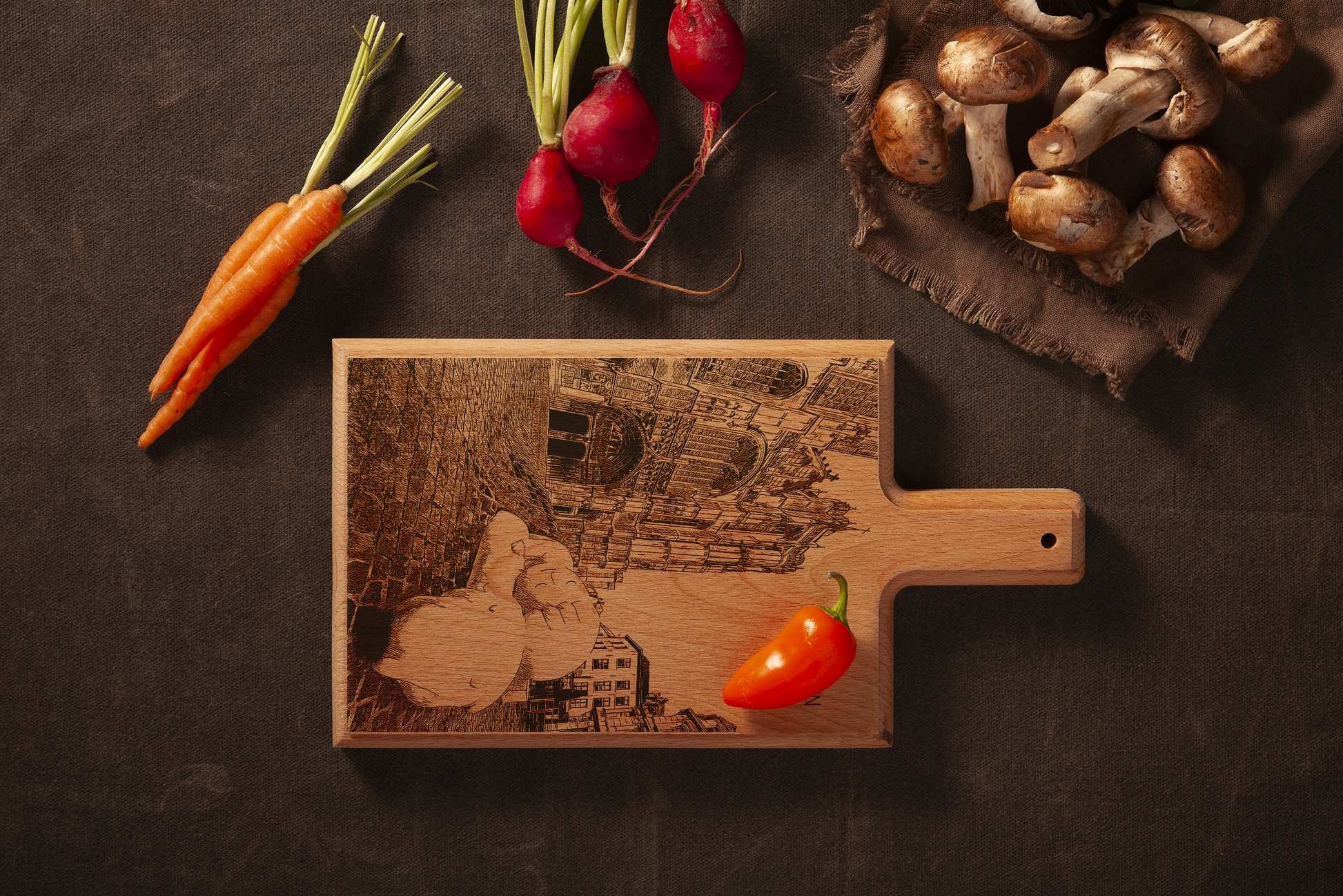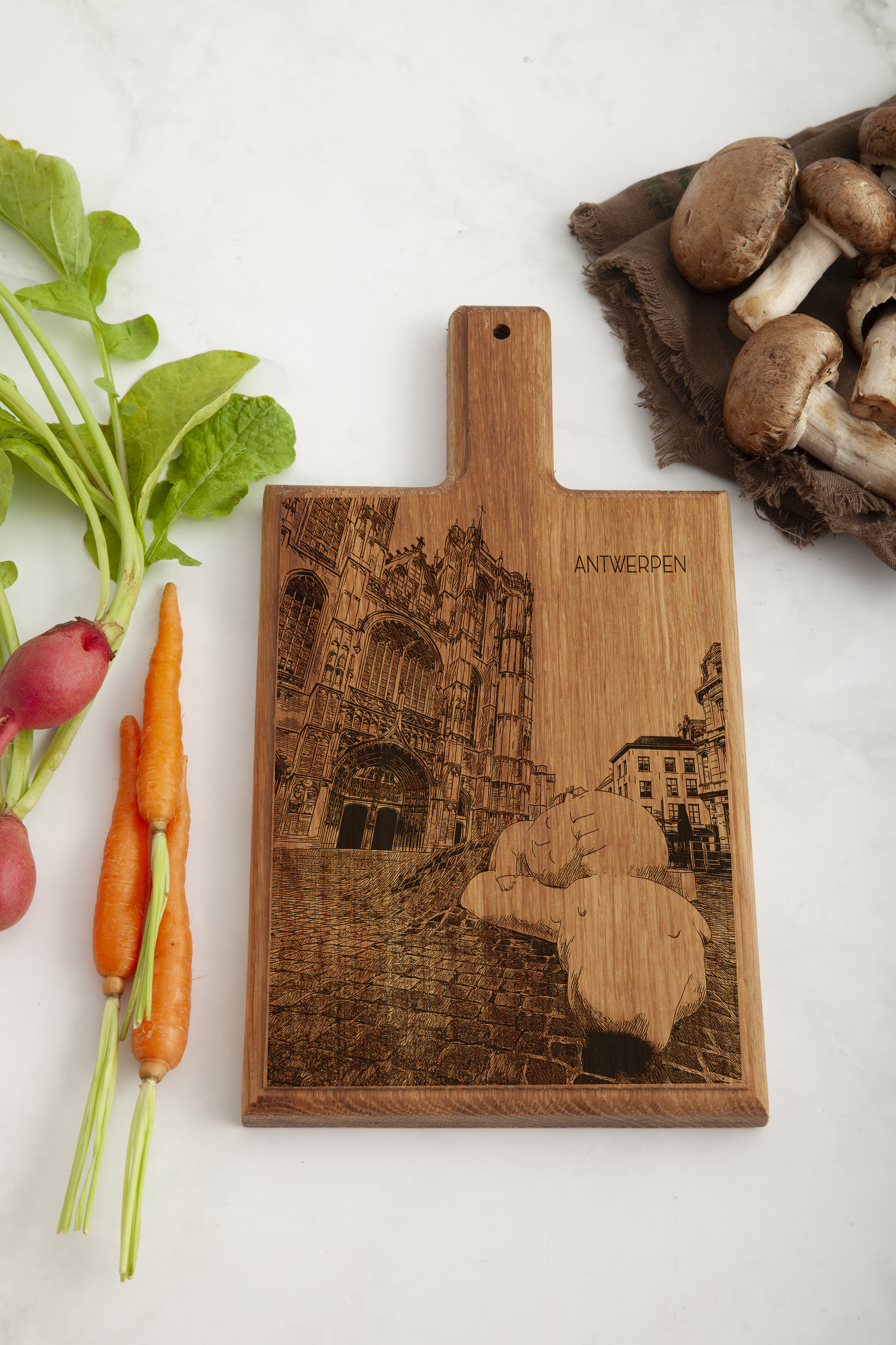 This handmade wooden cheese board features an original illustration inspired by Antwerp, carefully drawn and engraved in the Netherlands. Crafted from solid beech wood, this compact board reflects historic architecture, port-city heritage, and timeless craftsmanship.
