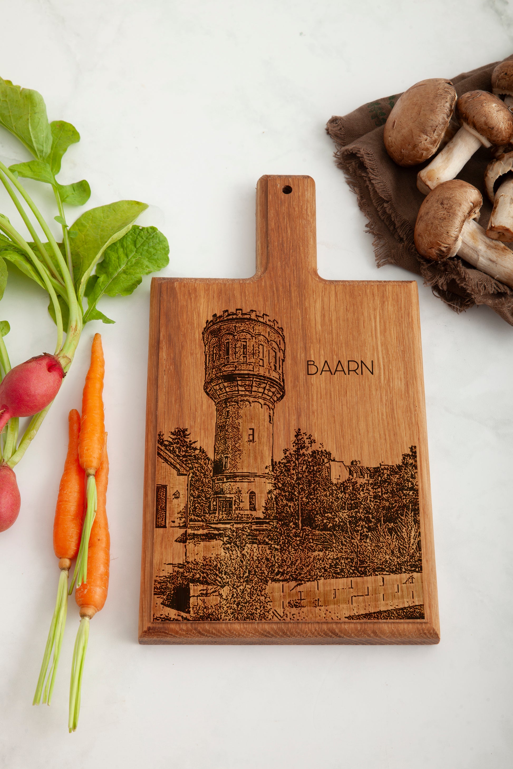 Each design is originally hand-drawn by the artist and then precisely laser-engraved into the wood. The illustration of the Baarn Watertoren, one of the town’s recognizable historic landmarks, captures the character and heritage of Baarn in a timeless and minimalist style.