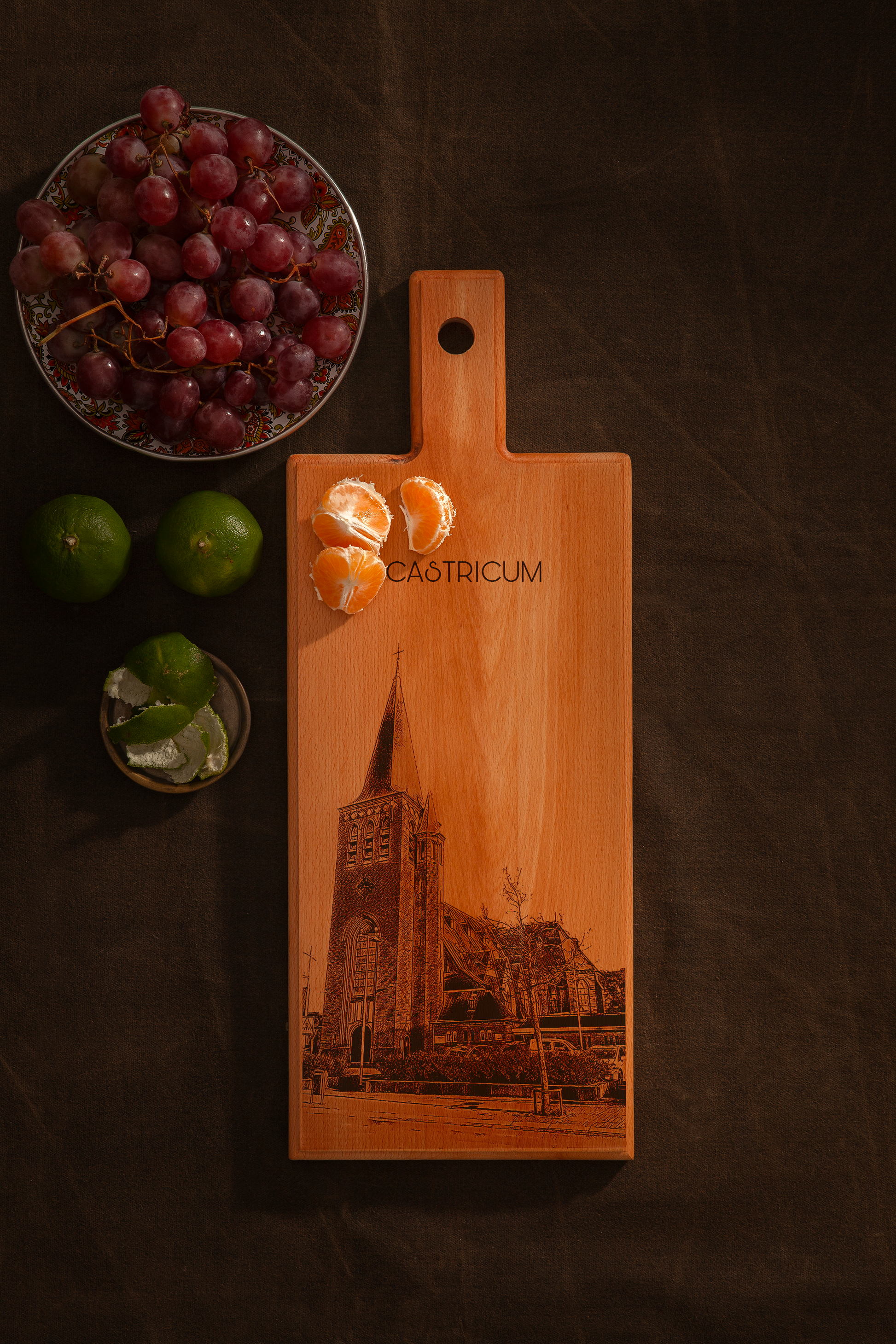 Bring the coastal village charm of Castricum into your kitchen with this handmade Castricum wooden serving board. Crafted in the Netherlands, this wooden serving board features a refined line-art illustration inspired by Castricum’s dunes, greenery, and relaxed village atmosphere near the North Sea. Designed to combine everyday functionality with calm elegance, it is perfect for serving, presenting, or decorative display.