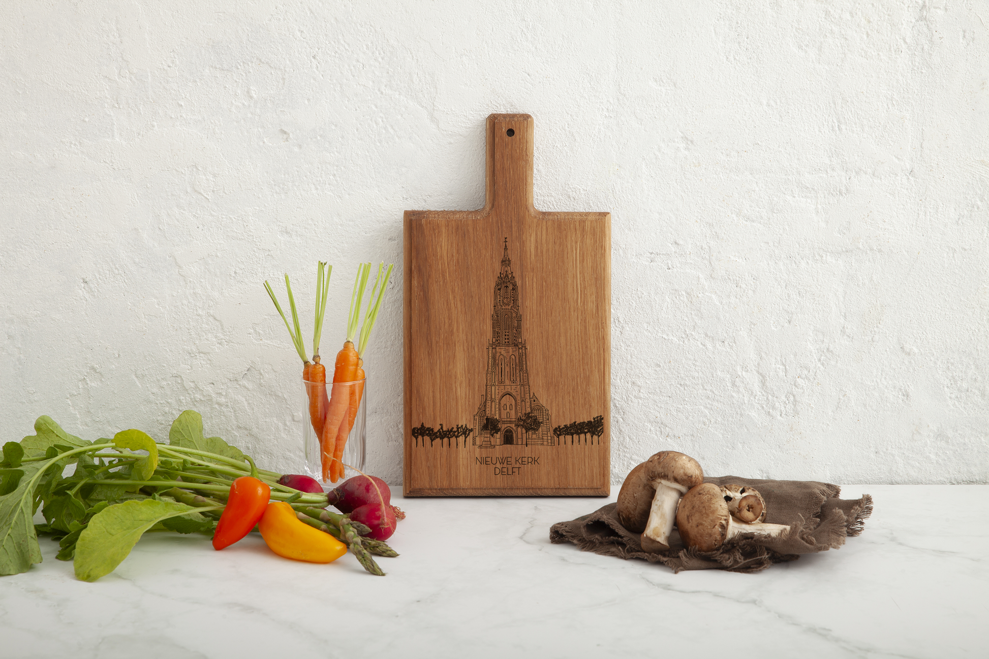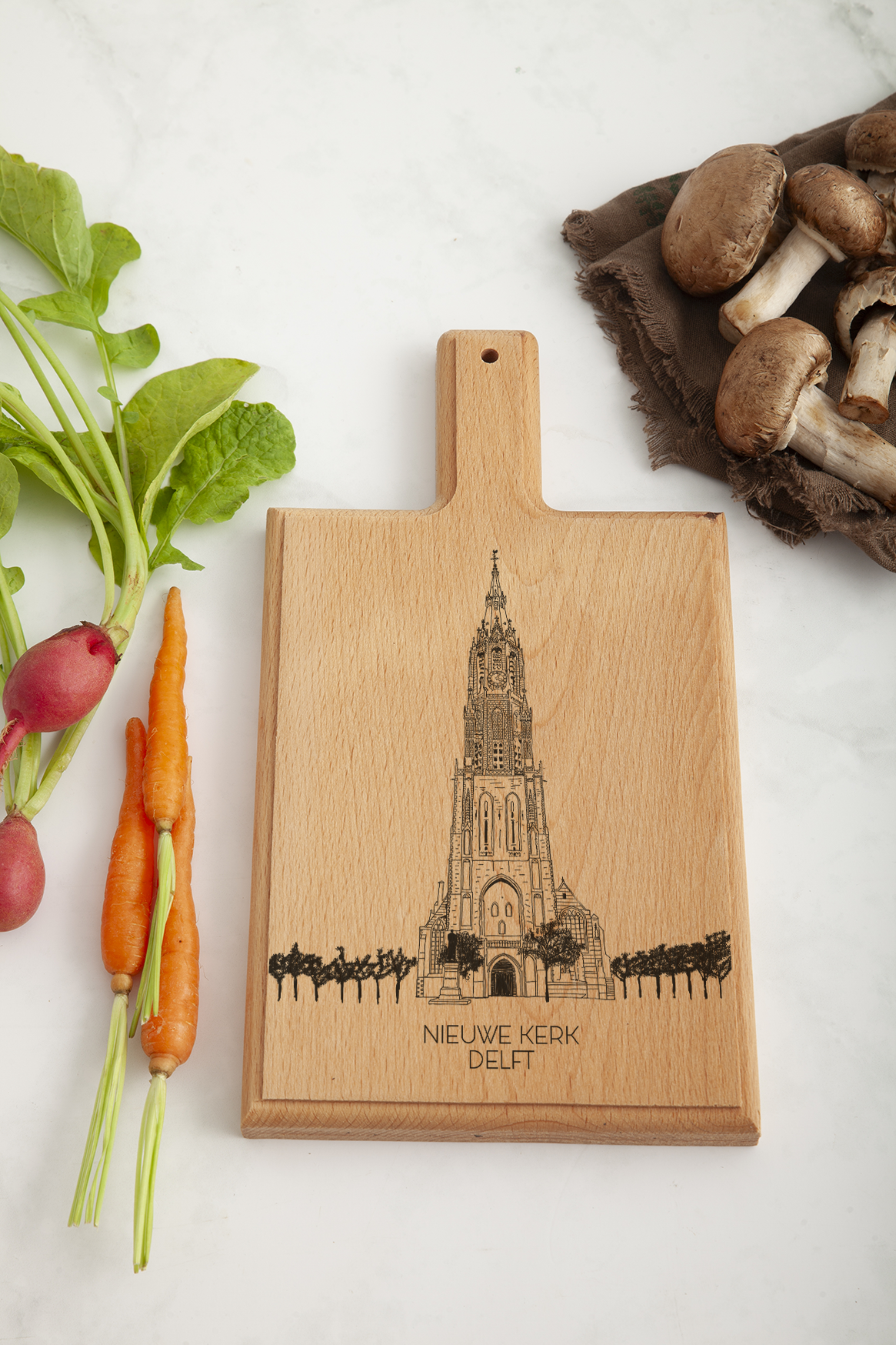 Immerse yourself in the charm of Delft with our beautifully crafted cheese board, showcasing an intricate engraving of the Nieuwe Kerk. Each board is handcrafted from high-quality beech wood and features our own original drawings, making it a unique piece of art that brings a touch of Dutch heritage to your home.