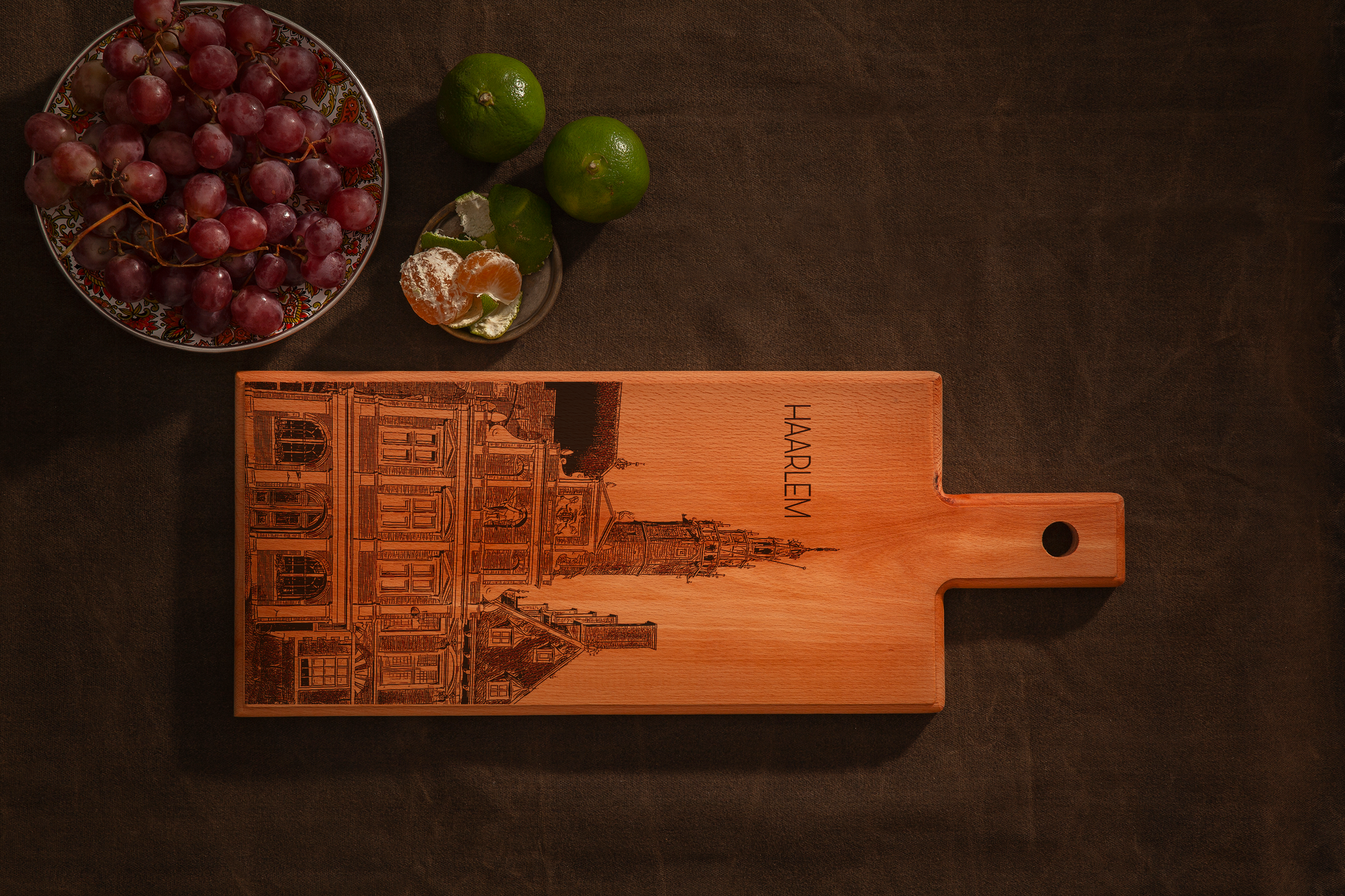 Bring the historic heart of Haarlem into your home with this Haarlem Stadhuis wooden serving board. Handmade in the Netherlands, this elegant wooden serving board features a finely engraved illustration of Haarlem Stadhuis, one of the city’s most iconic landmarks. Crafted from solid European beech wood, each board is individually made, sanded, and finished by hand, making every piece unique.