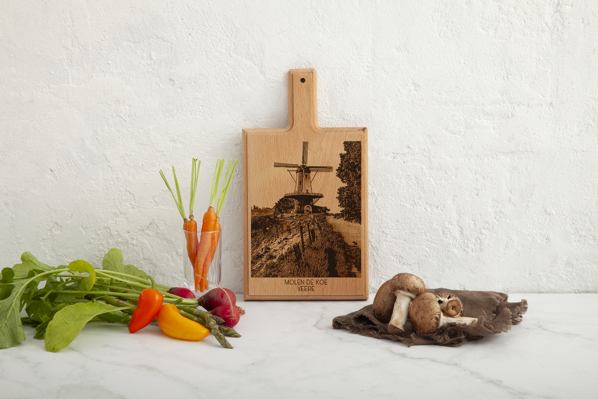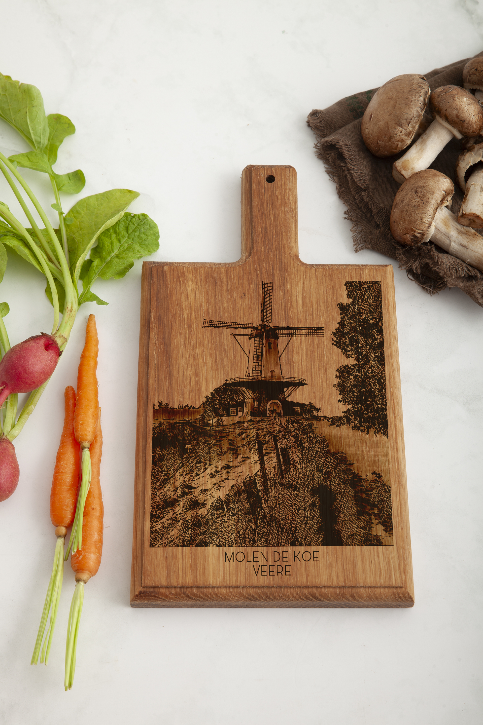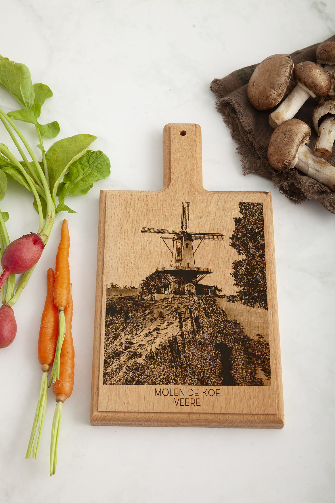 Celebrate the picturesque charm of Veere with our finely crafted cheese board, featuring an intricate engraving of Molen De Koe. Each board is meticulously handmade from premium beech wood, incorporating our original hand-drawn designs, ensuring a unique and exquisite piece for your kitchen.