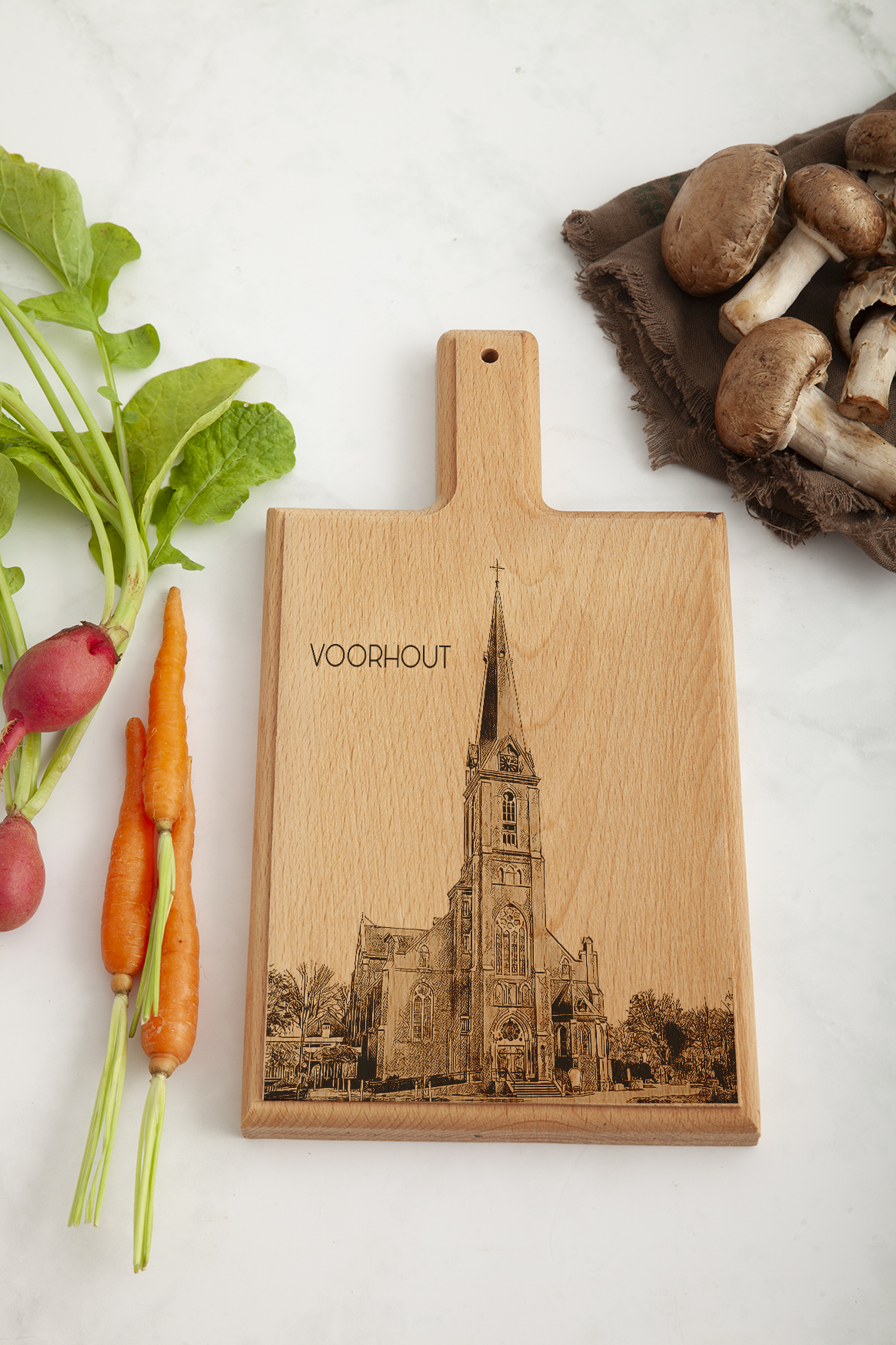 Celebrate the architectural beauty of Voorhout with our finely crafted cheese board, featuring an intricate engraving of the Sint-Bartholomeükerk. Each board is meticulously handmade from premium beech wood, incorporating our original hand-drawn designs, ensuring a unique and exquisite piece for your kitchen.