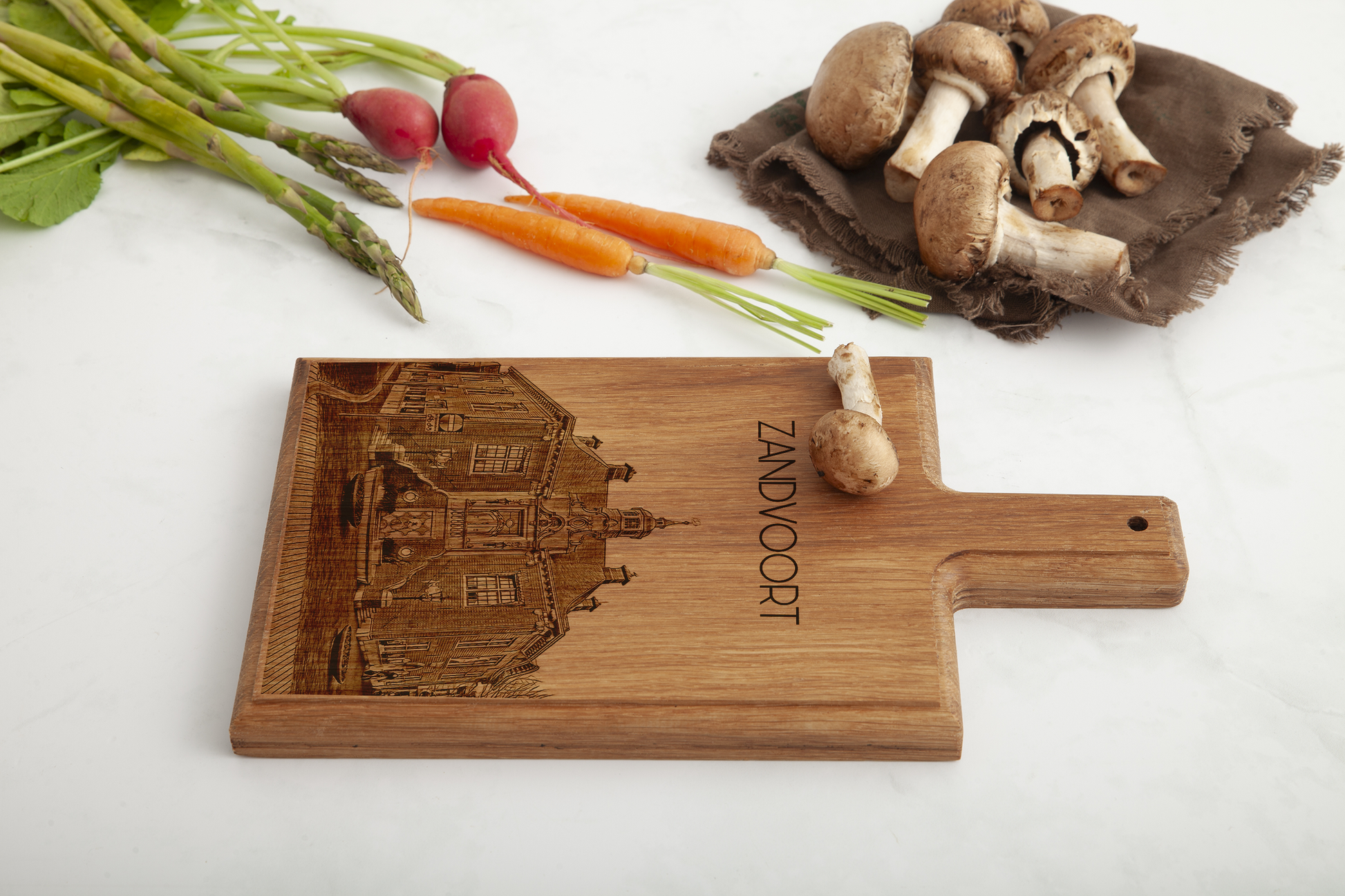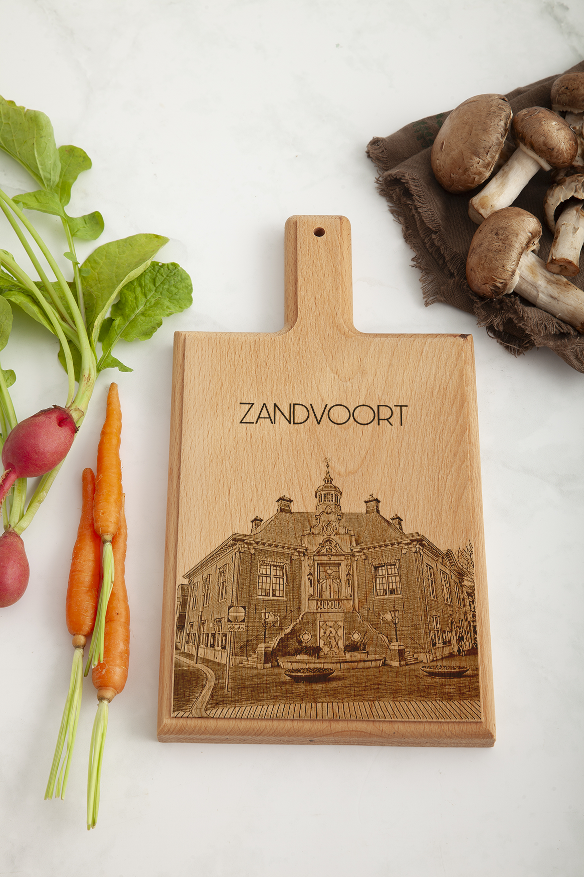 Celebrate the coastal charm of Zandvoort with our finely crafted cheese board, featuring an intricate engraving of this iconic seaside town. Each board is meticulously handmade from premium beech wood, incorporating our original hand-drawn designs, ensuring a unique and exquisite piece for your kitchen.