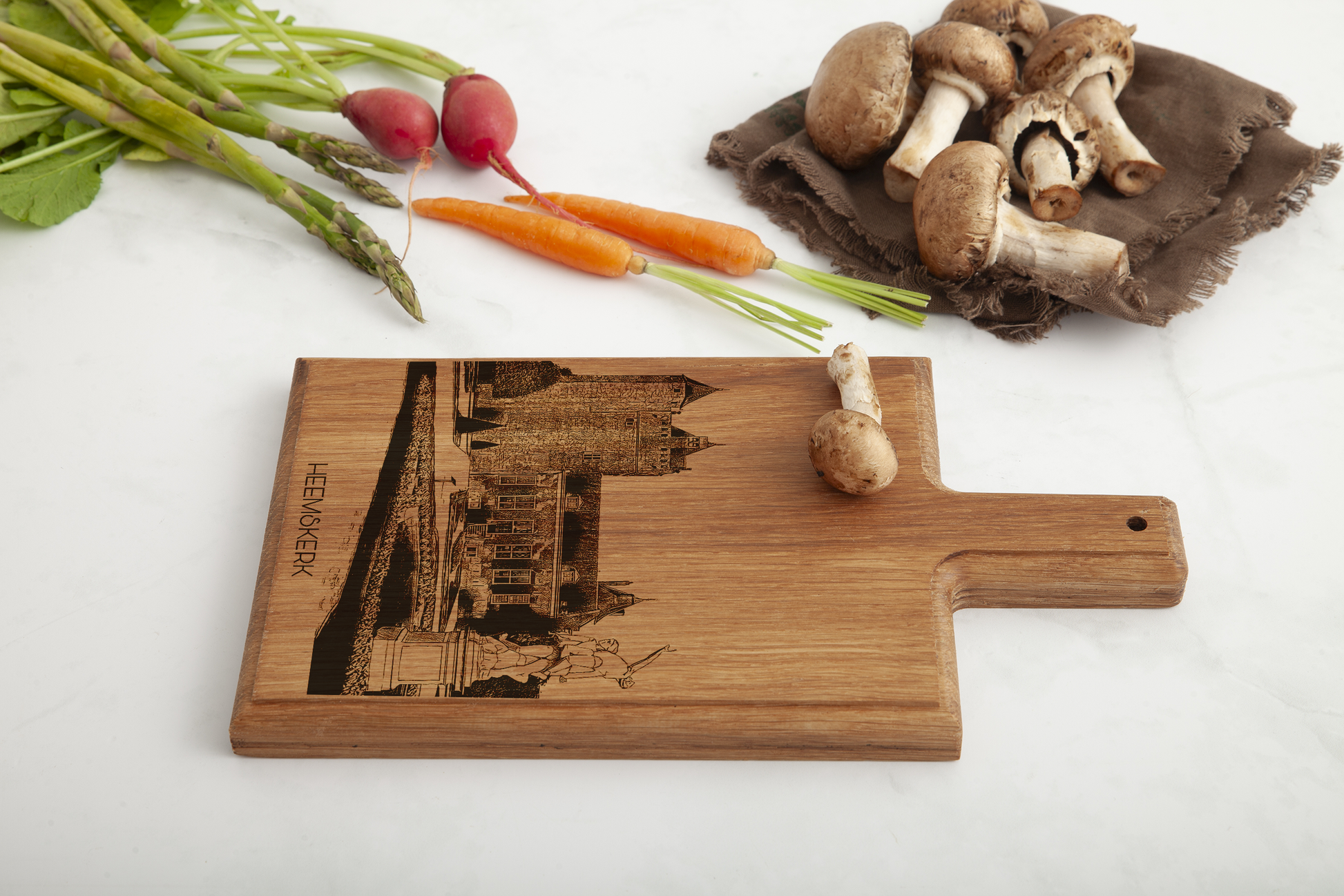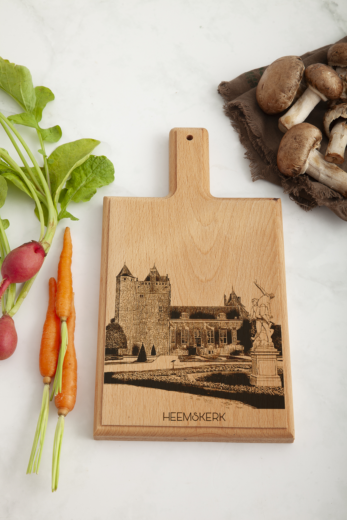 Inspired by the charming town of Heemskerk, this handcrafted cheese board brings Dutch village beauty to your kitchen. Made from premium beech wood, it features a detailed, hand-drawn engraving inspired by Heemskerk, adding a unique, sophisticated touch to any gathering.