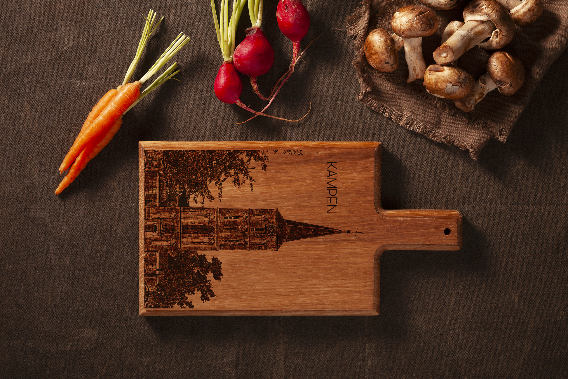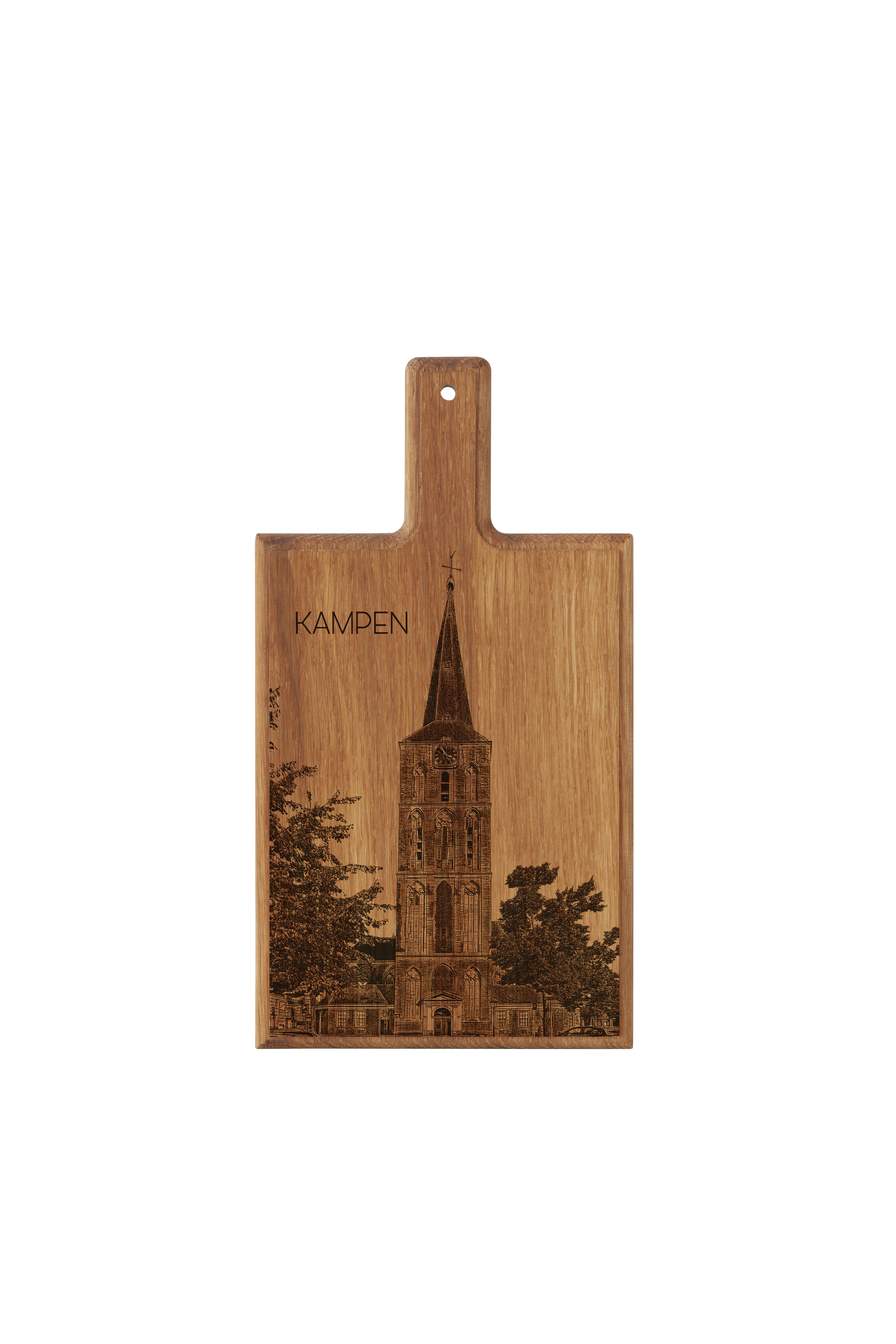 Bring the grandeur of historic Kampen into your kitchen with this handmade wooden serving board, featuring a finely engraved illustration of the iconic Bovenkerk.