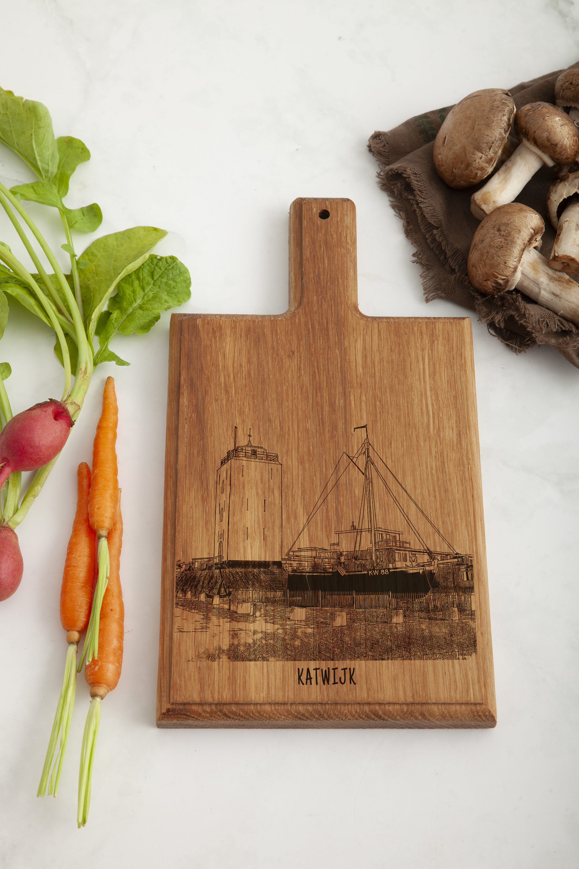 Celebrate the charm of Katwijk with our finely crafted cheese board, featuring an intricate engraving of the historic KW88 Katwijk. Each board is meticulously handmade from premium beech wood, incorporating our original hand-drawn designs, ensuring a unique and exquisite piece for your kitchen.