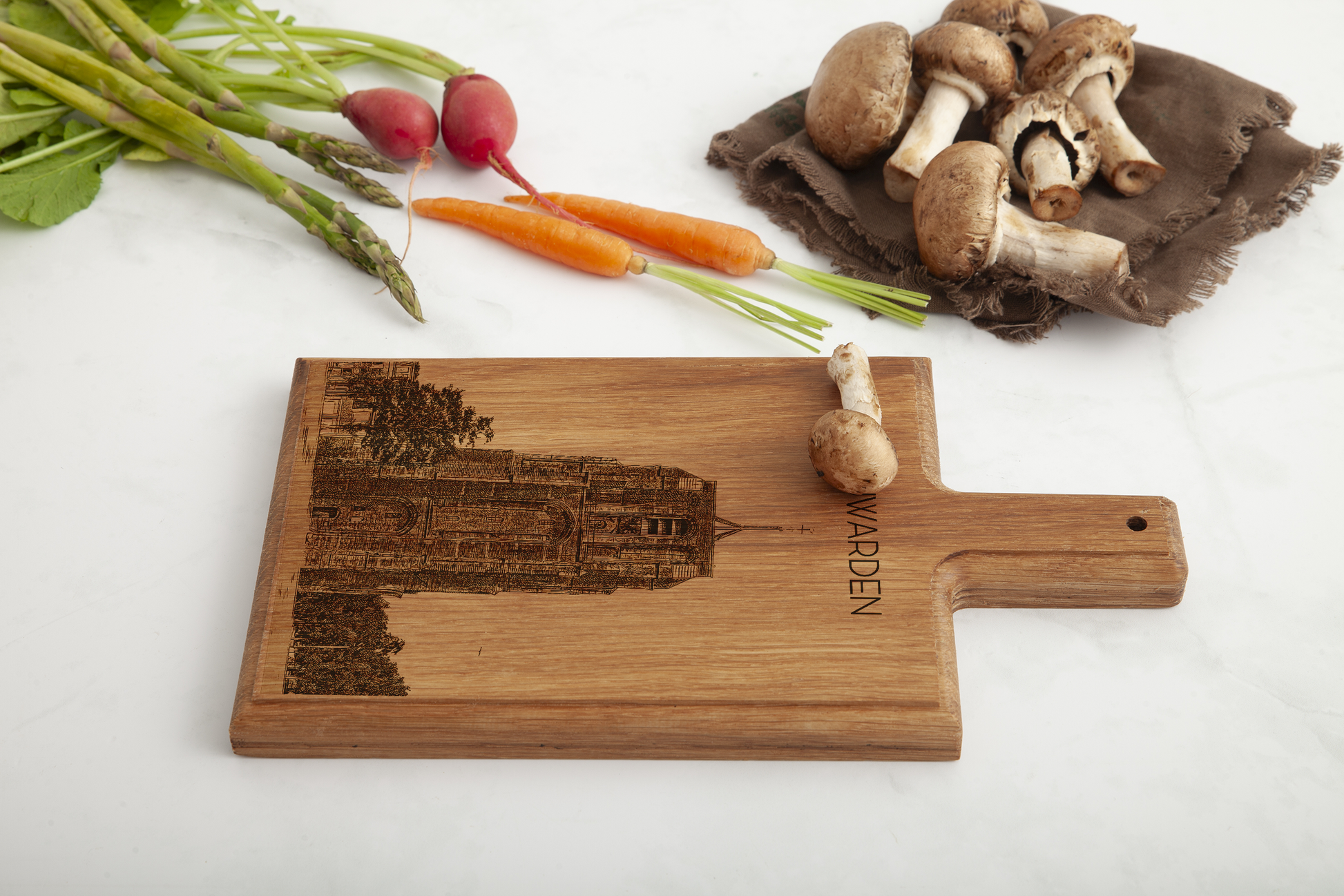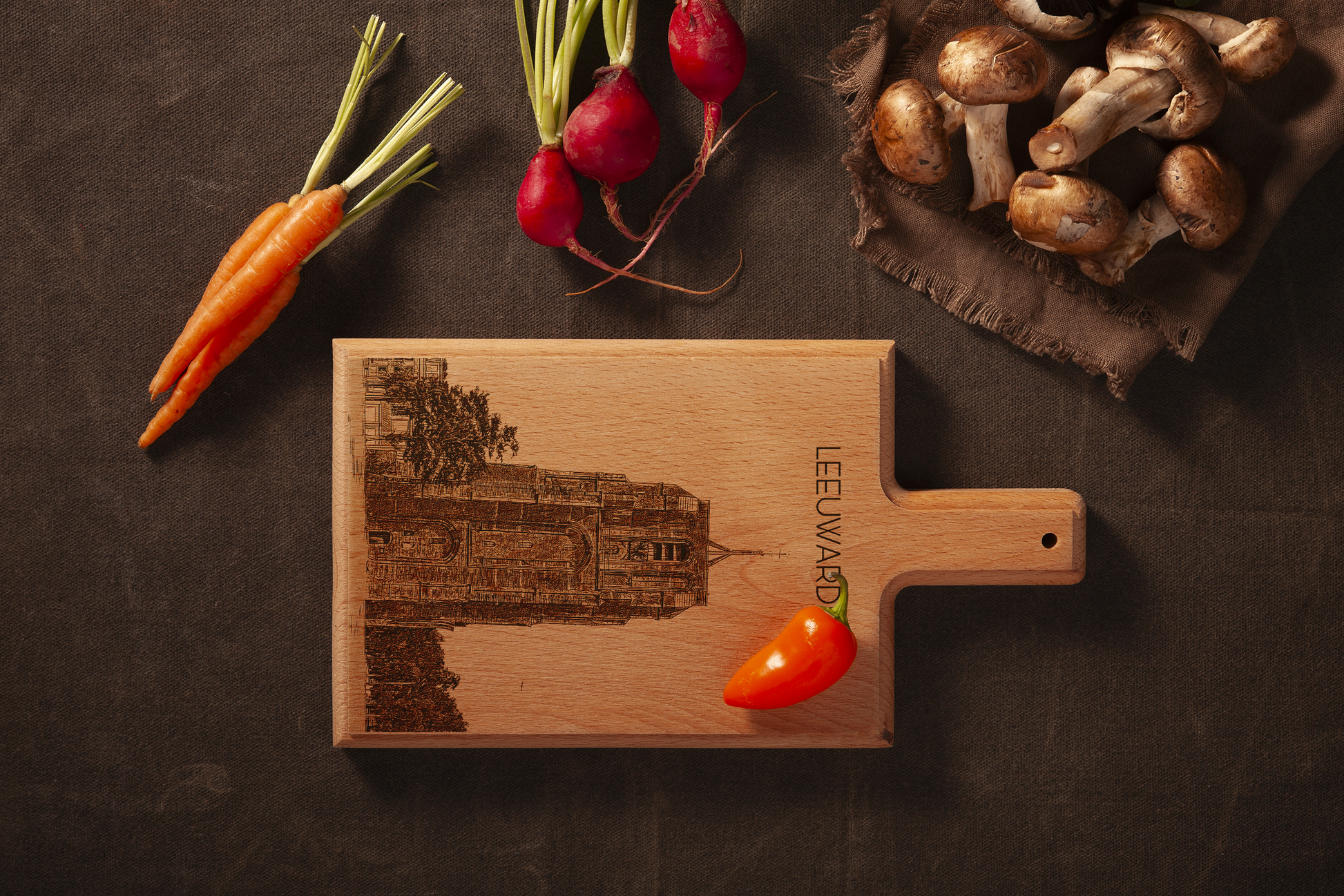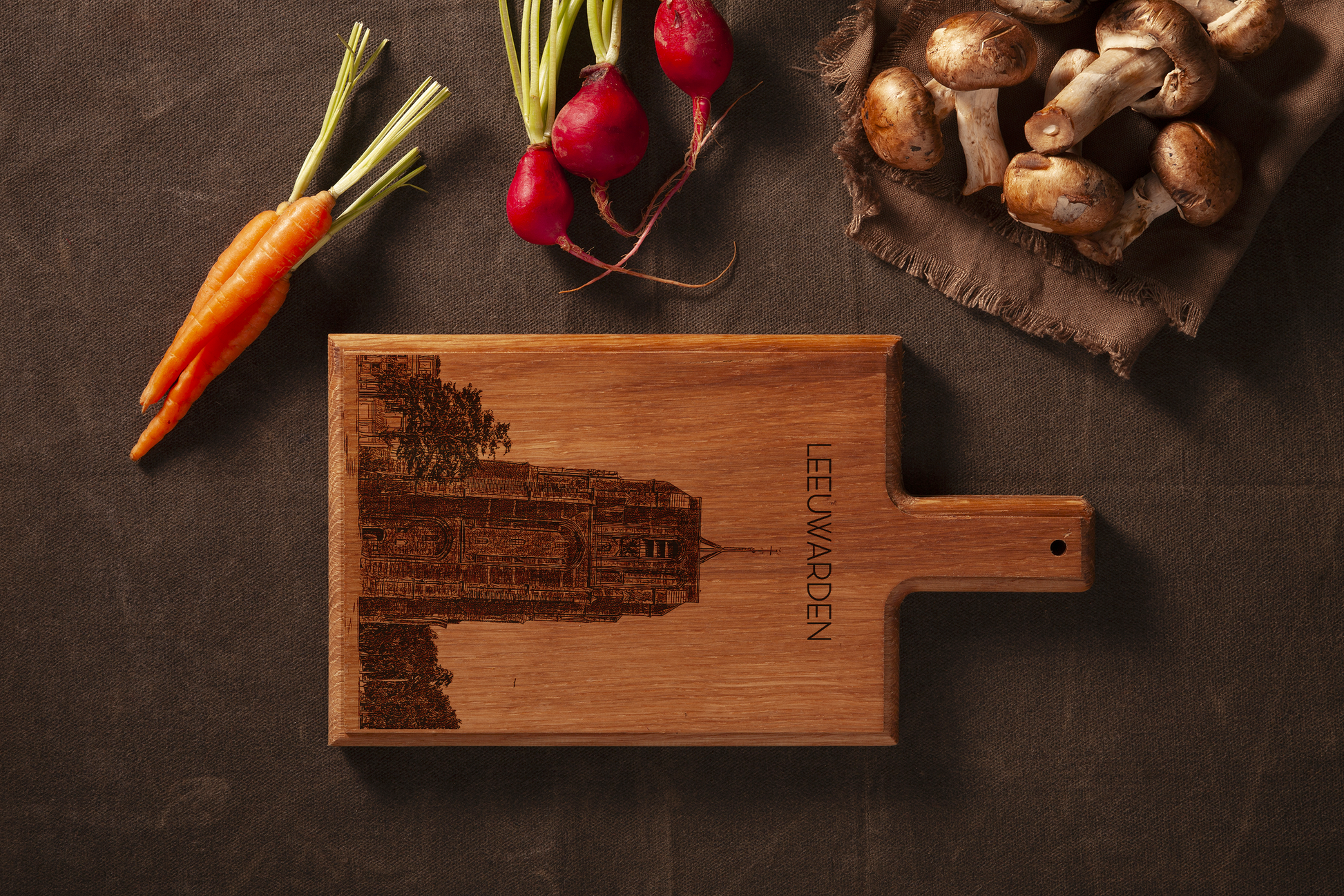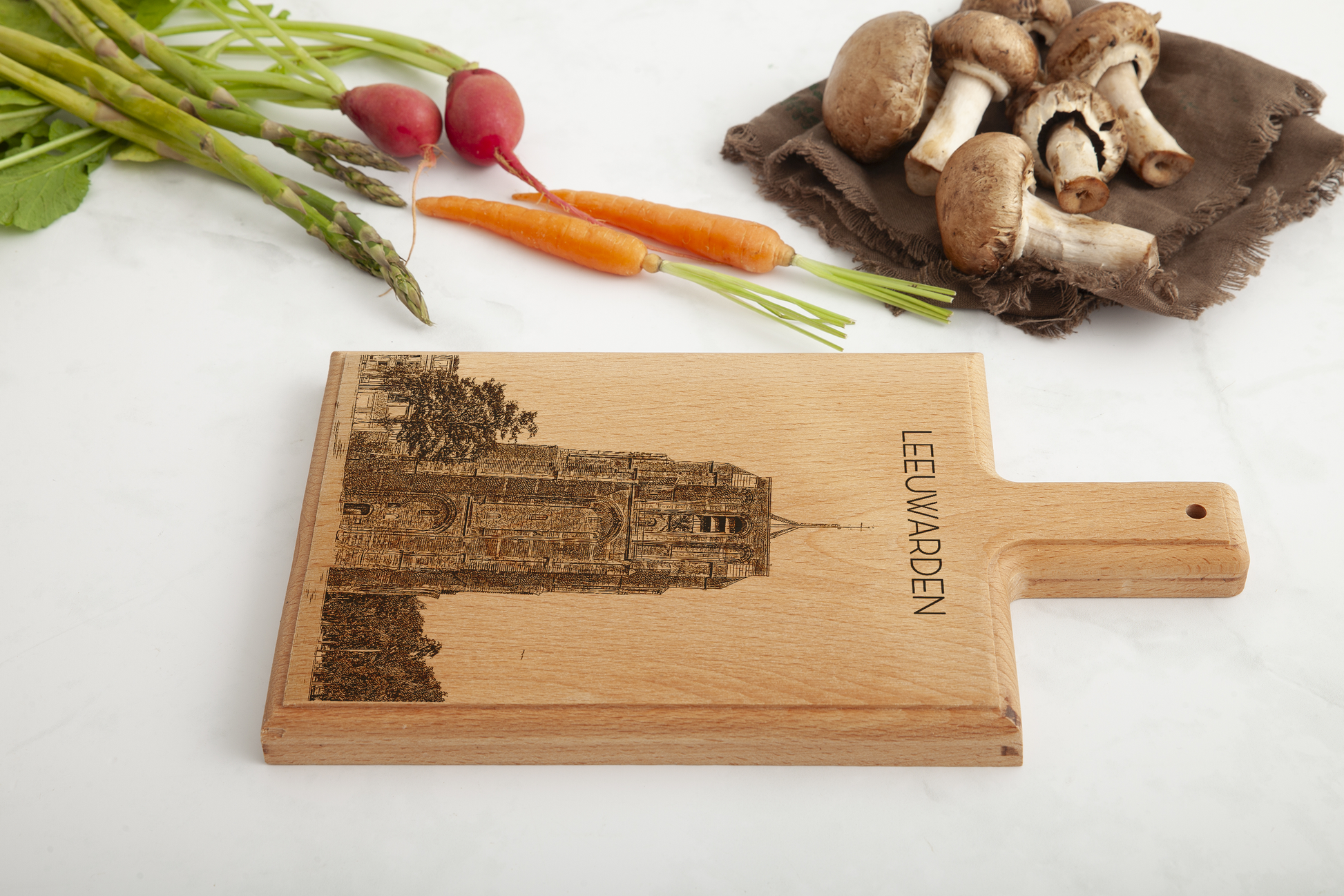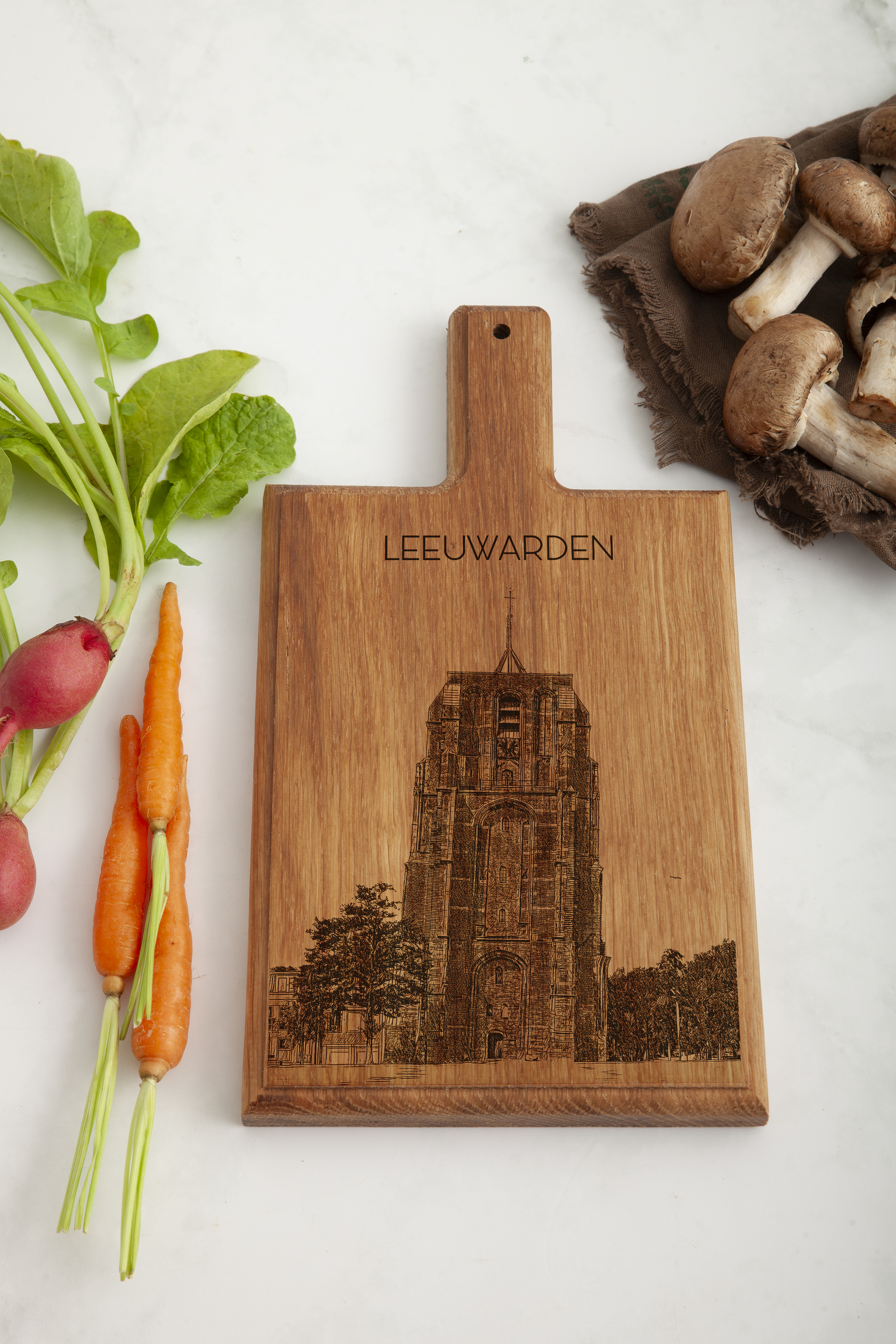 Crafted from one solid piece of European beechwood, this board showcases an original hand-drawn architectural illustration that is precisely laser-engraved into the wood. The distinctive leaning Oldehove tower combined with the historic presence of the Sint-Vituskerk creates a powerful and recognizable skyline of Leeuwarden.