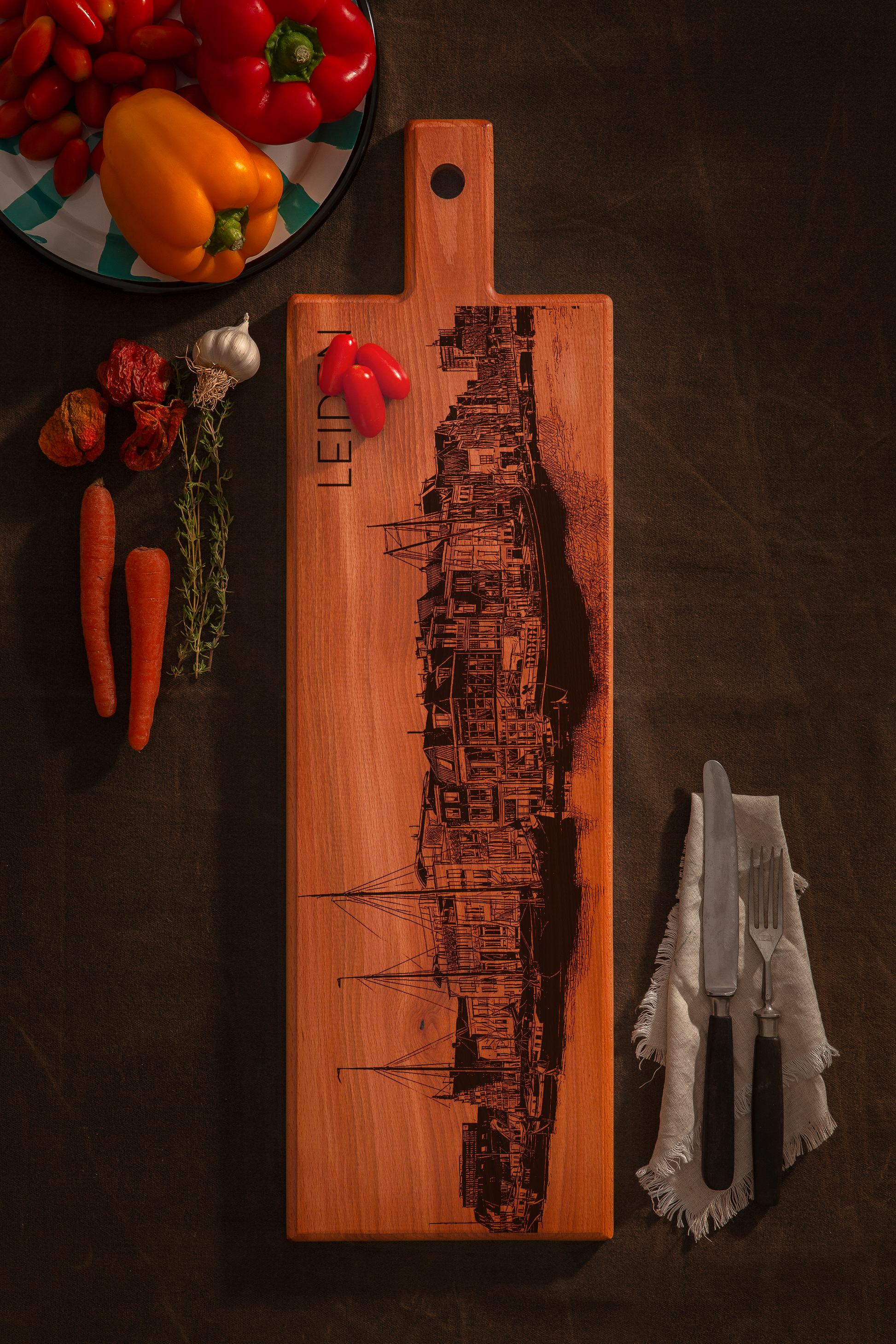 Celebrate the rich maritime heritage of Leiden with this handmade Leiden Historical Harbour wooden serving board. Crafted with care in the Netherlands, this wooden serving board features a detailed line-art illustration inspired by Leiden’s historic harbour, canals, and traditional waterfront architecture. Designed to combine everyday functionality with cultural character, it is perfect for serving, presenting, or decorative display.