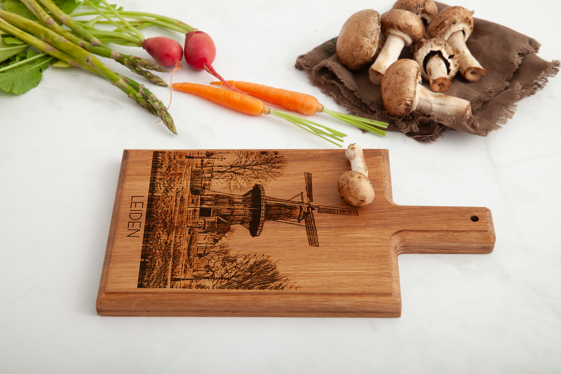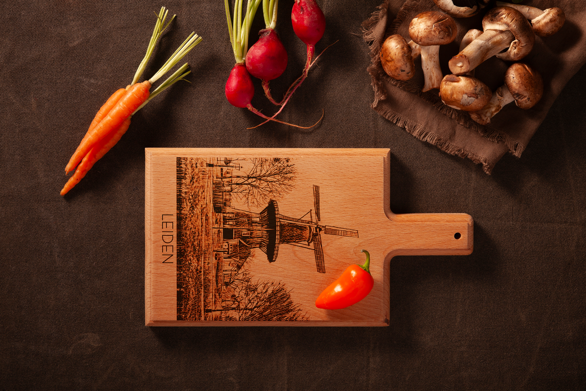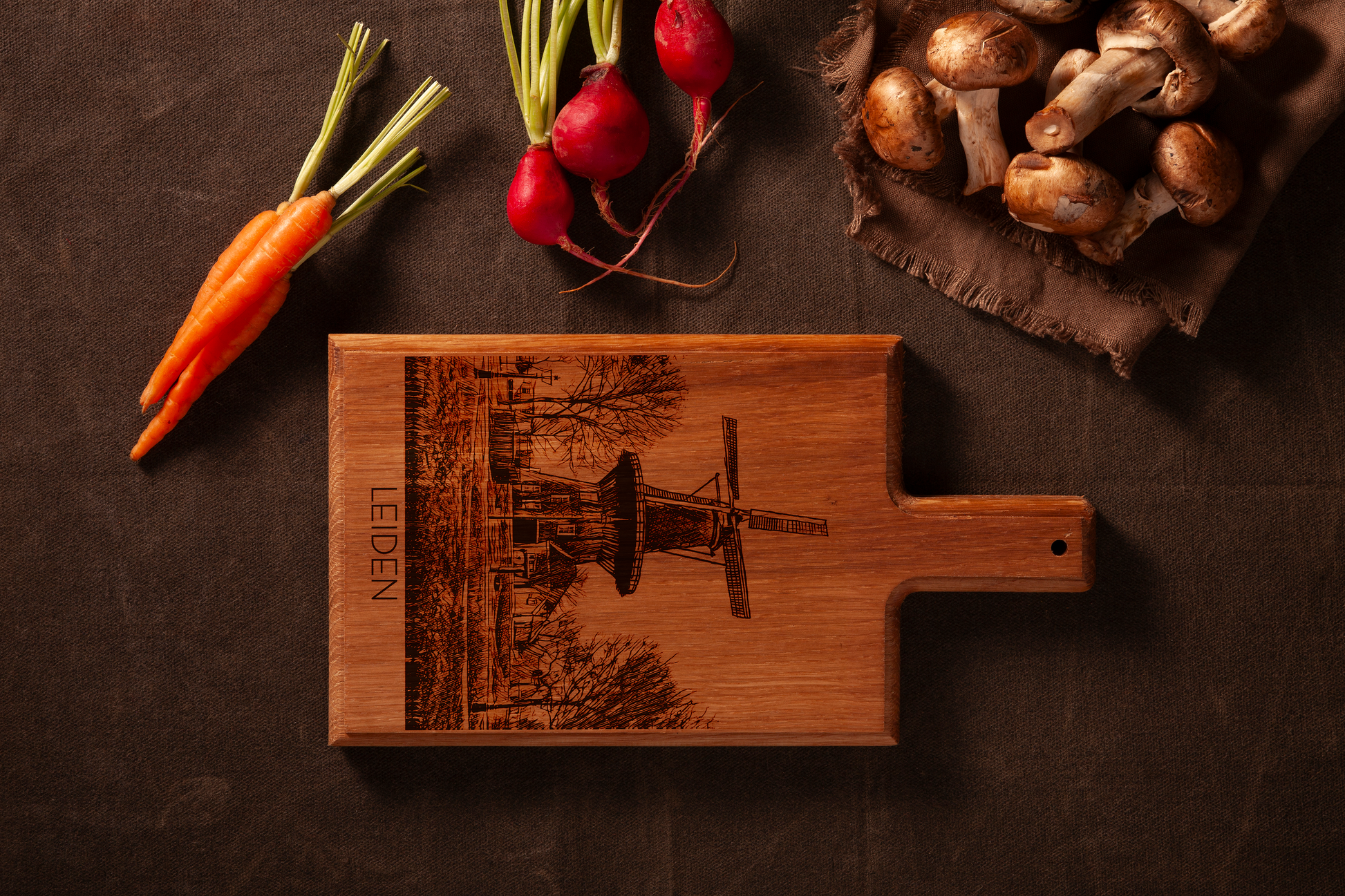 Celebrate the charm of Leiden with our finely crafted cheese board, featuring an intricate engraving of Molen De Valk. Each board is meticulously handmade from premium beech wood, incorporating our original hand-drawn designs, ensuring a unique and exquisite piece for your kitchen.
