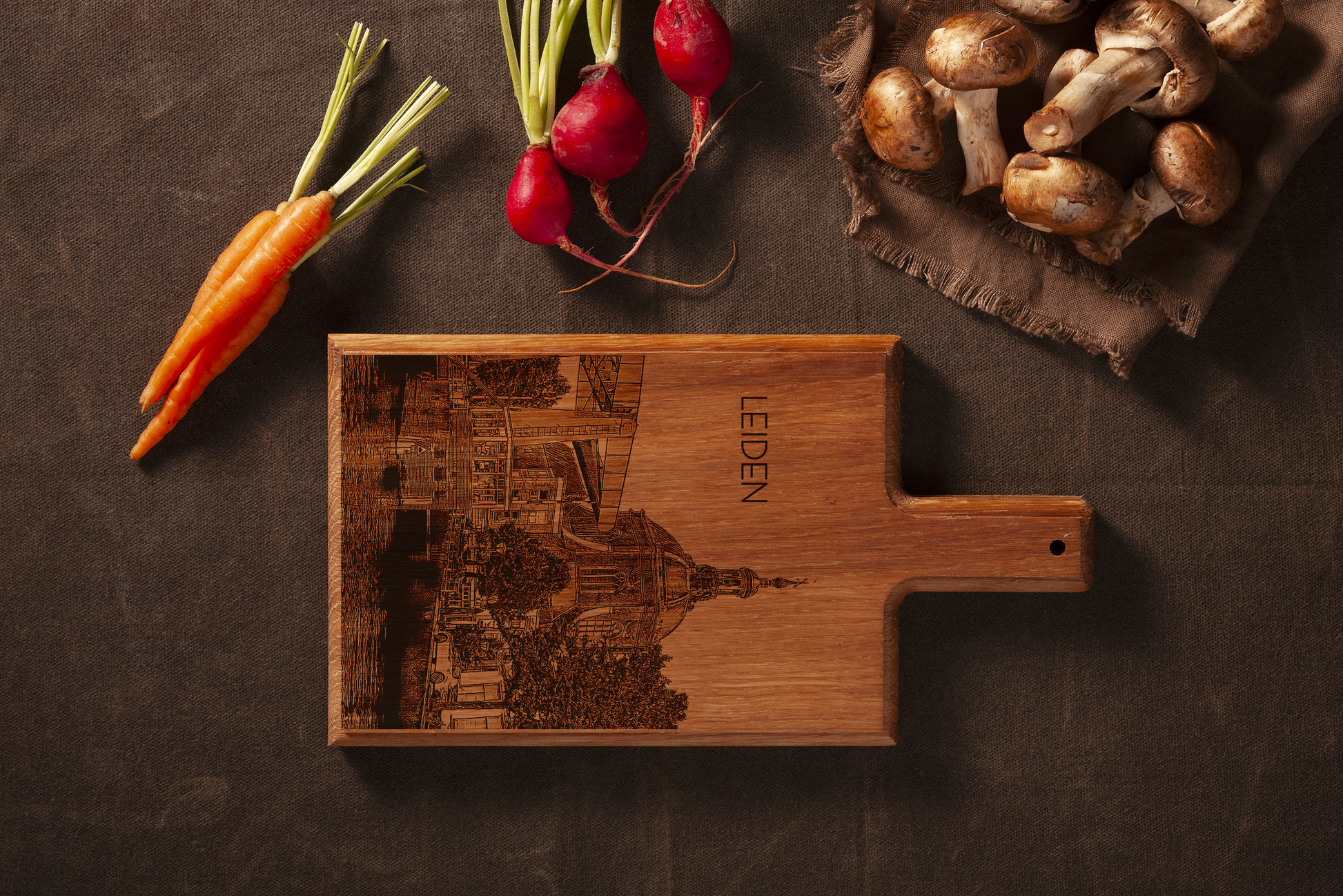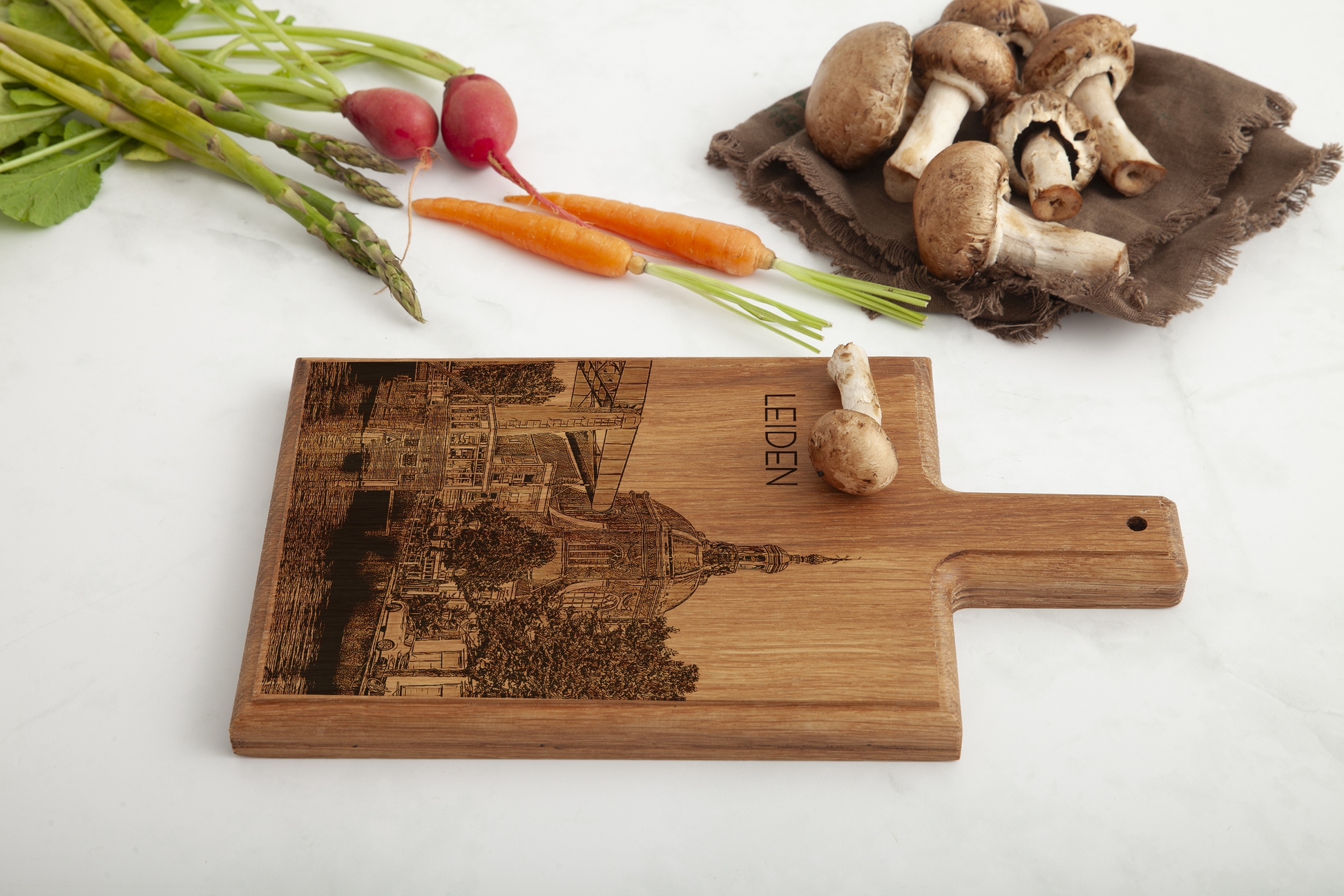 Bring the architectural elegance of Leiden into your kitchen with this handmade wooden serving board, featuring a finely engraved illustration of the iconic Marekerk.