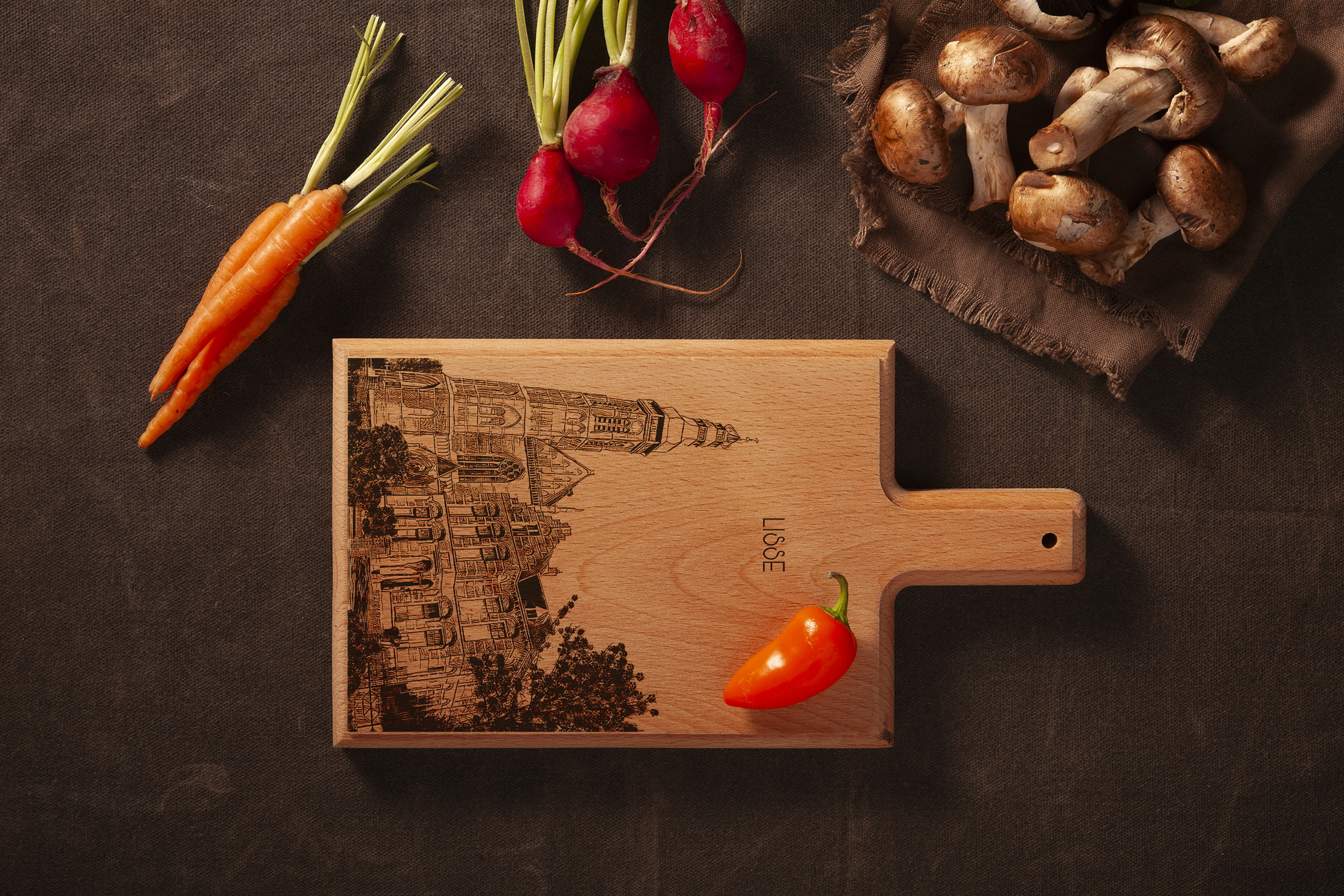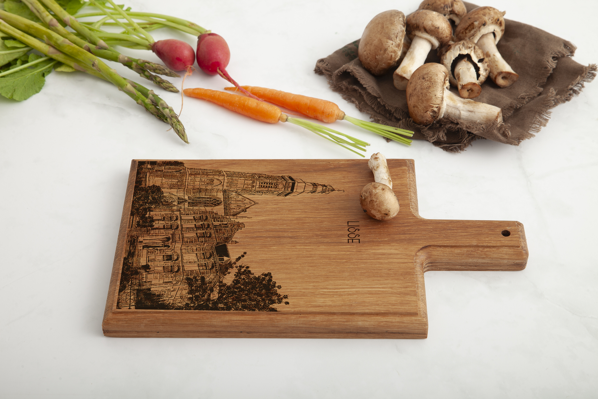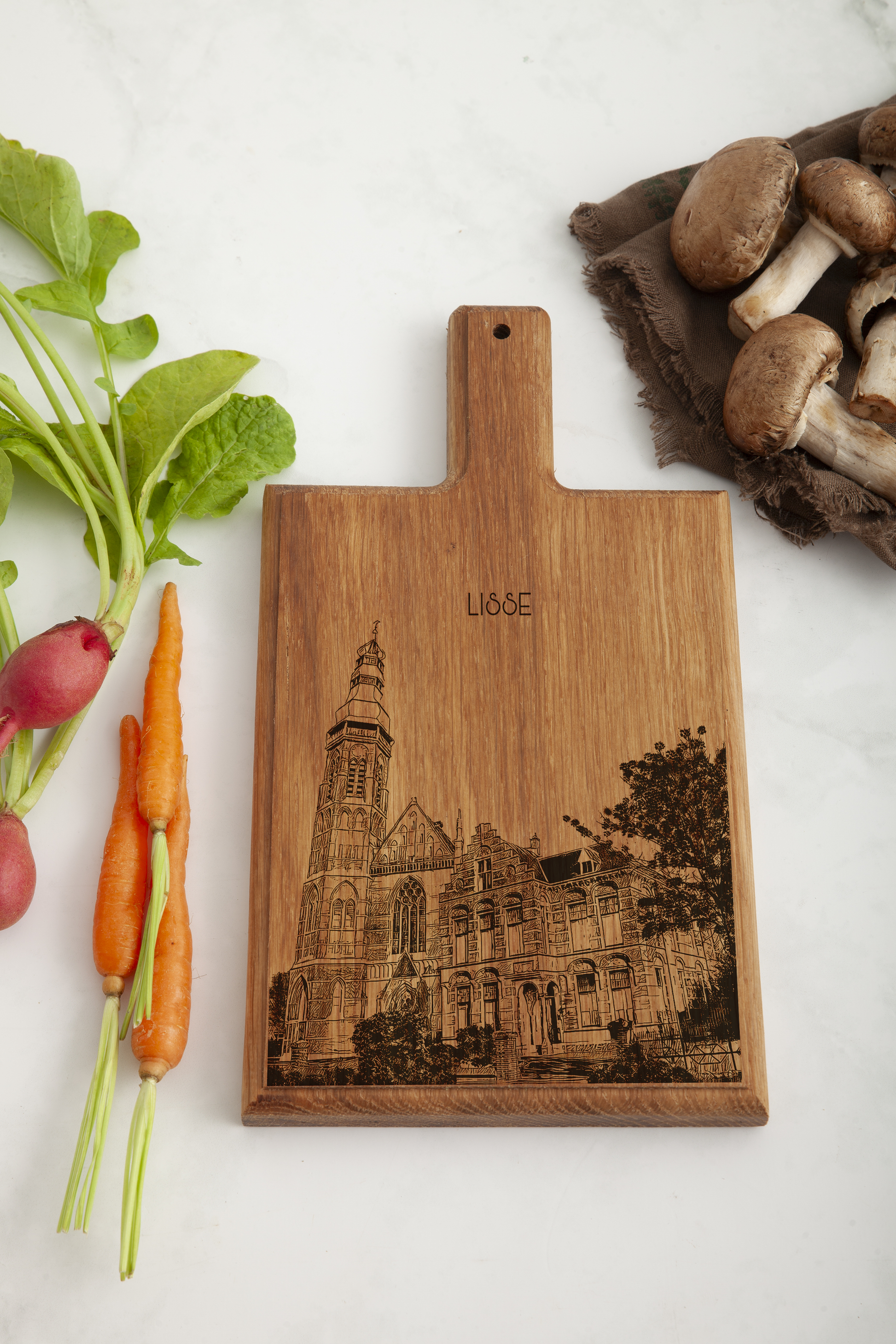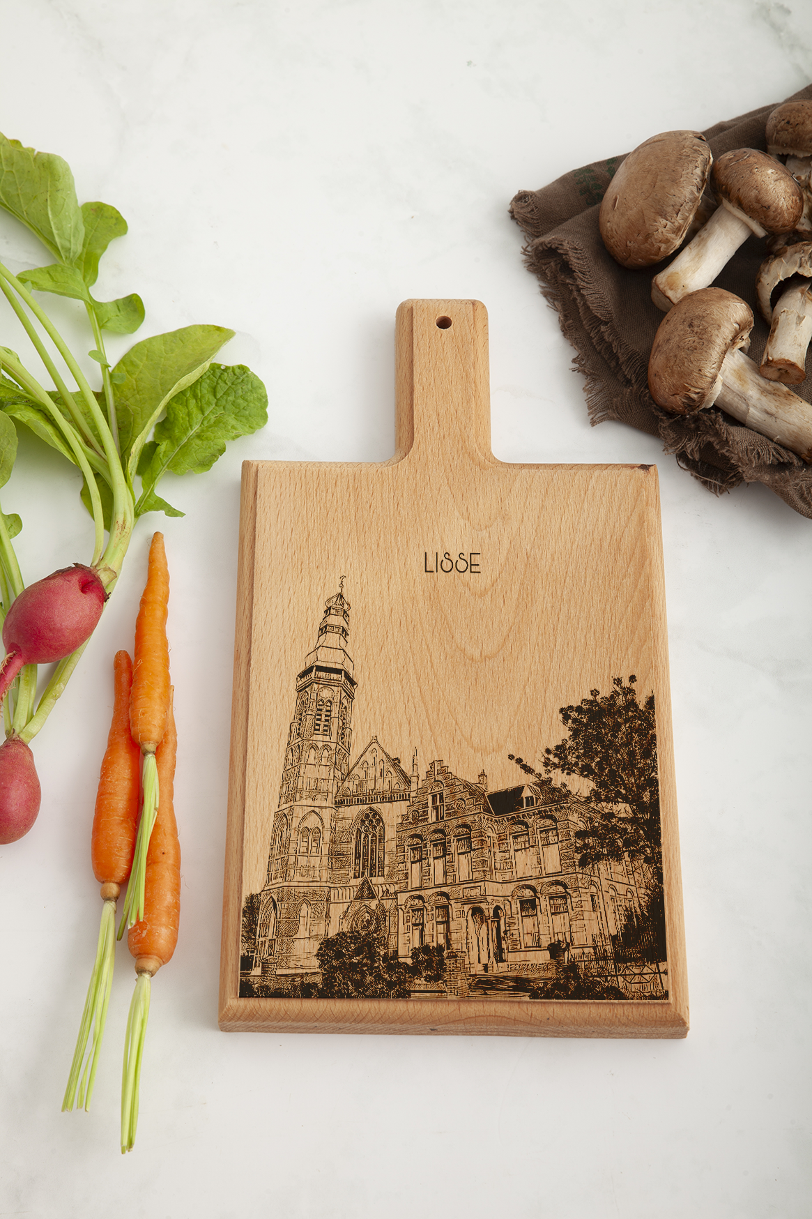 Inspired by the historic St. Agatha Kerk in Lisse, this handcrafted cheese board reflects the charm and heritage of this iconic church. Made from premium beech wood, it features a detailed, hand-drawn engraving of the St. Agatha Kerk, adding elegance to any gathering.