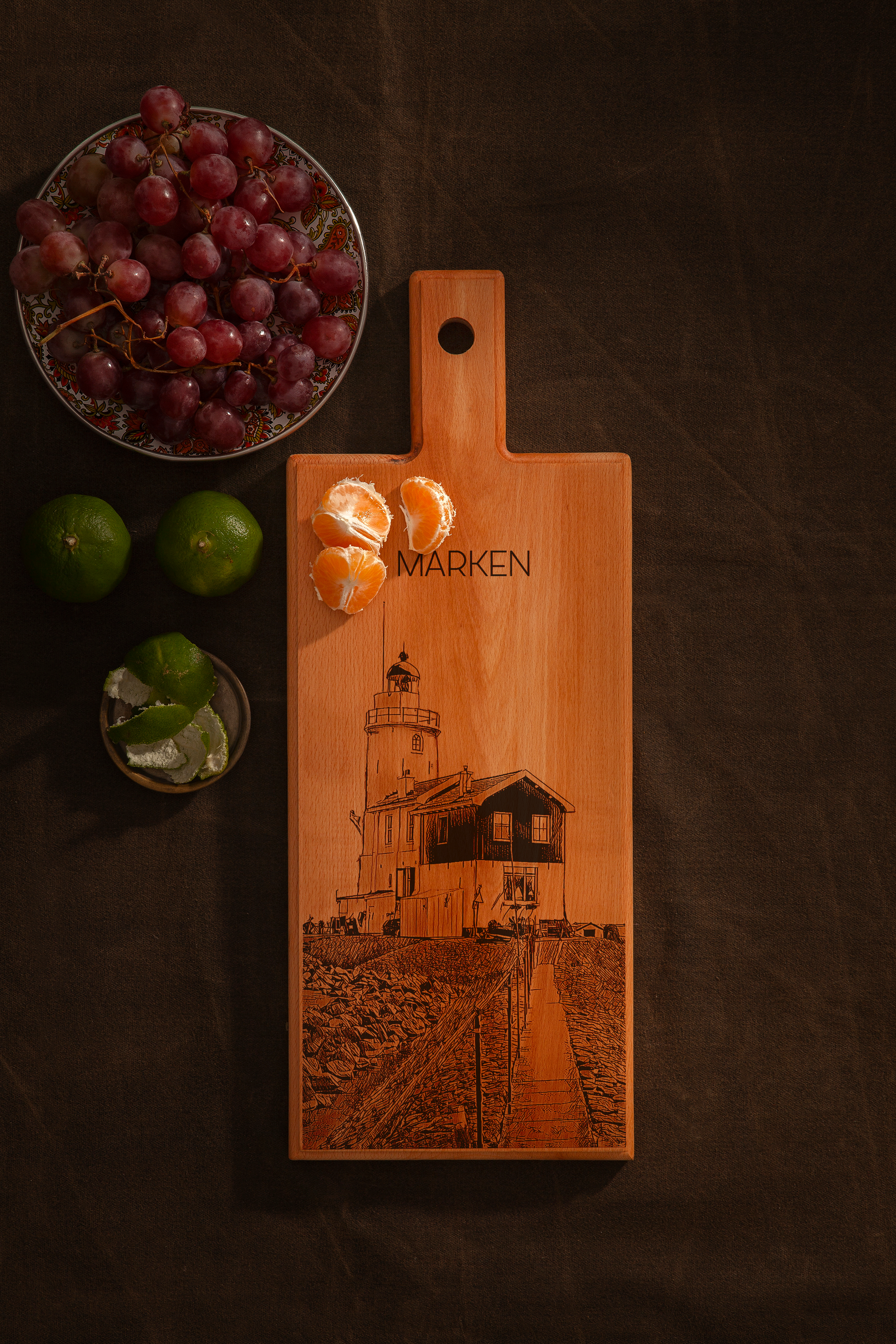 Each board is individually handmade and engraved, making every piece unique. The detailed lighthouse illustration captures the iconic silhouette of Marken and transforms this board into a meaningful keepsake or refined decorative accent inspired by the Dutch coast.