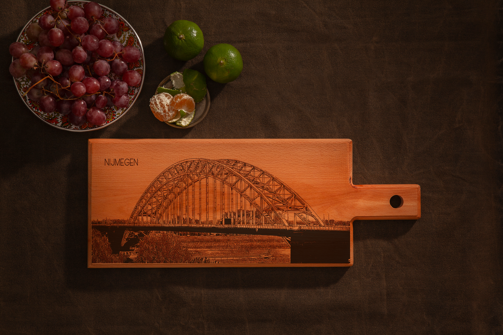 Each board is individually handmade and engraved, making every piece unique. The iconic steel arch of the Waalbrug symbolizes Nijmegen’s connection across the river Waal and transforms this board into a meaningful keepsake or refined decorative accent linked to one of the oldest cities in the Netherlands.