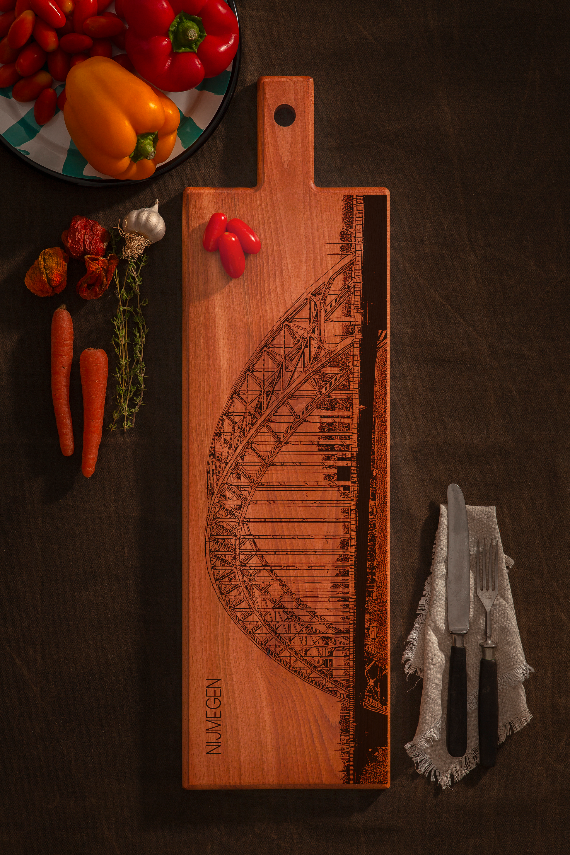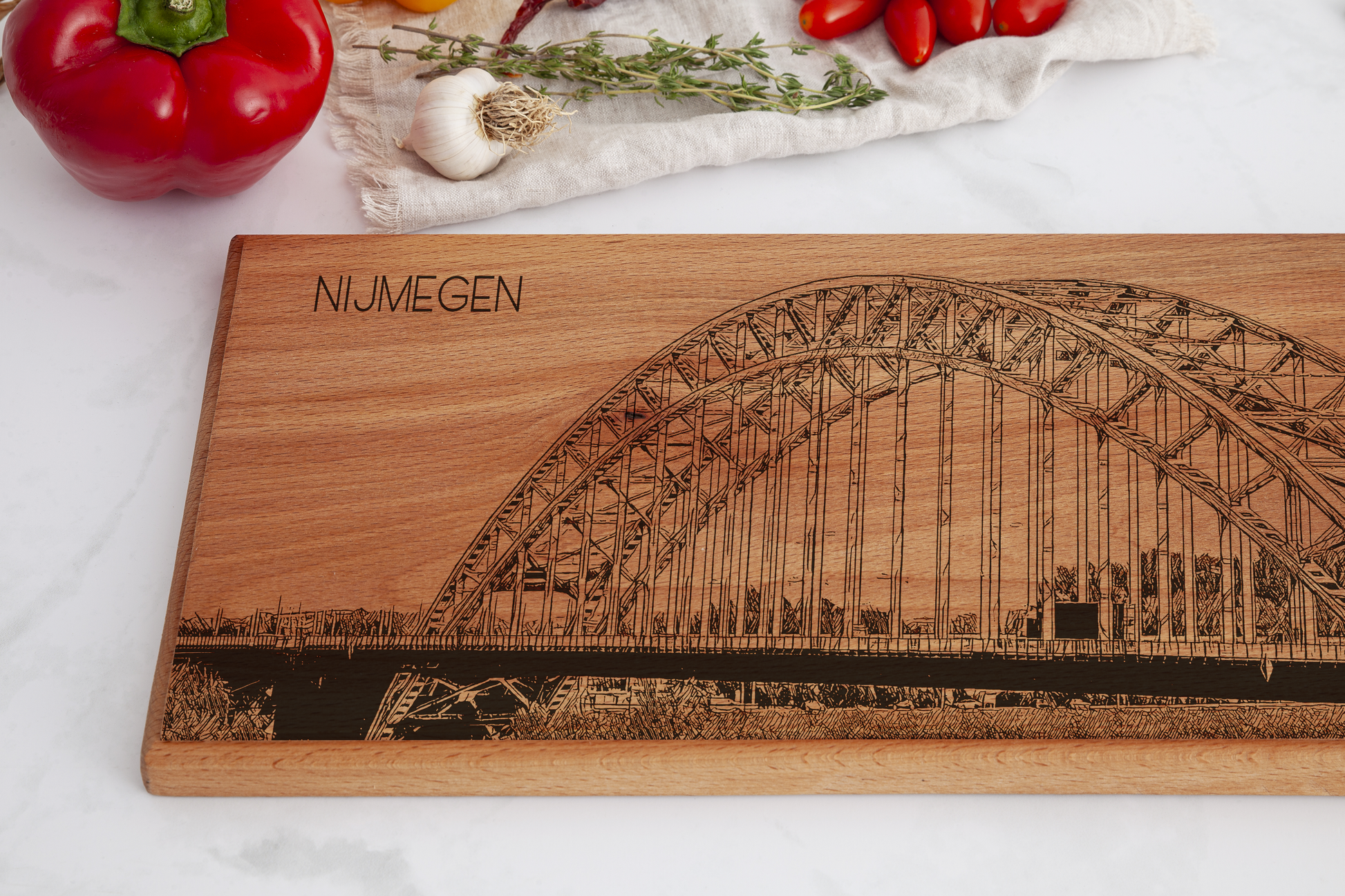 Bring the iconic riverside silhouette of Nijmegen into your kitchen with this handmade Nijmegen Waalbrug wooden serving board. Crafted in the Netherlands, this wooden serving board features a refined line-art illustration inspired by the Waalbrug and the historic cityscape along the Waal river. Designed to blend functionality with architectural elegance, it is ideal for serving, presenting, or decorative display.