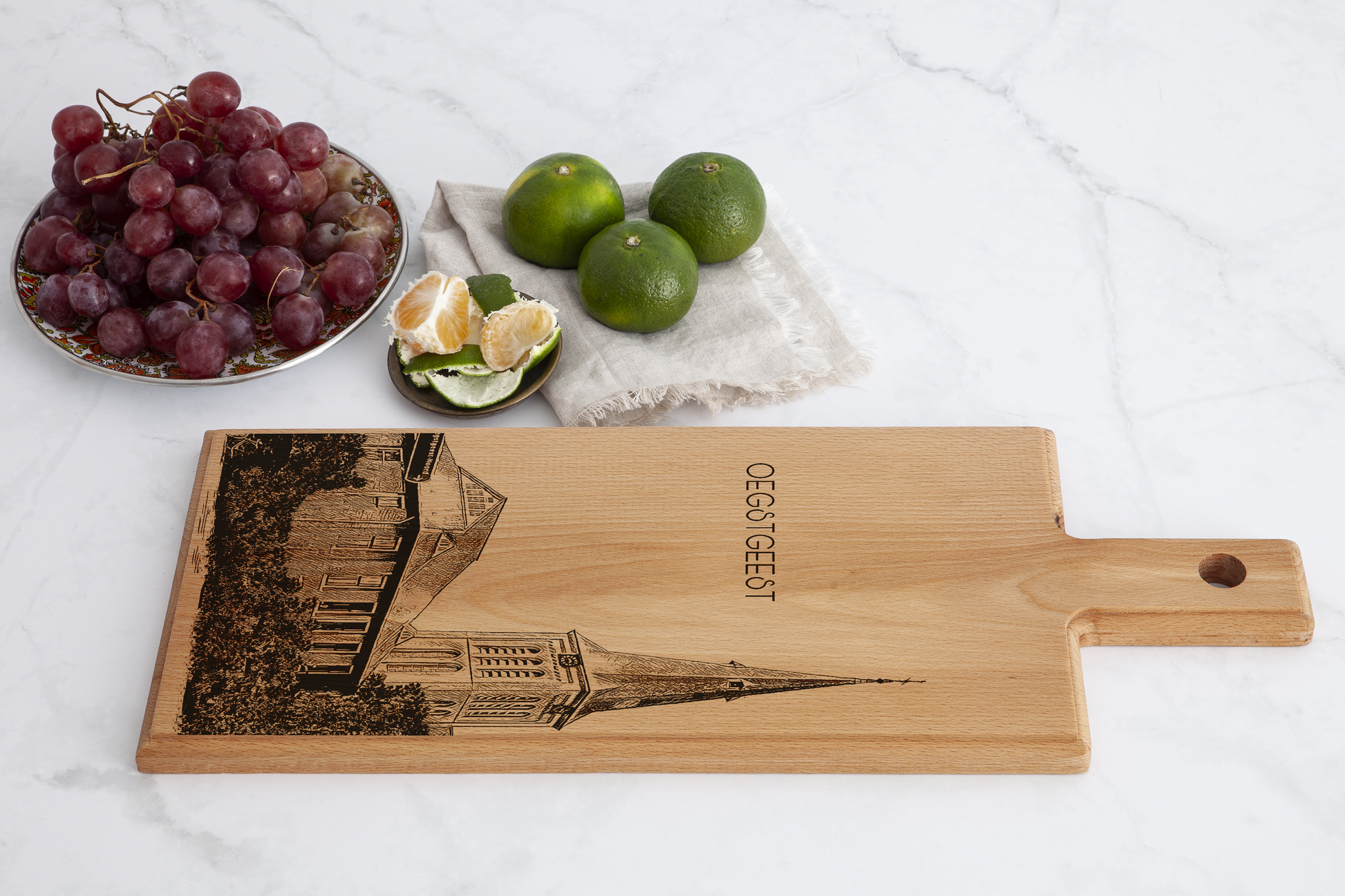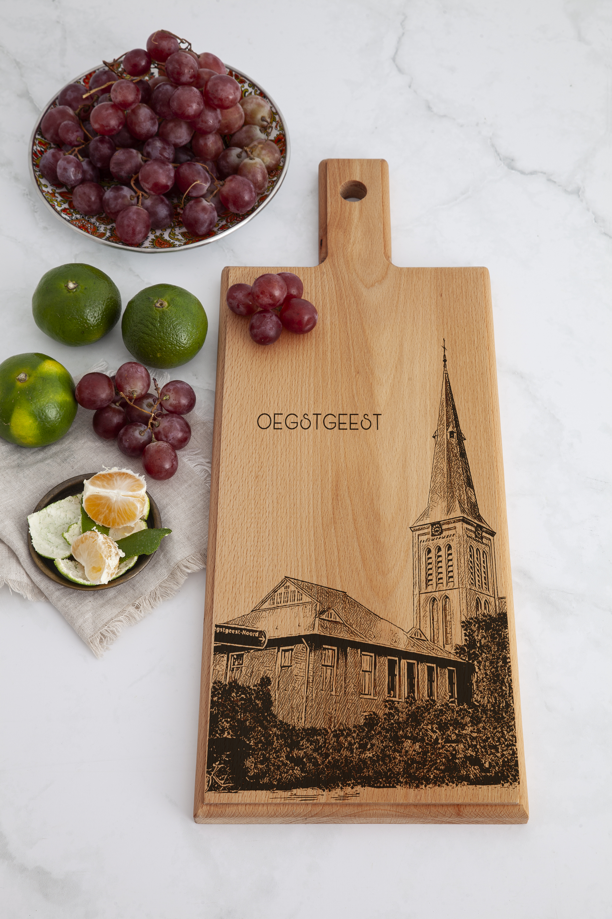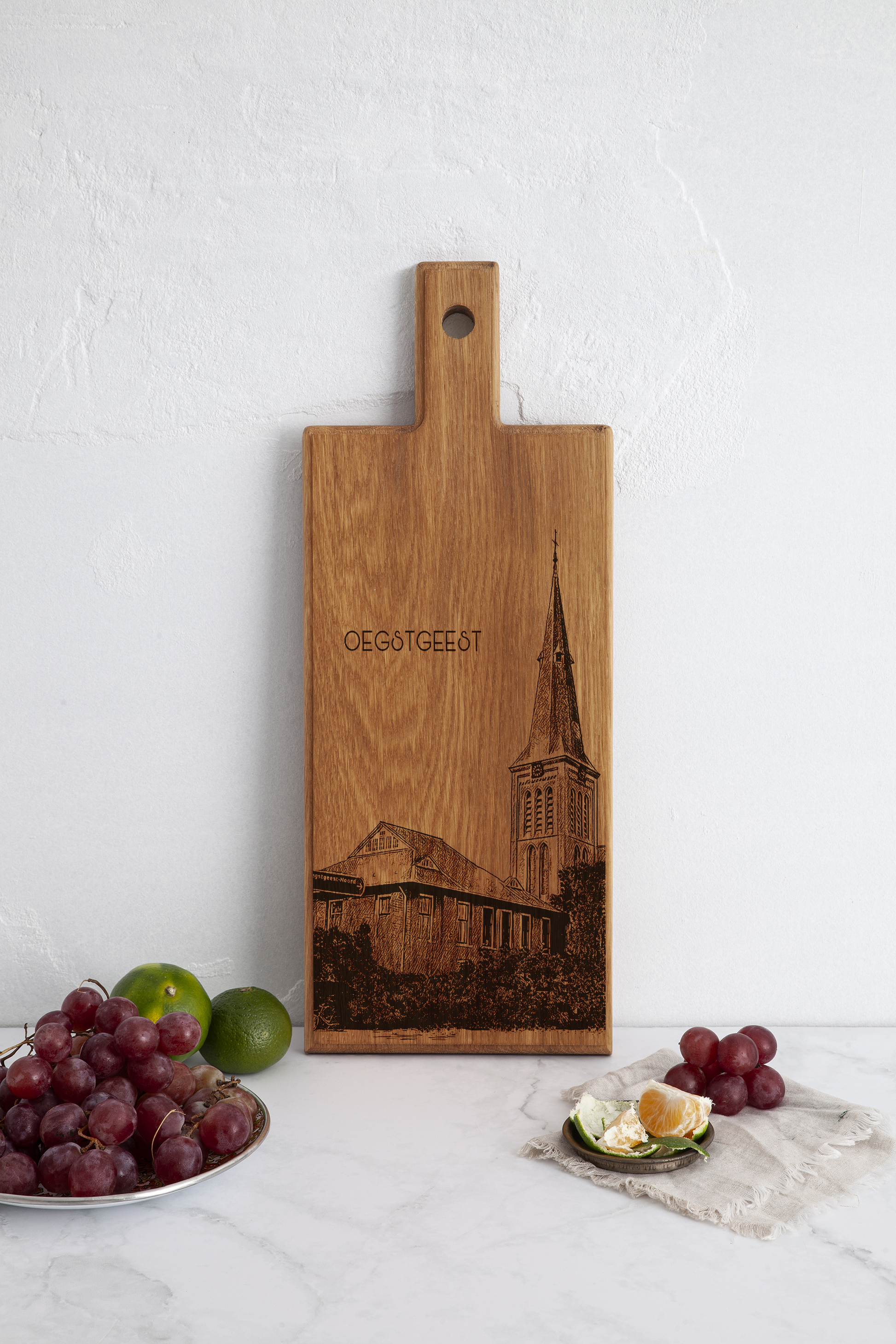 Each board is individually handmade and engraved, making every piece unique. The detailed church illustration highlights the architectural presence of the H. Willibrord Church and transforms this board into a meaningful keepsake or refined decorative accent connected to Oegstgeest.