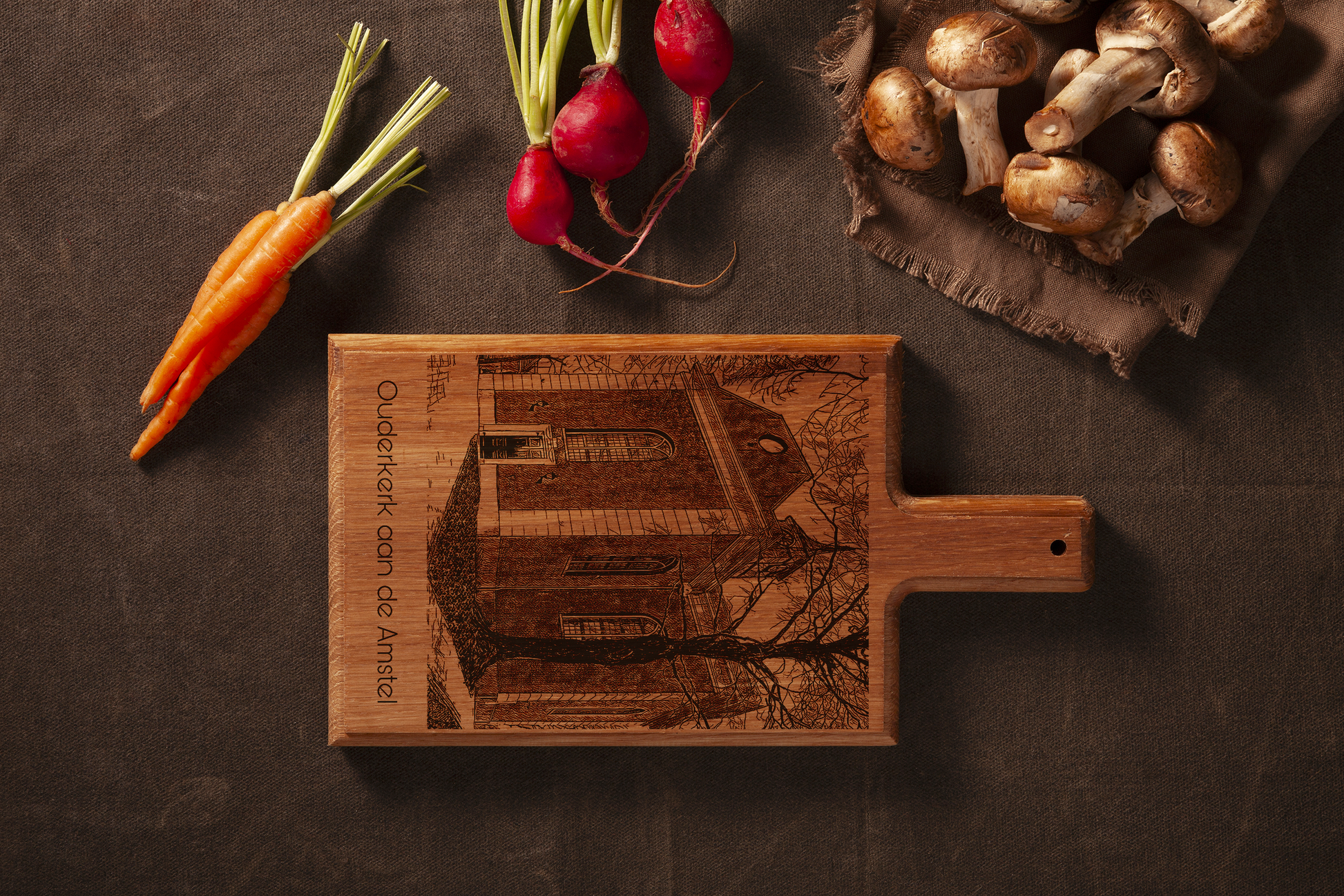 Bring the charm of a historic riverside village into your kitchen with this handmade wooden serving board, featuring a finely engraved illustration inspired by Ouderkerk aan de Amstel.