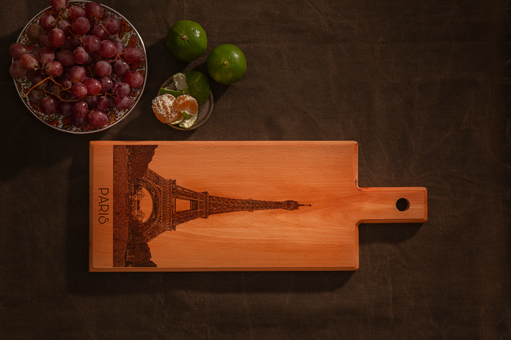 This handmade wooden serving board features an original illustration of the iconic Eiffel Tower, carefully drawn and engraved in the Netherlands. Crafted from solid beech wood, this elegant presentation board reflects timeless craftsmanship, romantic heritage, and iconic architectural beauty.