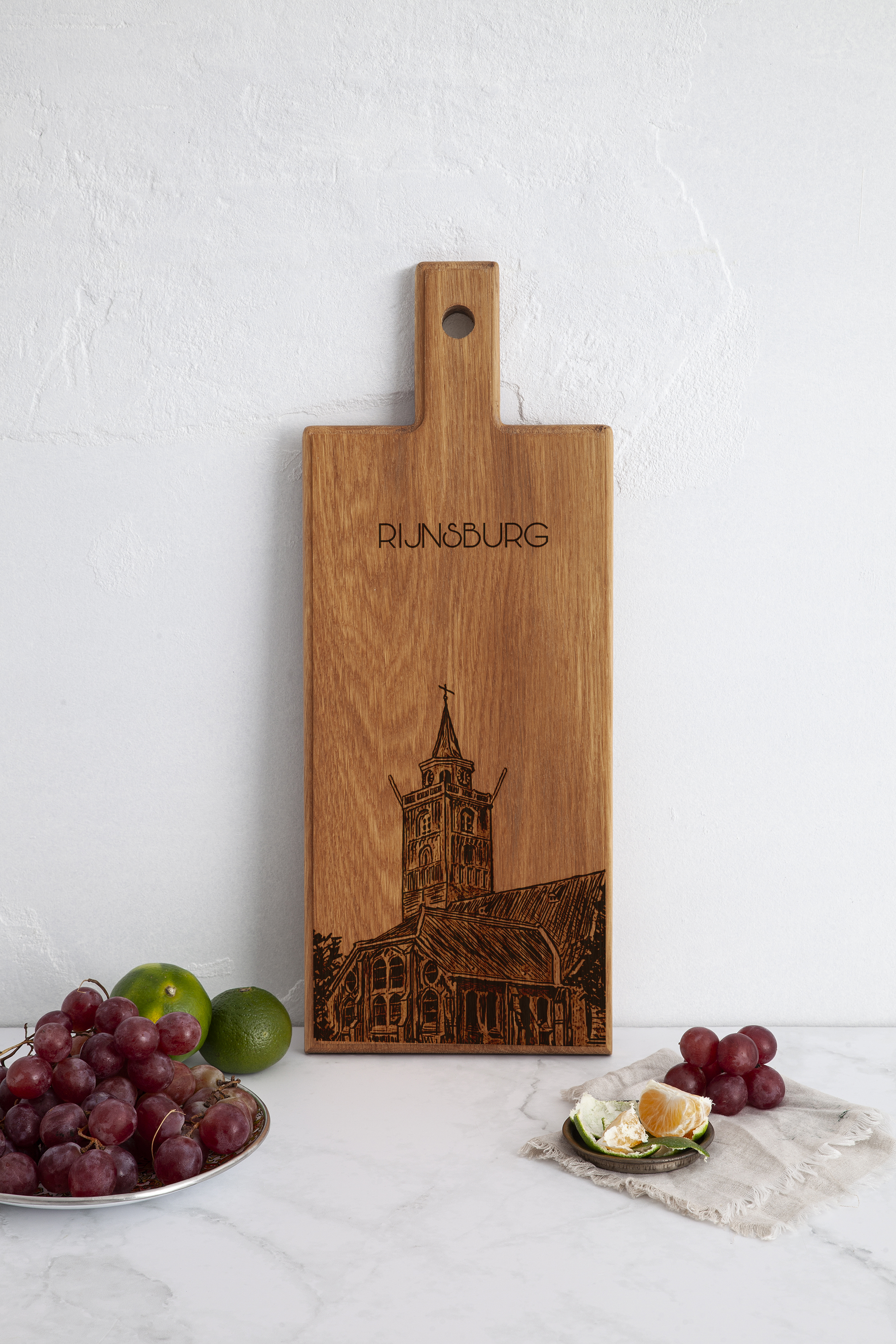 Each board is individually handmade and engraved, making every piece unique. The detailed church illustration highlights the historic presence of the Grote Kerk and transforms this board into a meaningful keepsake or refined decorative accent connected to Rijnsburg.