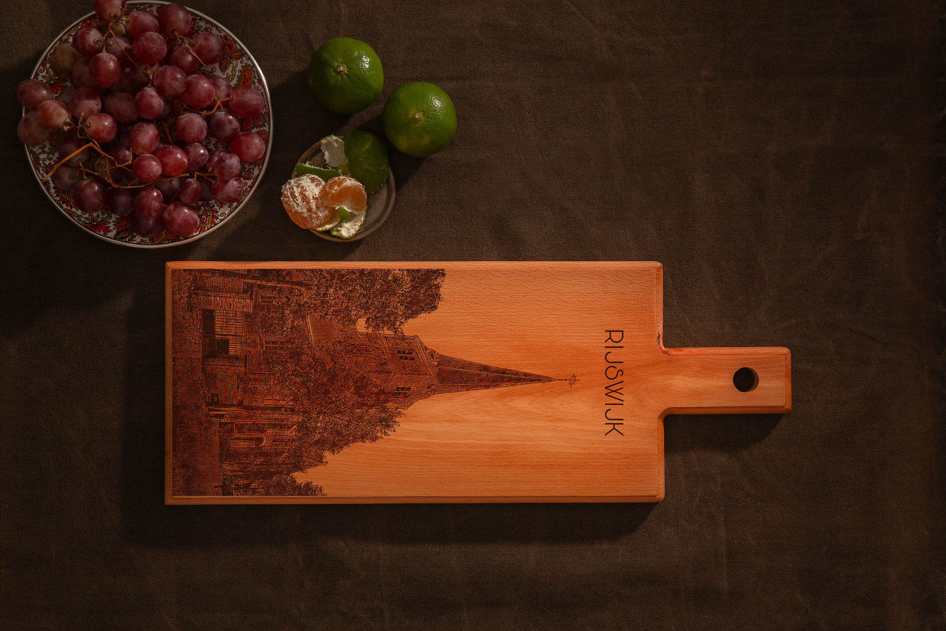 This handmade wooden serving board features an original illustration of Oude Kerk Rijswijk, carefully drawn and engraved in the Netherlands. Crafted from solid beech wood, this elegant presentation board reflects Dutch craftsmanship, historic heritage, and timeless design.