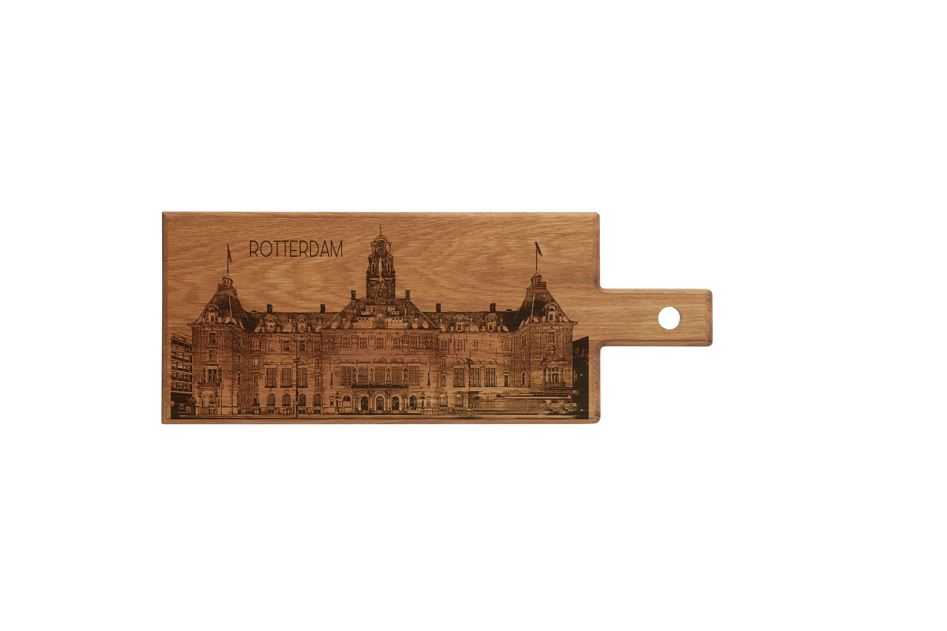 Each board is individually handmade and engraved, making every piece unique. The detailed city hall illustration highlights the monumental architecture of Rotterdam’s Stadhuis and transforms this board into a meaningful keepsake or refined decorative accent connected to the city’s identity.