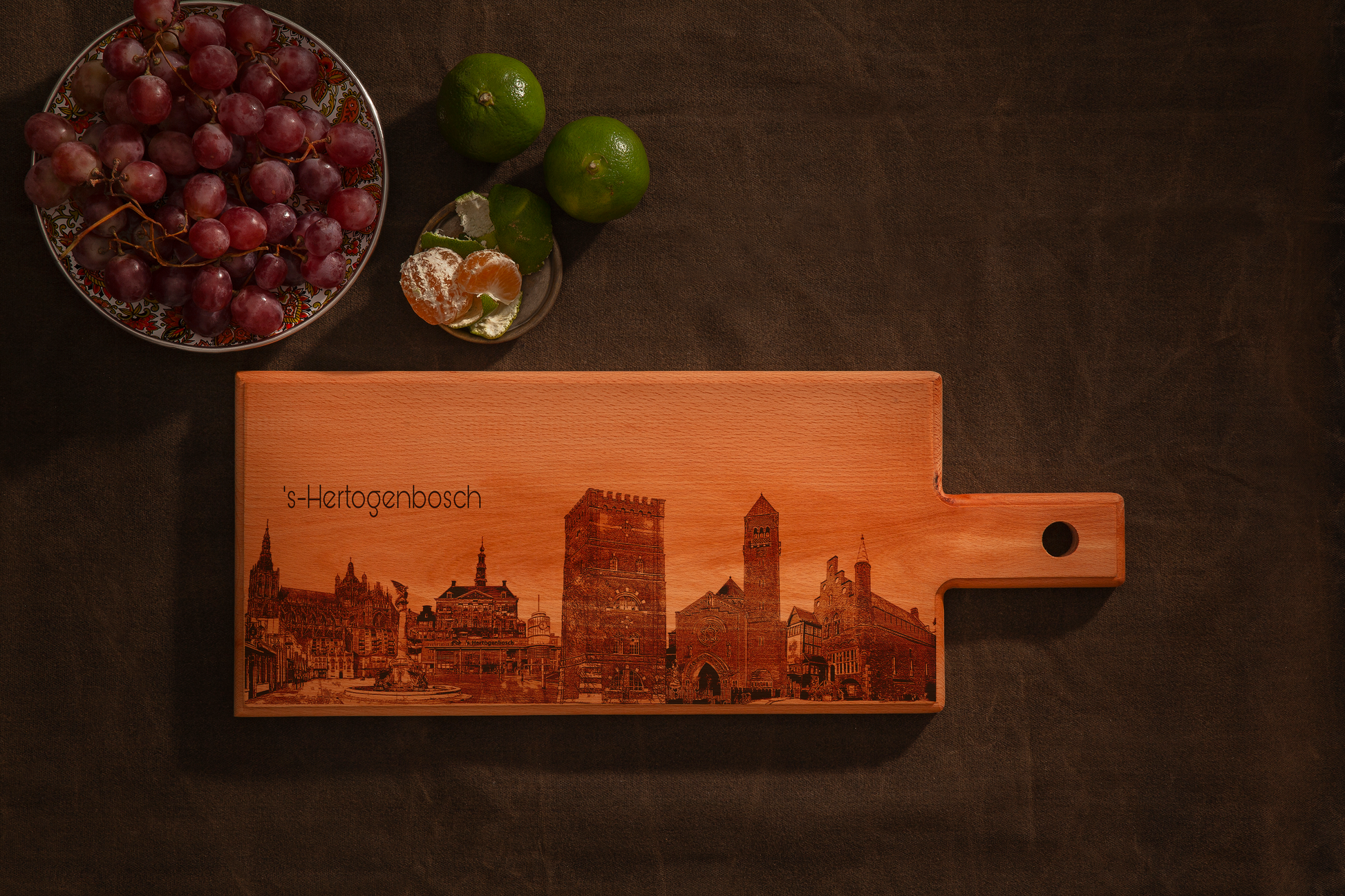 Celebrate medieval heritage and Brabant character with this handmade wooden serving board, featuring a finely engraved skyline of ’s-Hertogenbosch (also known as Den Bosch).