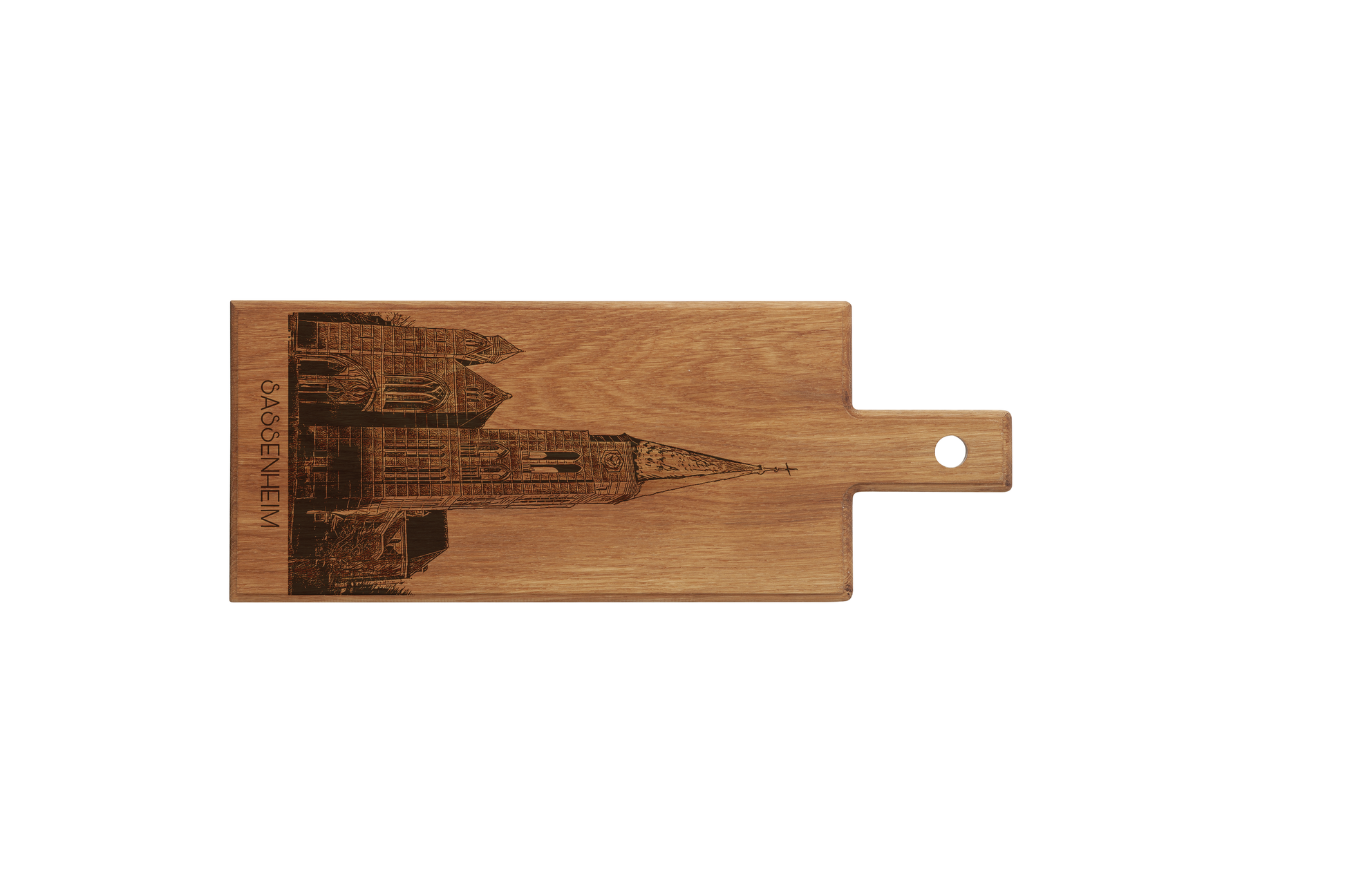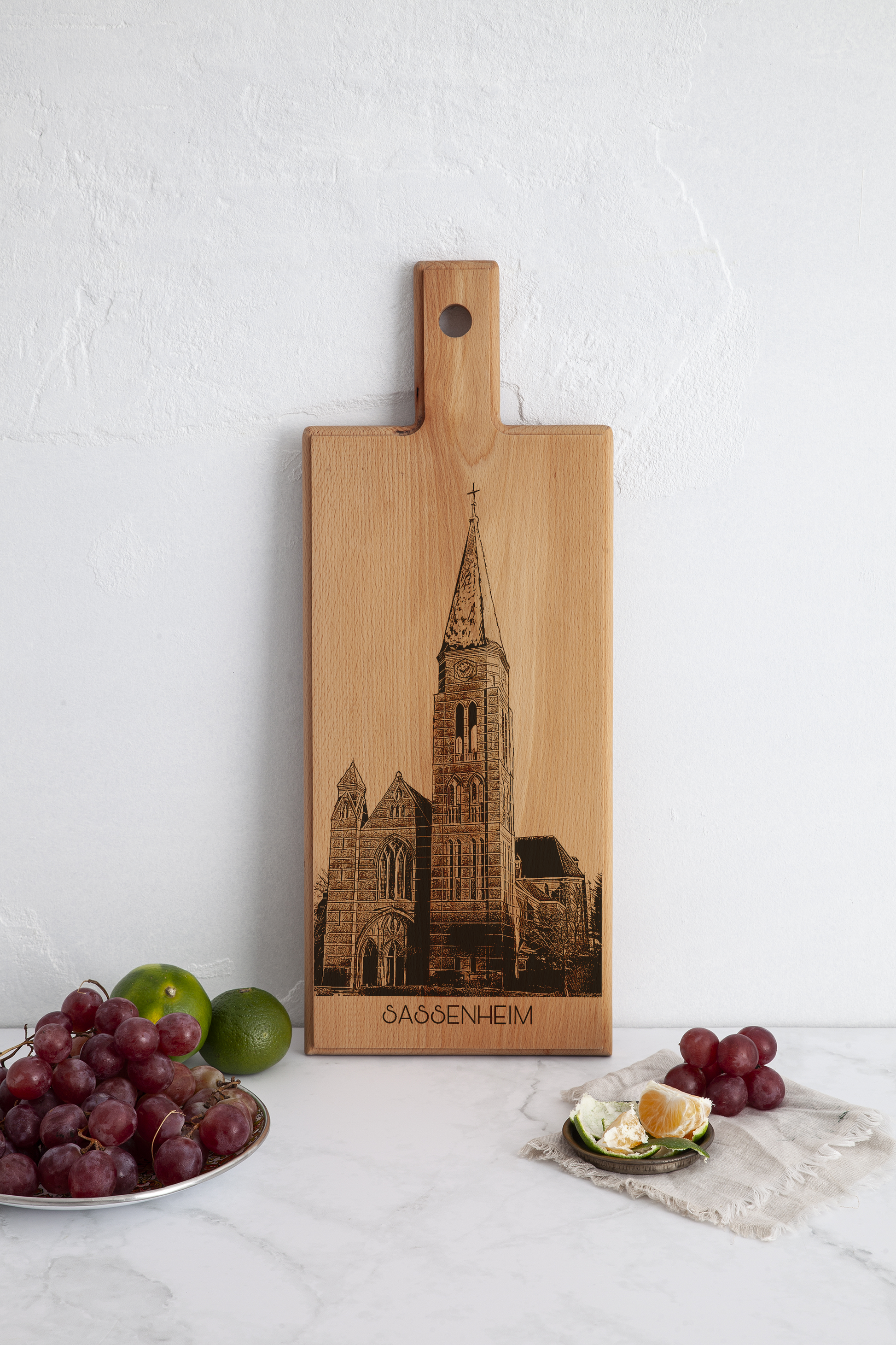 Each board is individually handmade and engraved, making every piece unique. The detailed church illustration highlights the historic and architectural character of the St. Pancratius Church and transforms this board into a meaningful keepsake or refined decorative accent connected to Sassenheim.
