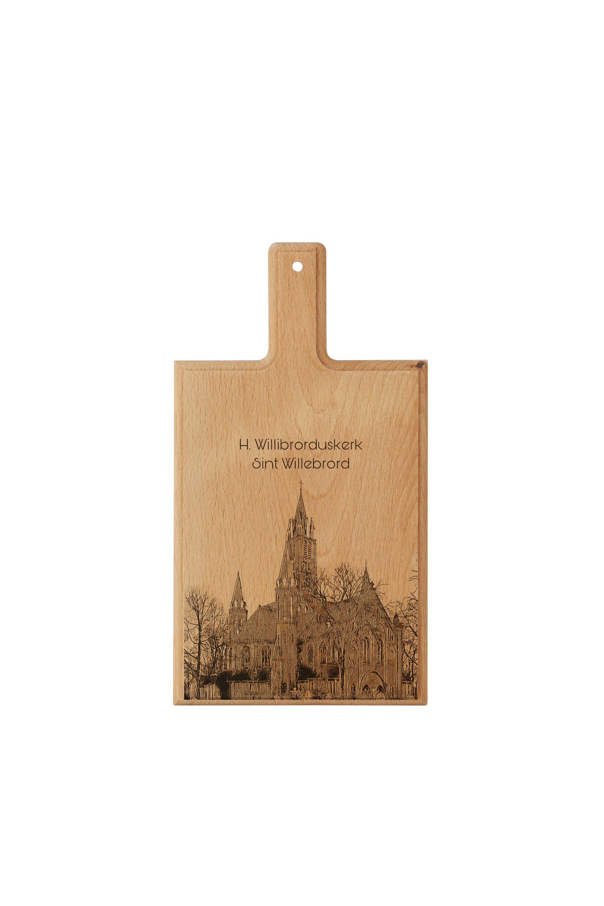 Crafted from one solid piece of European beechwood, this board showcases an original hand-drawn illustration that is precisely laser-engraved into the wood. The calm village atmosphere of Sint Willebrord is reflected in the clean lines and timeless design, combined with the natural beauty of the wood grain.