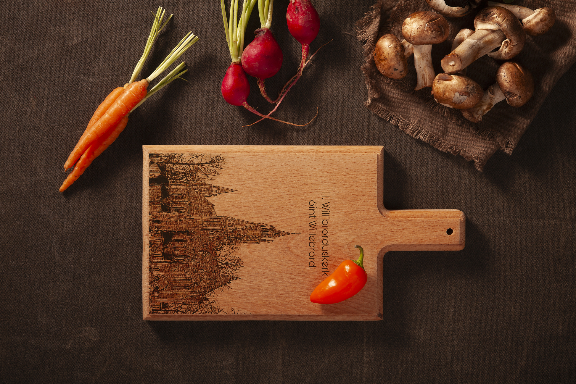 Bring the warm character of a traditional Dutch village into your kitchen with this handmade wooden serving board, featuring a finely engraved illustration inspired by Sint Willebrord.