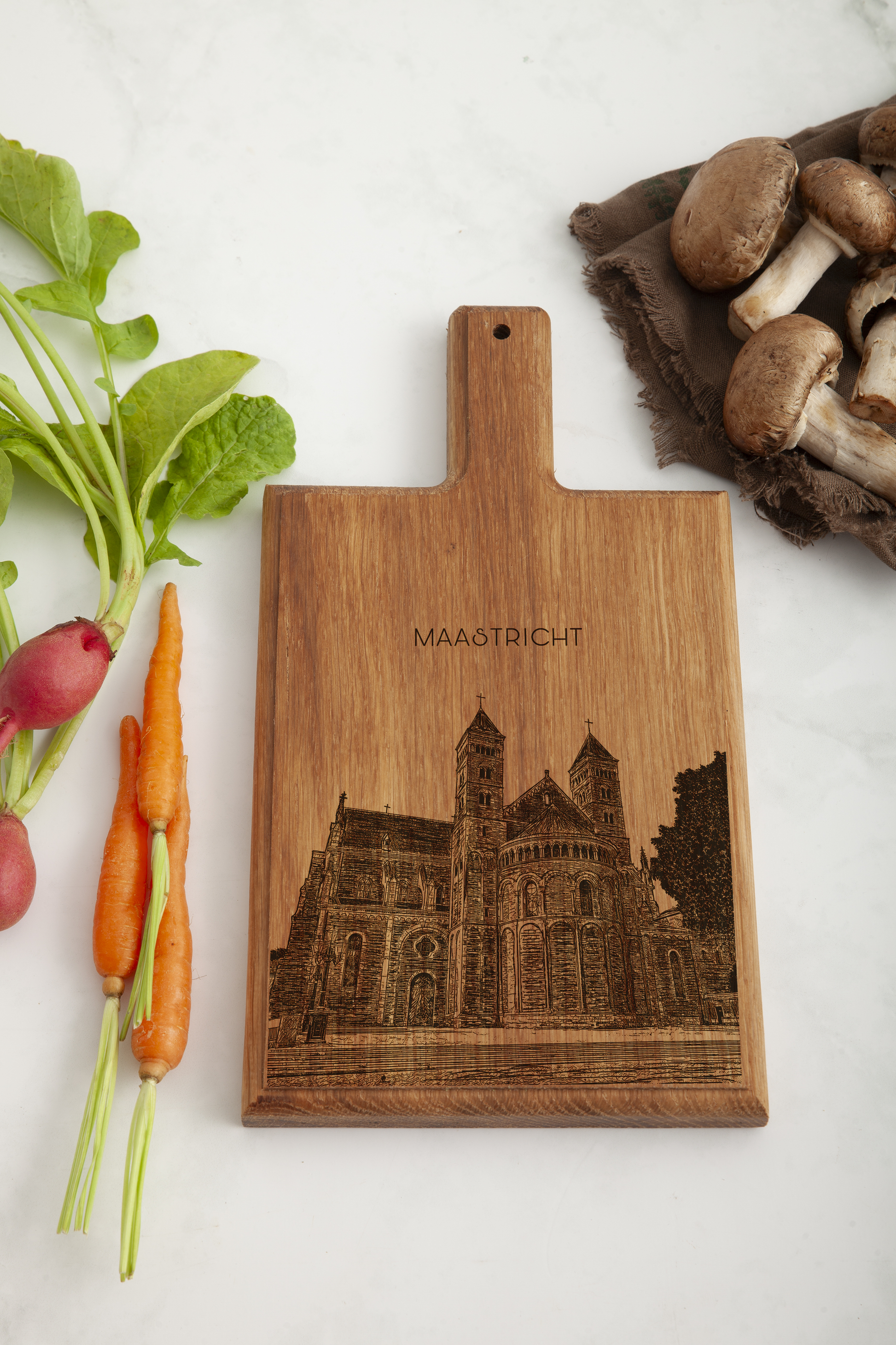 Inspired by the historic St. Servaas Basilica in Maastricht, this handcrafted cheese board brings Dutch religious heritage into your home. Made from premium beech wood, it features a detailed, hand-drawn engraving of the basilica, adding an elegant, historic touch to any gathering.