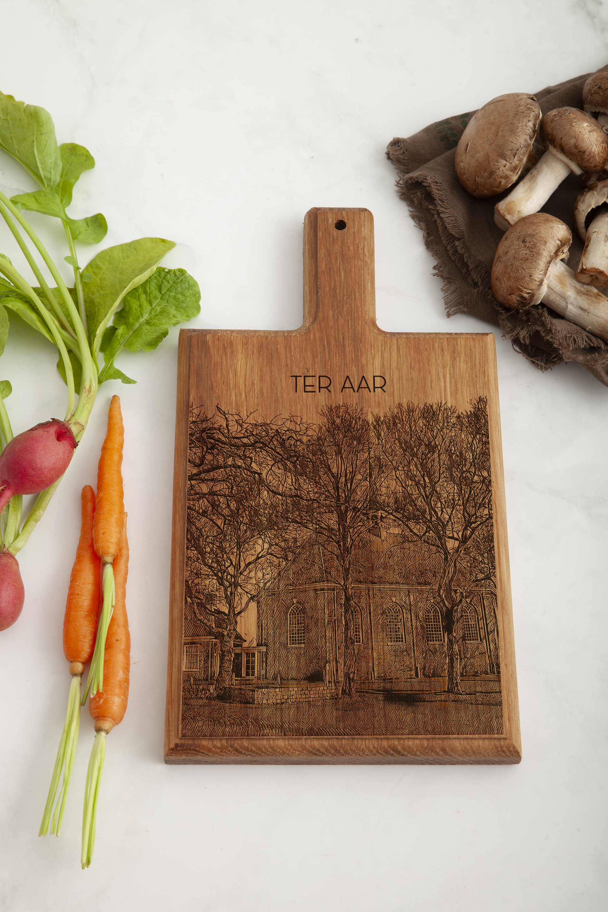 Bring the peaceful charm of a Dutch lakeside village into your kitchen with this handmade wooden serving board, featuring a finely engraved illustration inspired by Ter Aar.