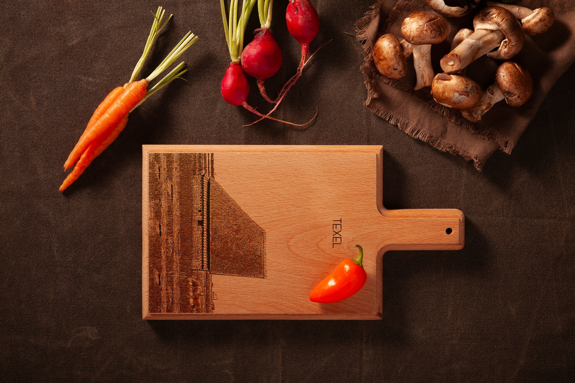This handmade wooden cheese board features a traditional Texel farm landscape, carefully engraved on solid beech wood. Designed and produced in the Netherlands, this compact 28 × 15 cm cheese board is perfect for serving cheese, small bites, or as a meaningful souvenir from the island of Texel.