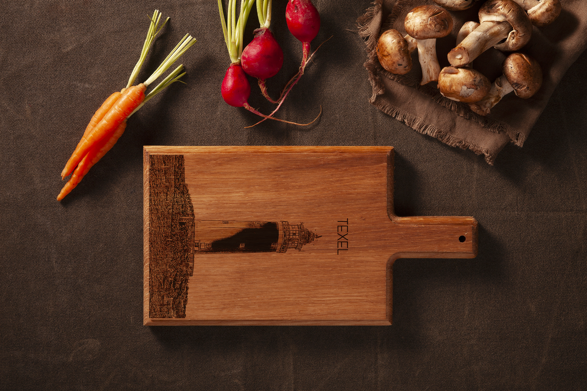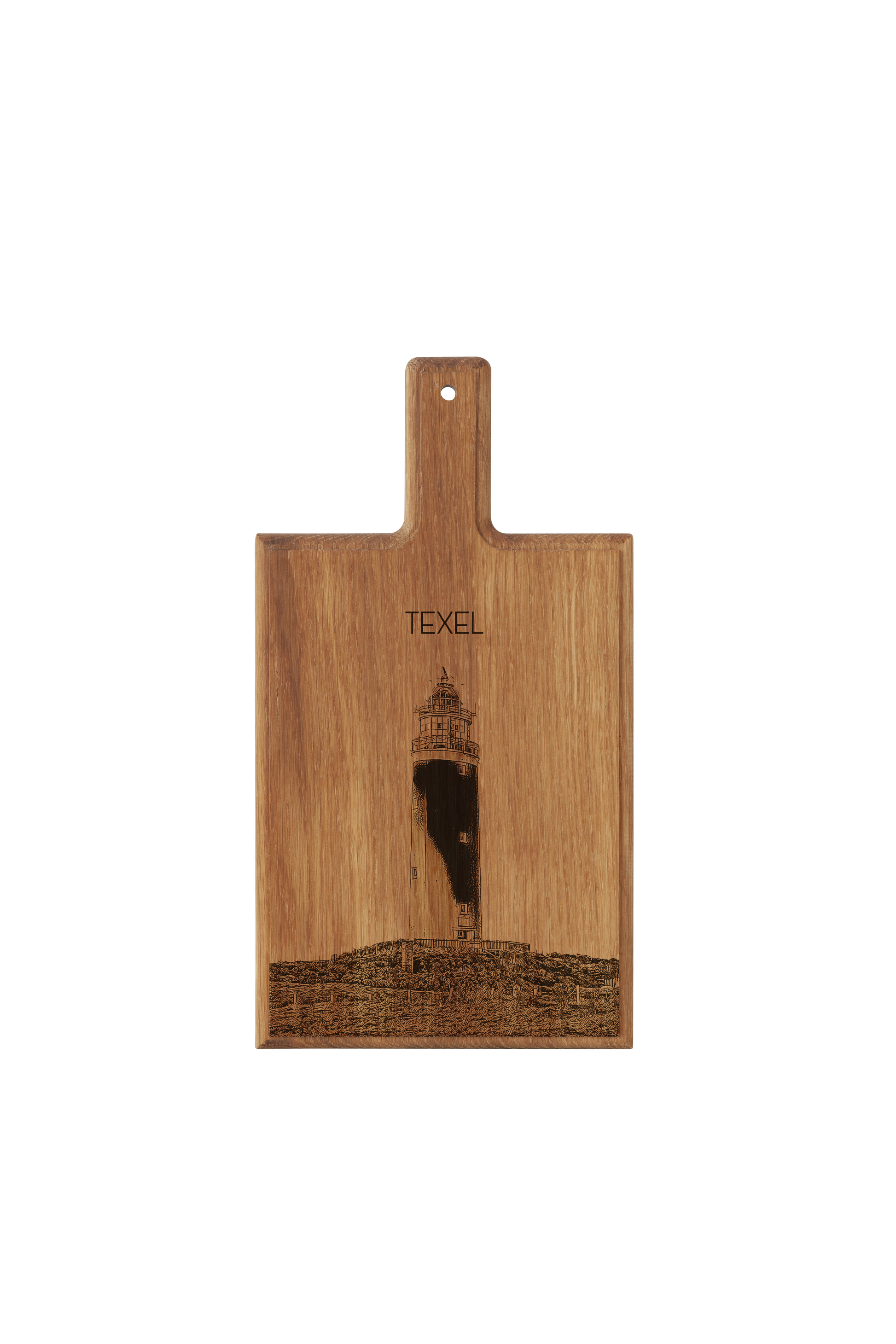 Bring the rugged beauty of the Dutch Wadden Islands into your kitchen with this handmade wooden serving board, featuring a finely engraved illustration of the iconic Texel Lighthouse.