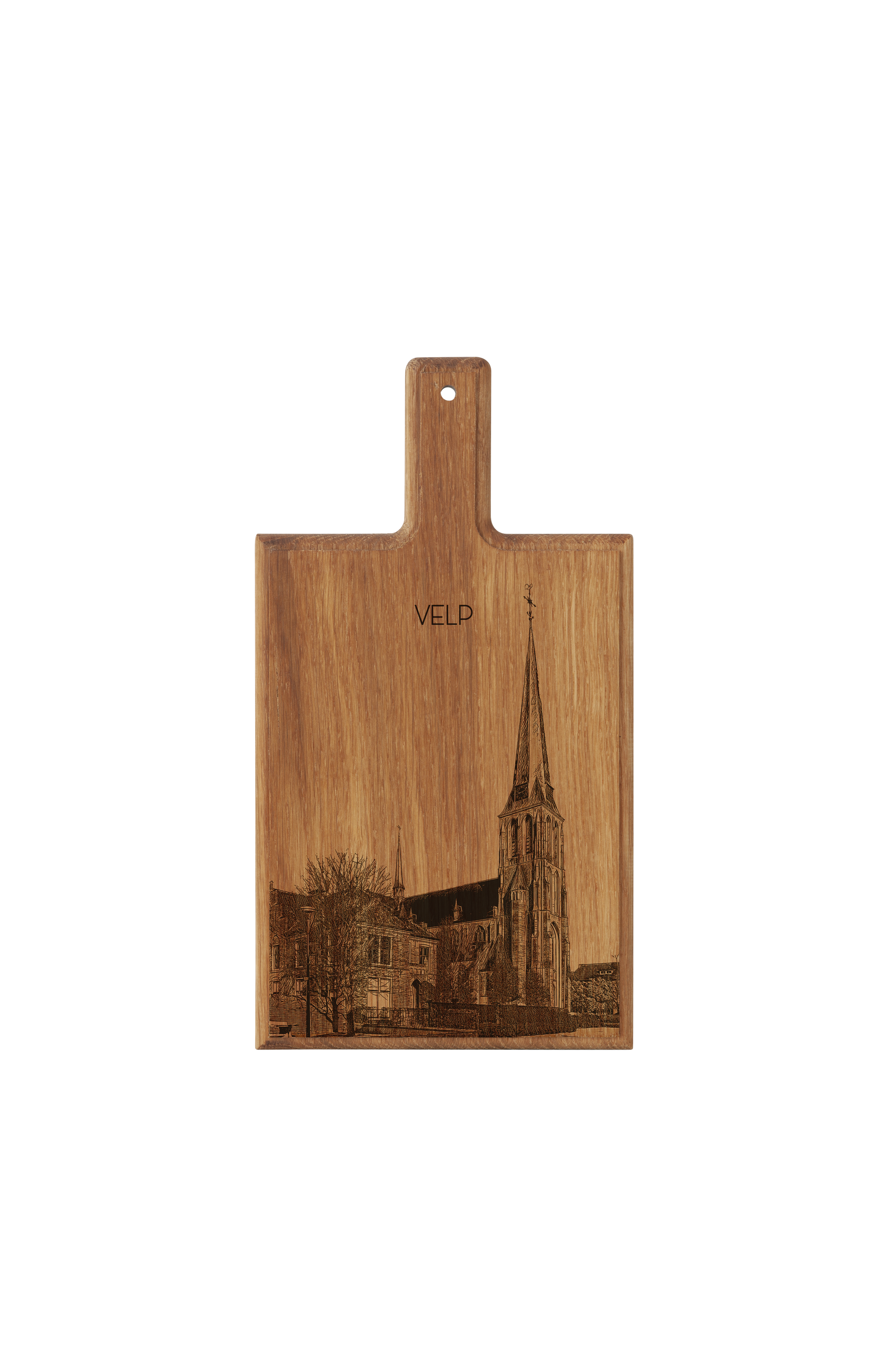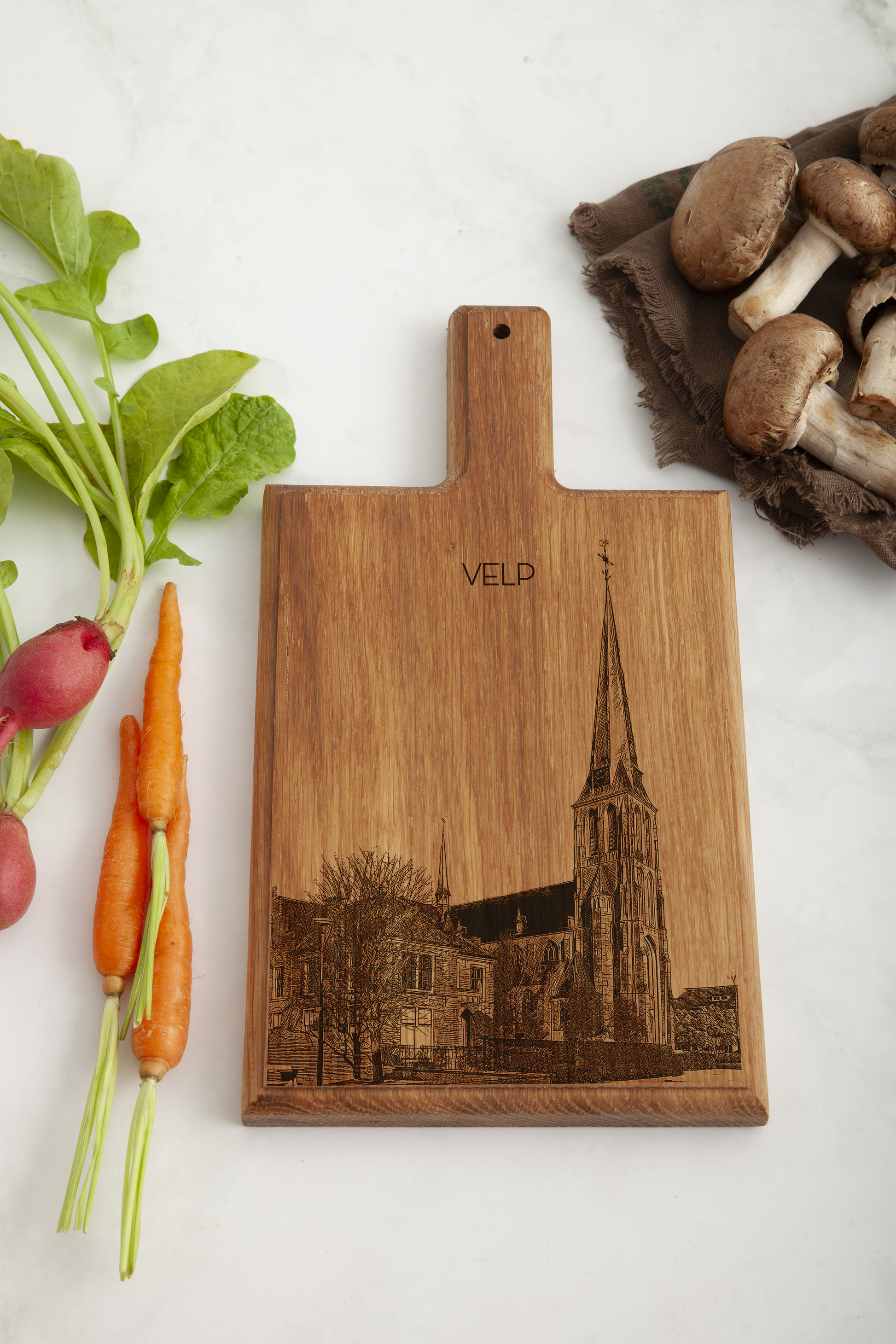 Bring the spiritual and architectural heritage of Velp into your kitchen with this handmade wooden serving board, featuring a finely engraved illustration of the historic Kerk OLV Visitatie.