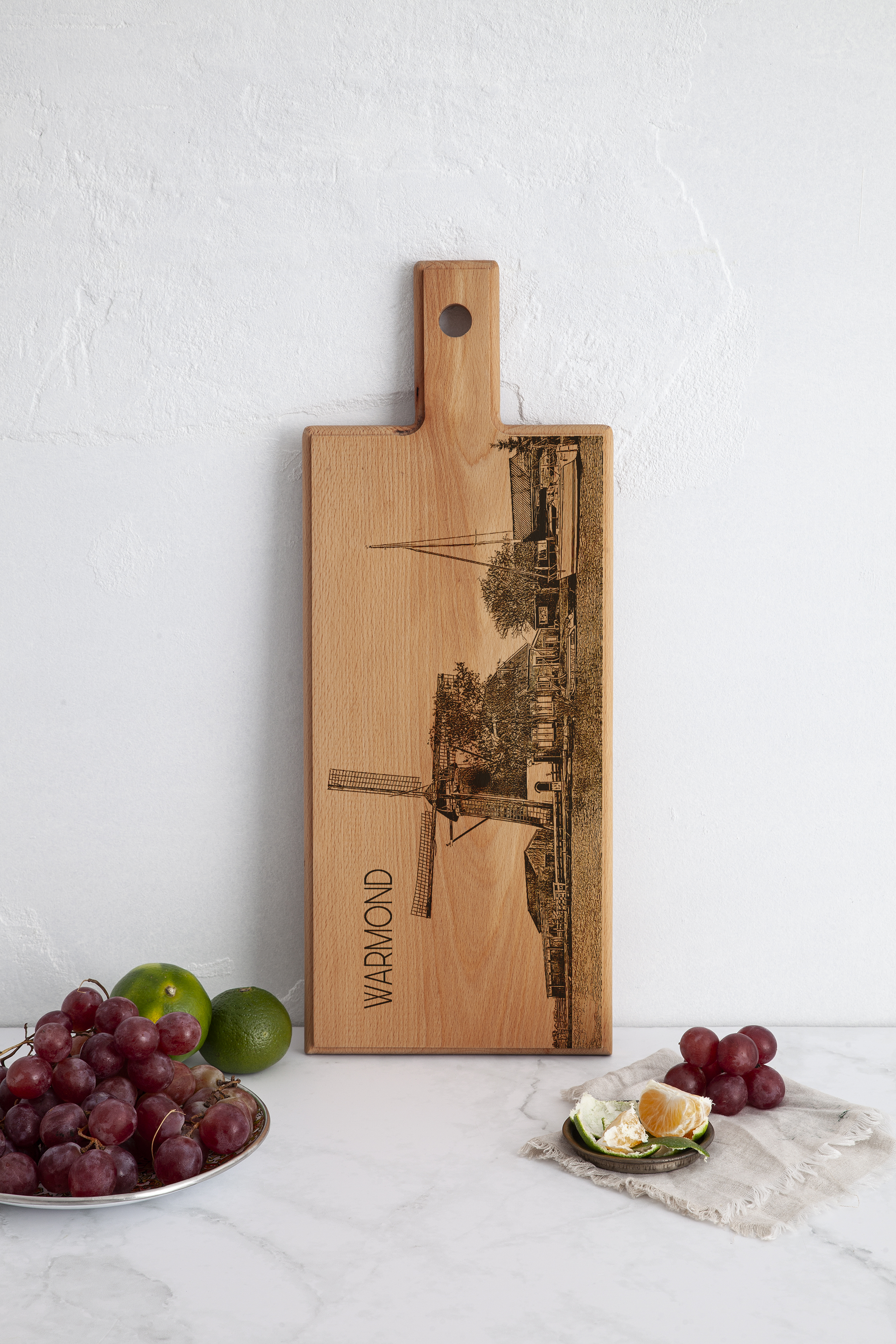 This handmade wooden serving board features an original illustration inspired by Warmond, carefully drawn and engraved in the Netherlands. Crafted from solid beech wood, this elegant presentation board reflects Dutch craftsmanship, lakeside heritage, and timeless simplicity.