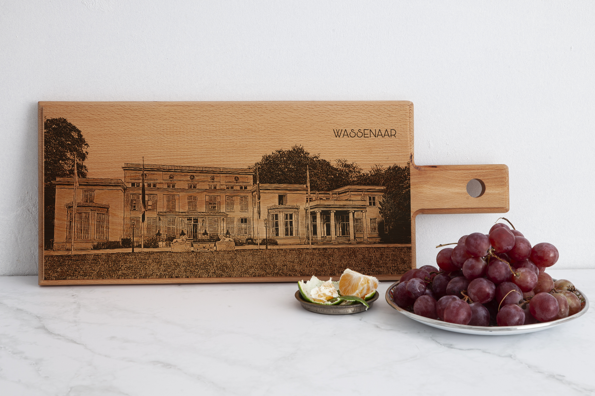 Each board is individually handmade and engraved, making every piece unique. The refined illustration captures the grandeur of Raadhuis De Paauw—one of Wassenaar’s most iconic landmarks—and transforms this board into a meaningful keepsake or a sophisticated decorative accent.