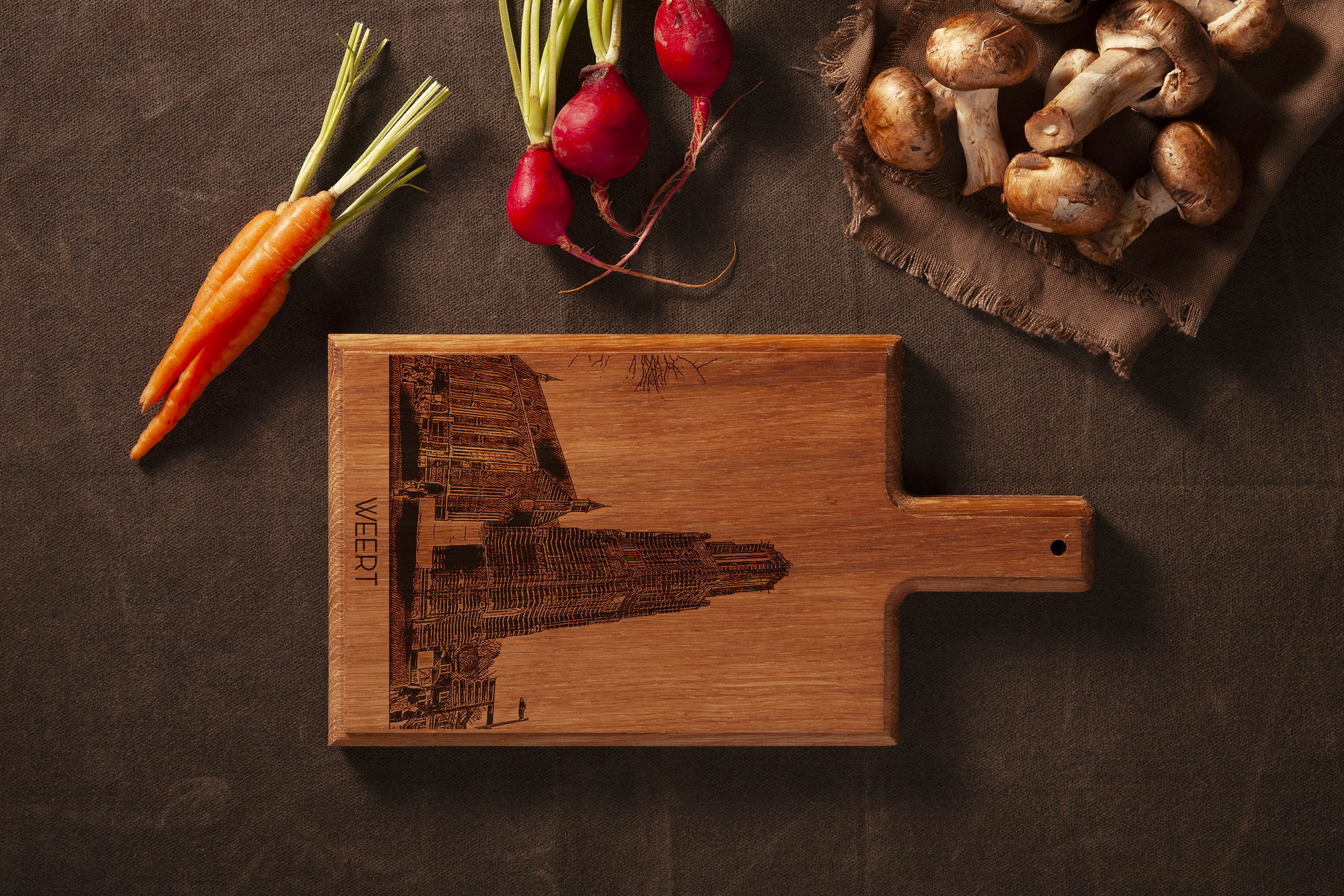 Bring the warm character of Limburg into your kitchen with this handmade wooden serving board, featuring a finely engraved illustration inspired by Weert.