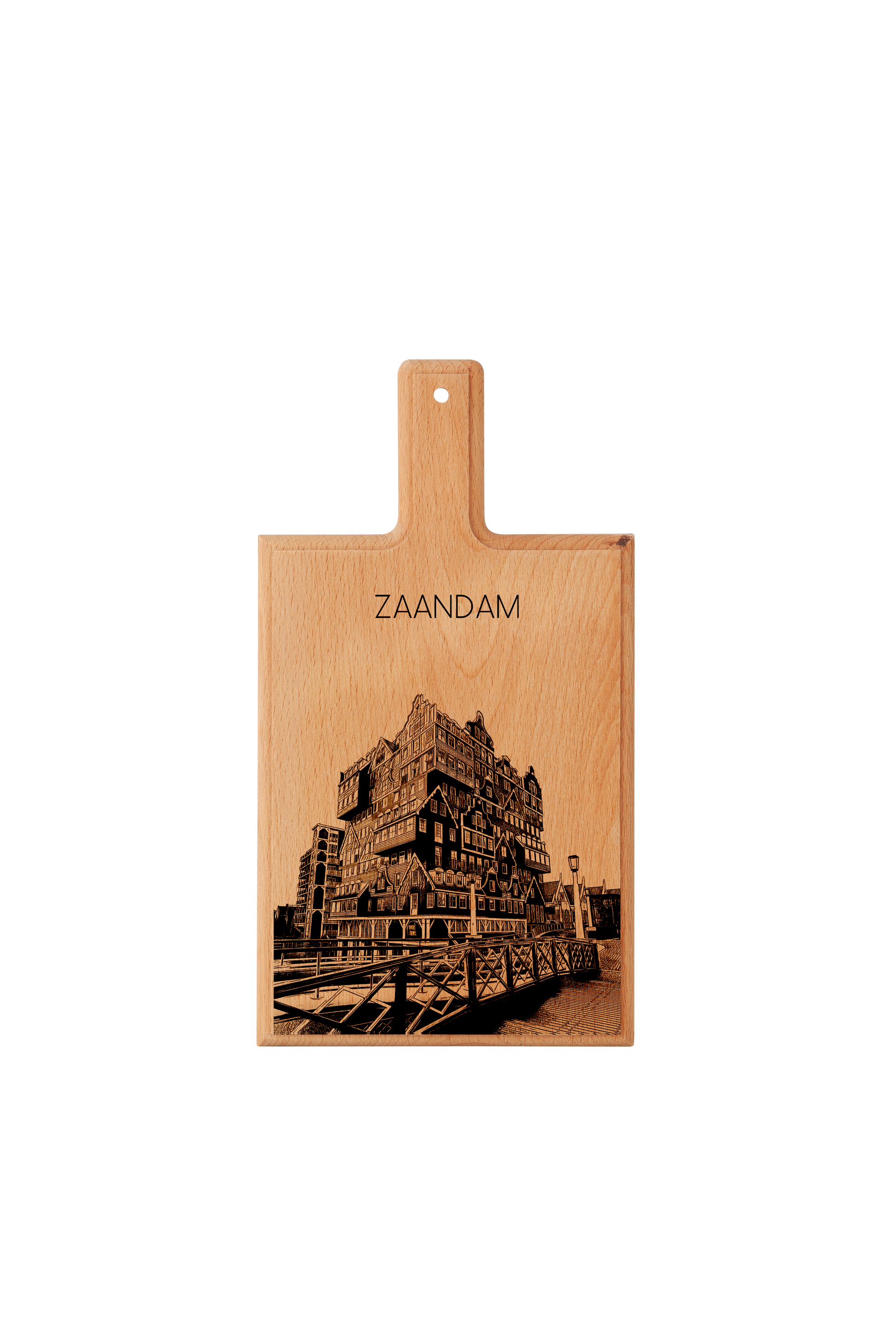 Crafted from one solid piece of European beechwood, this board showcases an original hand-drawn illustration that is precisely laser-engraved into the wood. Zaandam, famous for its windmills, riverfront, and distinctive architecture, is captured in a clean and timeless design that highlights the natural beauty of the wood grain.