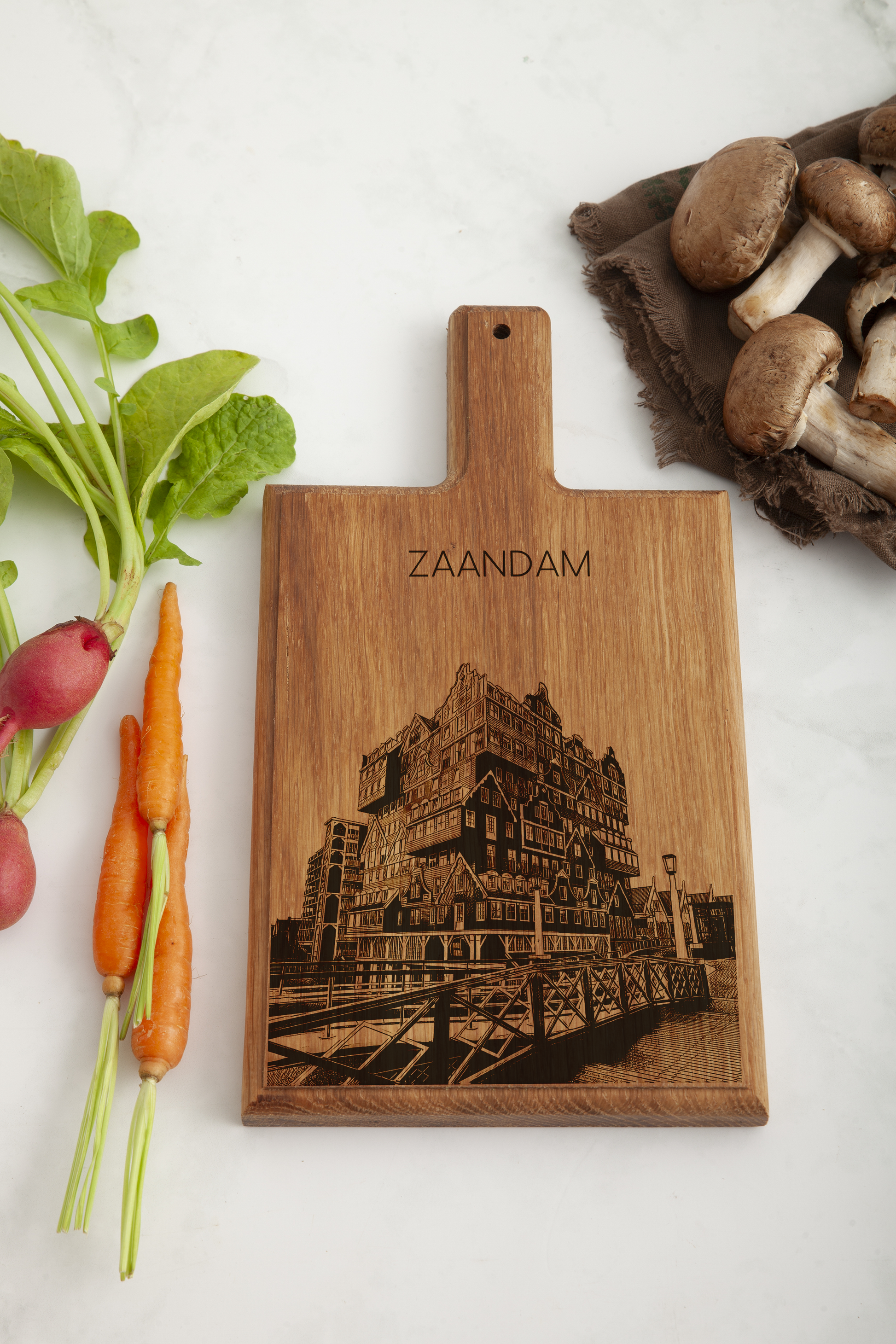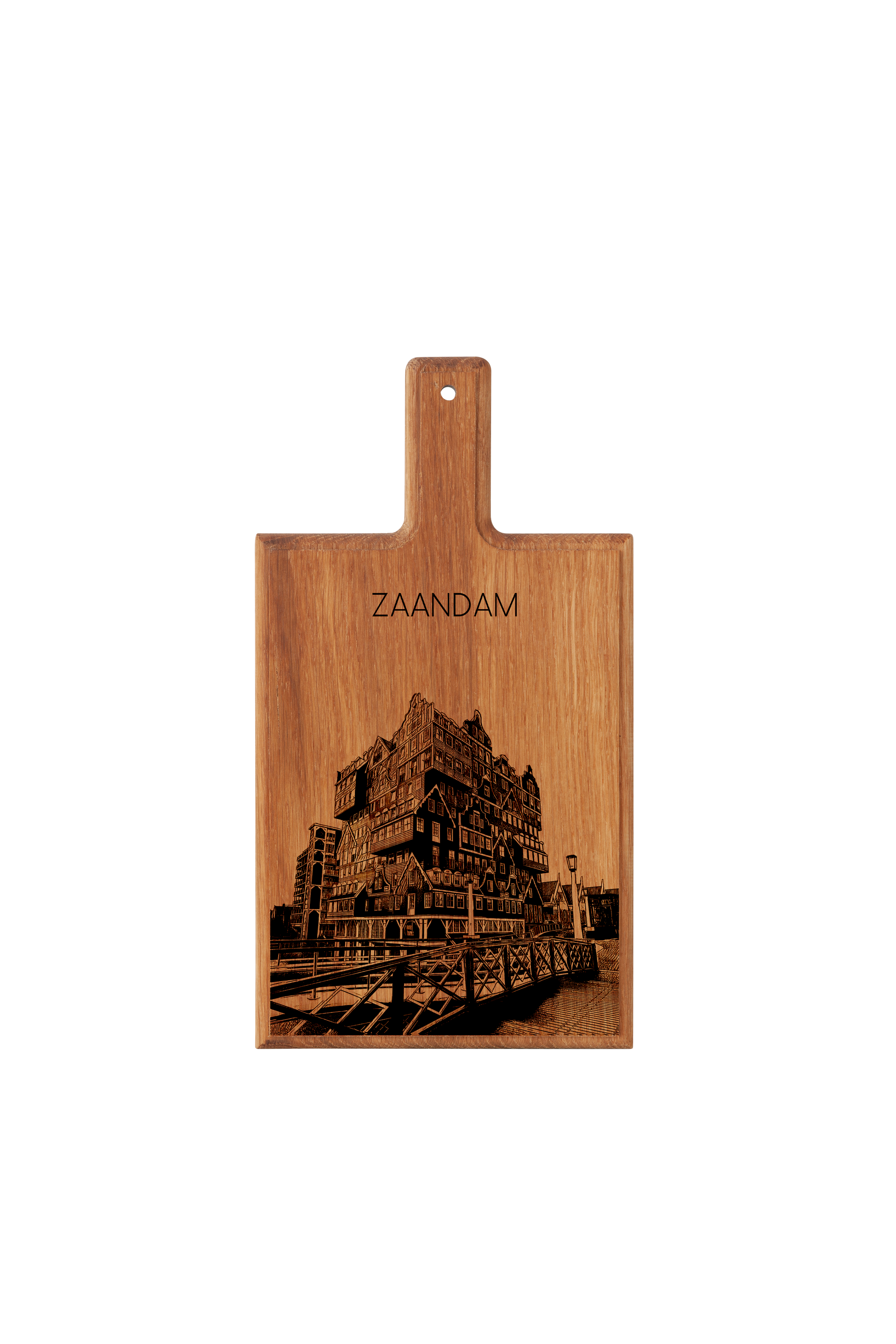Bring the iconic industrial and cultural heritage of the Zaan region into your kitchen with this handmade wooden serving board, featuring a finely engraved illustration inspired by Zaandam.