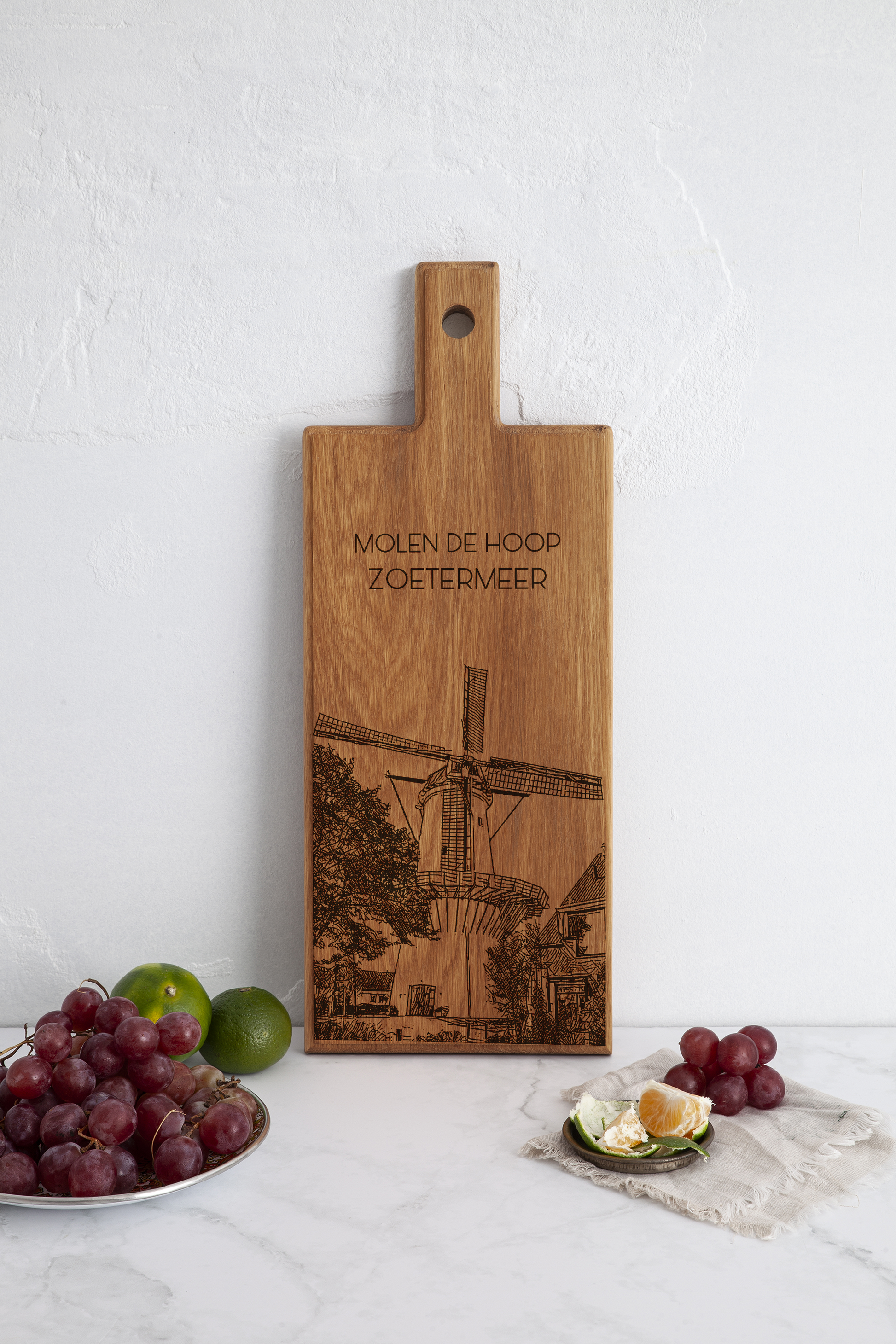 Each board is individually handmade and engraved, making every piece unique. The classic windmill silhouette of Molen De Hoop symbolizes Zoetermeer’s connection to traditional Dutch water and grain milling, transforming this board into a meaningful keepsake or refined decorative accent.