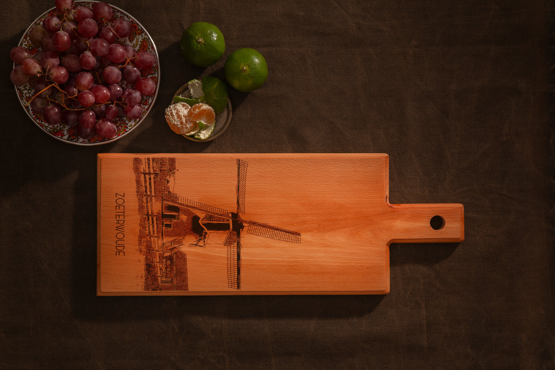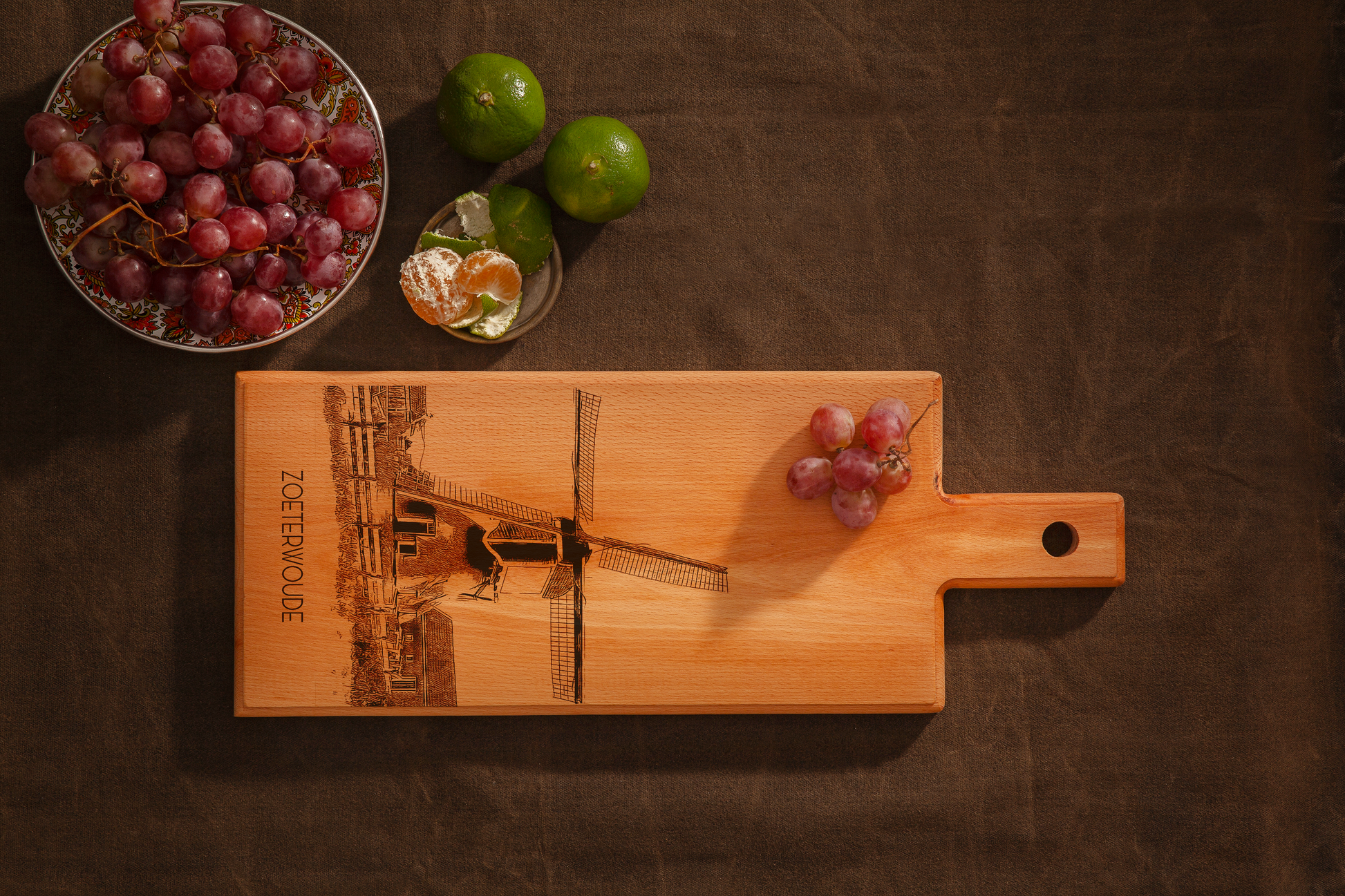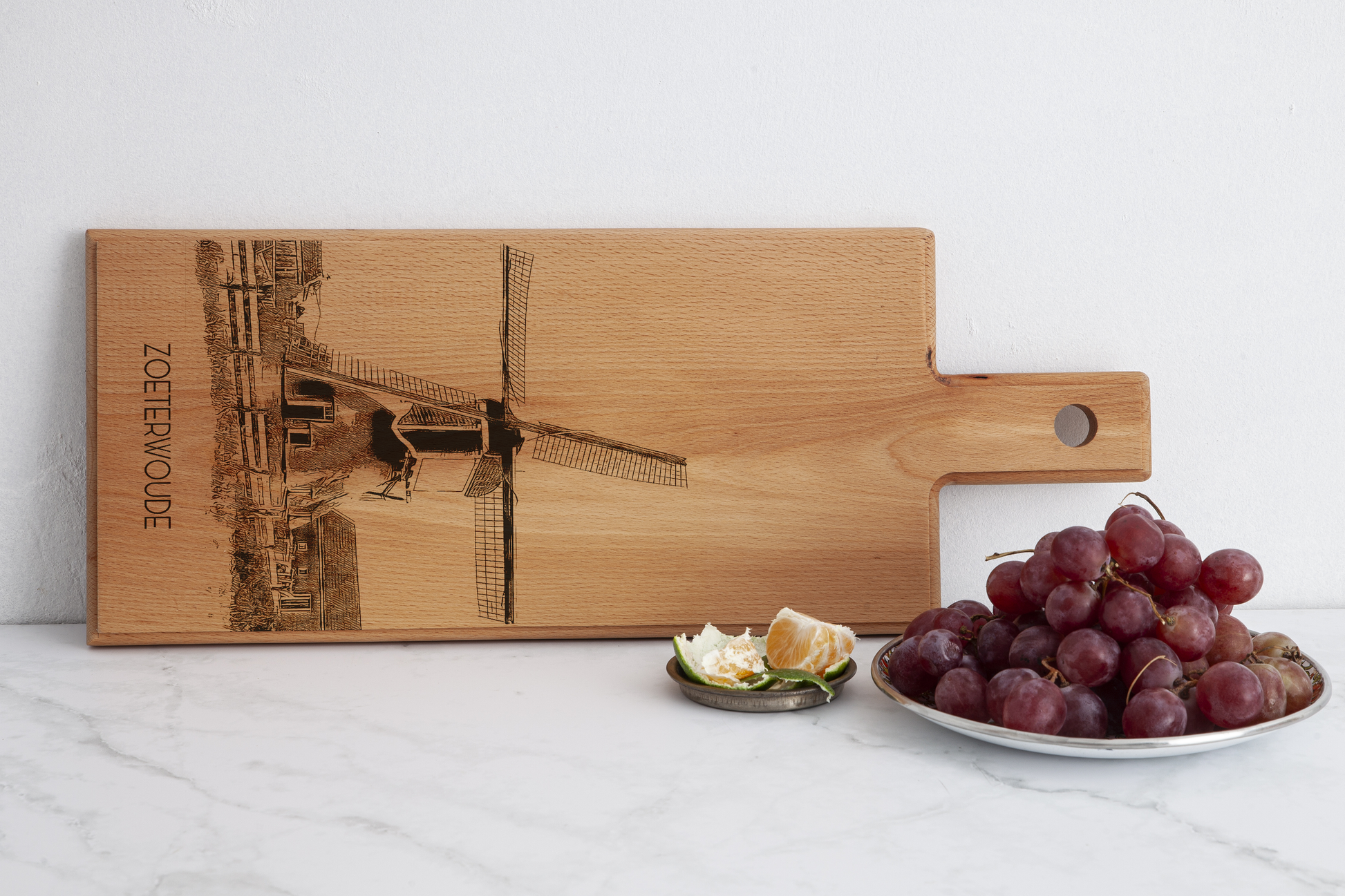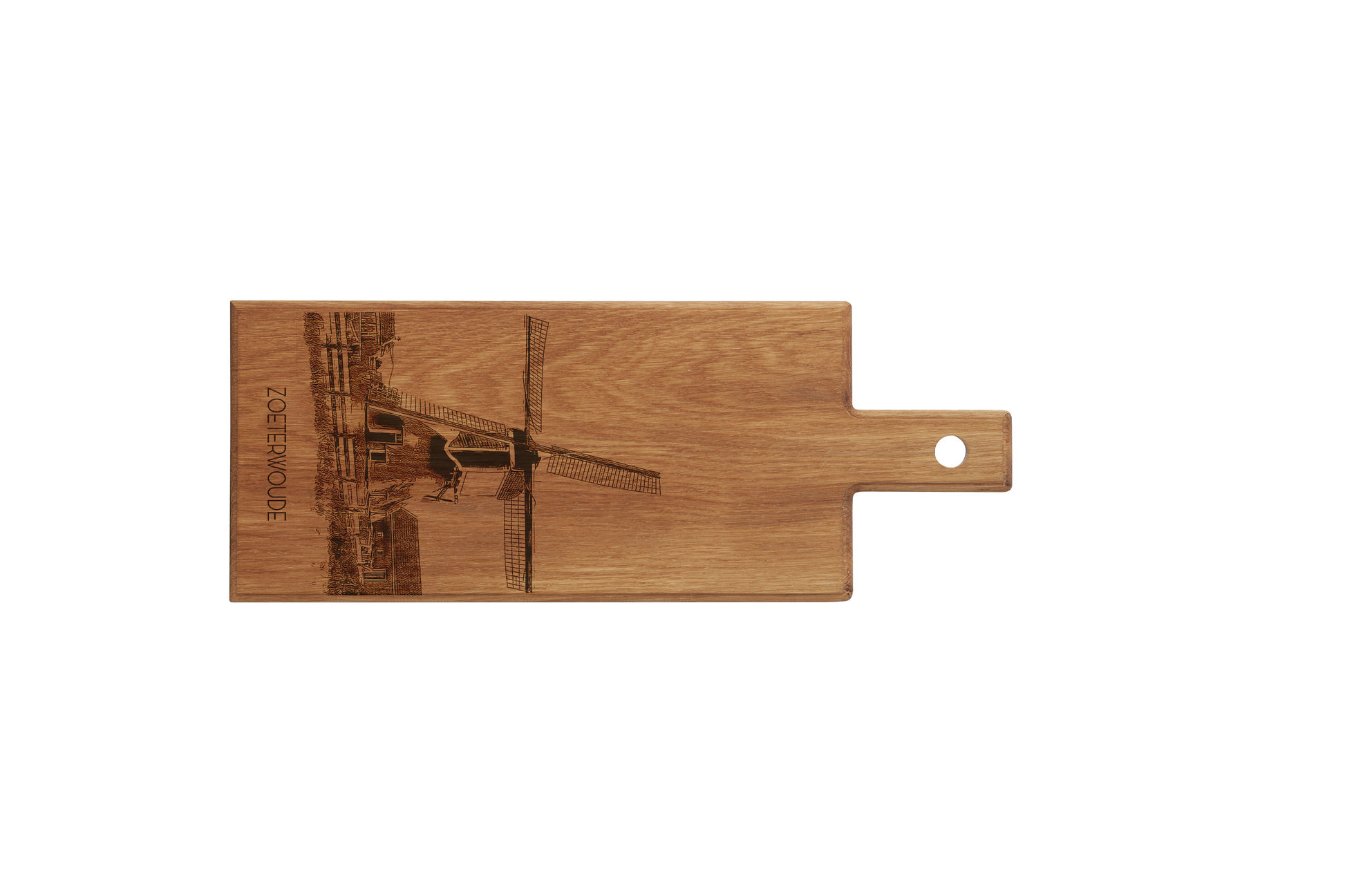 Celebrate the rural heritage of Zoeterwoude with this Zoeterwoude Molen wooden serving board. Handmade in the Netherlands, this elegant wooden serving board features a finely engraved illustration of the iconic Zoeterwoude Molen, a symbol of the village’s agricultural history and Dutch craftsmanship. Crafted from solid European beech wood, each board is individually made, carefully sanded, and finished by hand—ensuring every piece is truly unique.