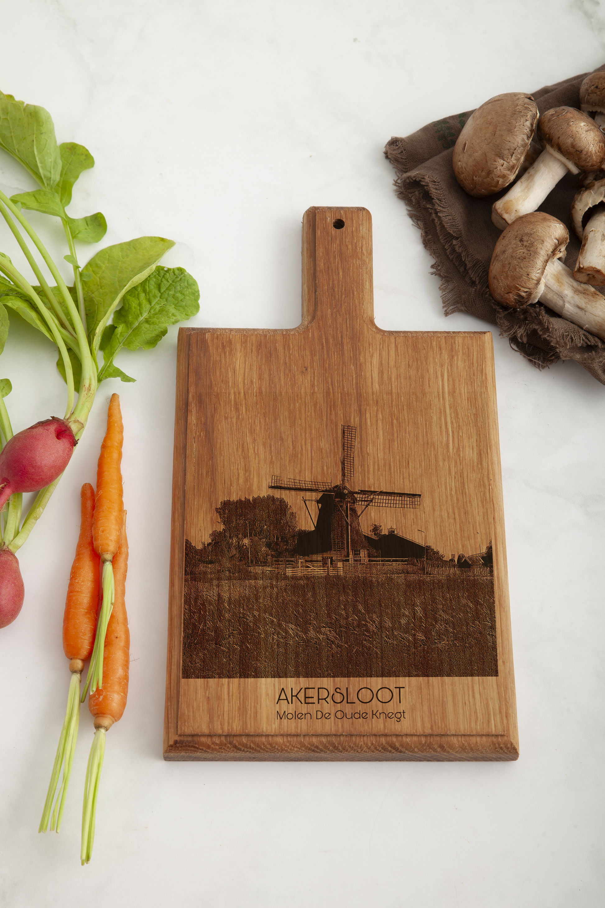 De plank is gemaakt uit één stuk FSC-gecertificeerd beukenhout, glad geschuurd en afgewerkt met een natuurlijke, voedselveilige olie. De fijne lijntekening van Molen de Oude Knegt vangt het karakter en de historie van Akersloot in een tijdloos en minimalistisch ontwerp.