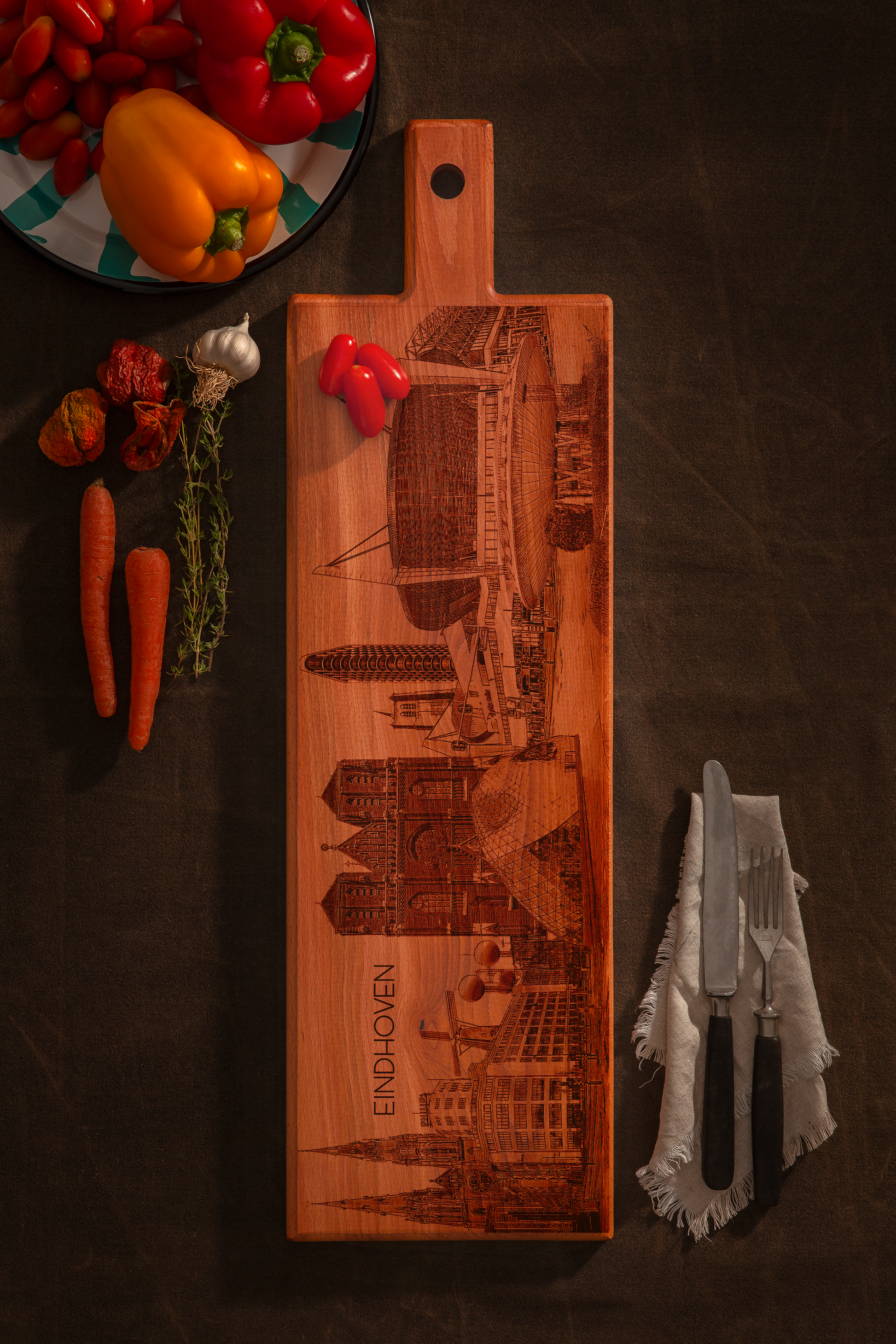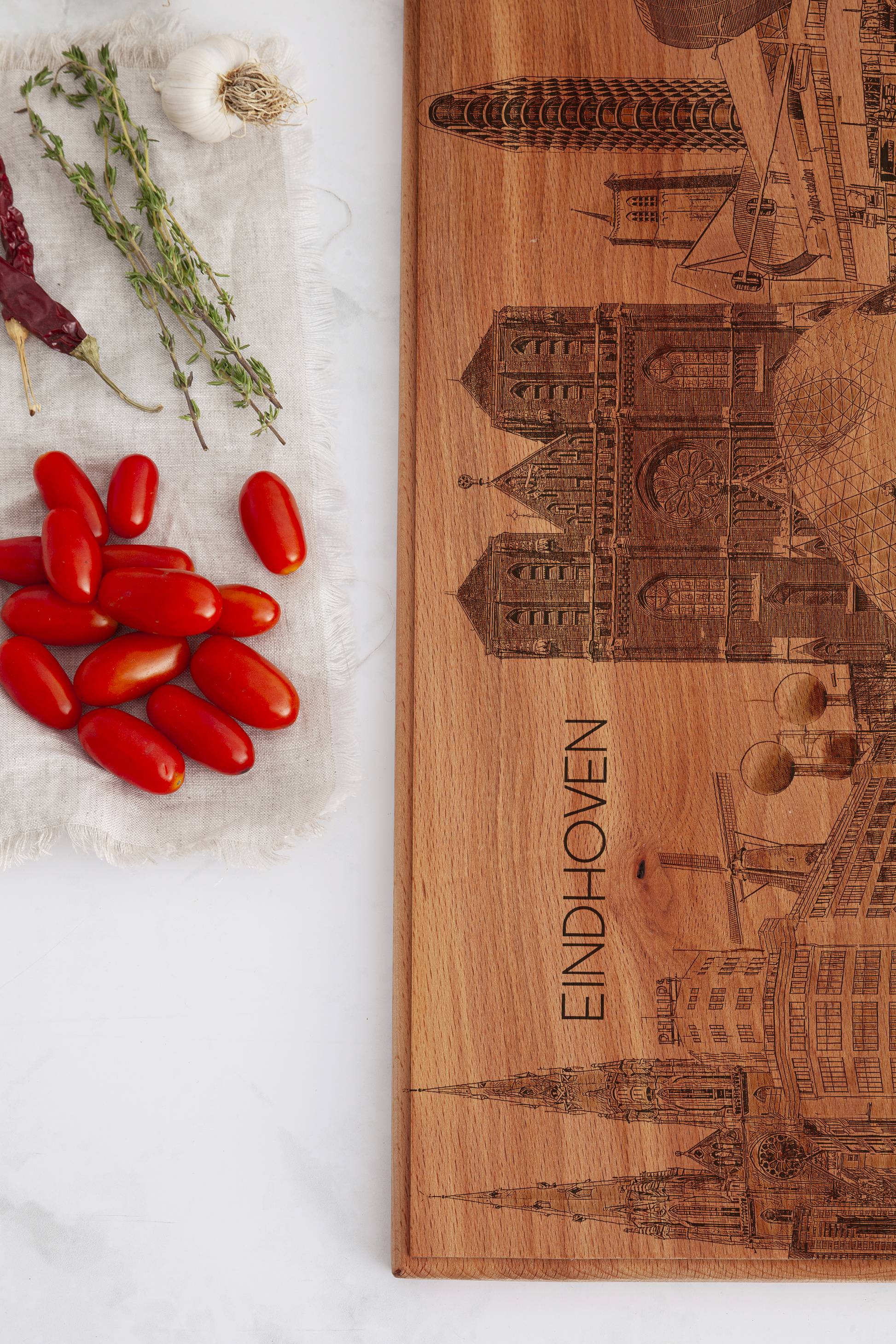 Haal het innovatieve karakter van Eindhoven in huis met deze handgemaakte Eindhoven houten serveerplank. Deze houten serveerplank is vervaardigd in Nederland en voorzien van een verfijnde lijntekening geïnspireerd op de moderne architectuur en designmentaliteit van Eindhoven. Een stijlvolle combinatie van functionaliteit en eigentijdse uitstraling.