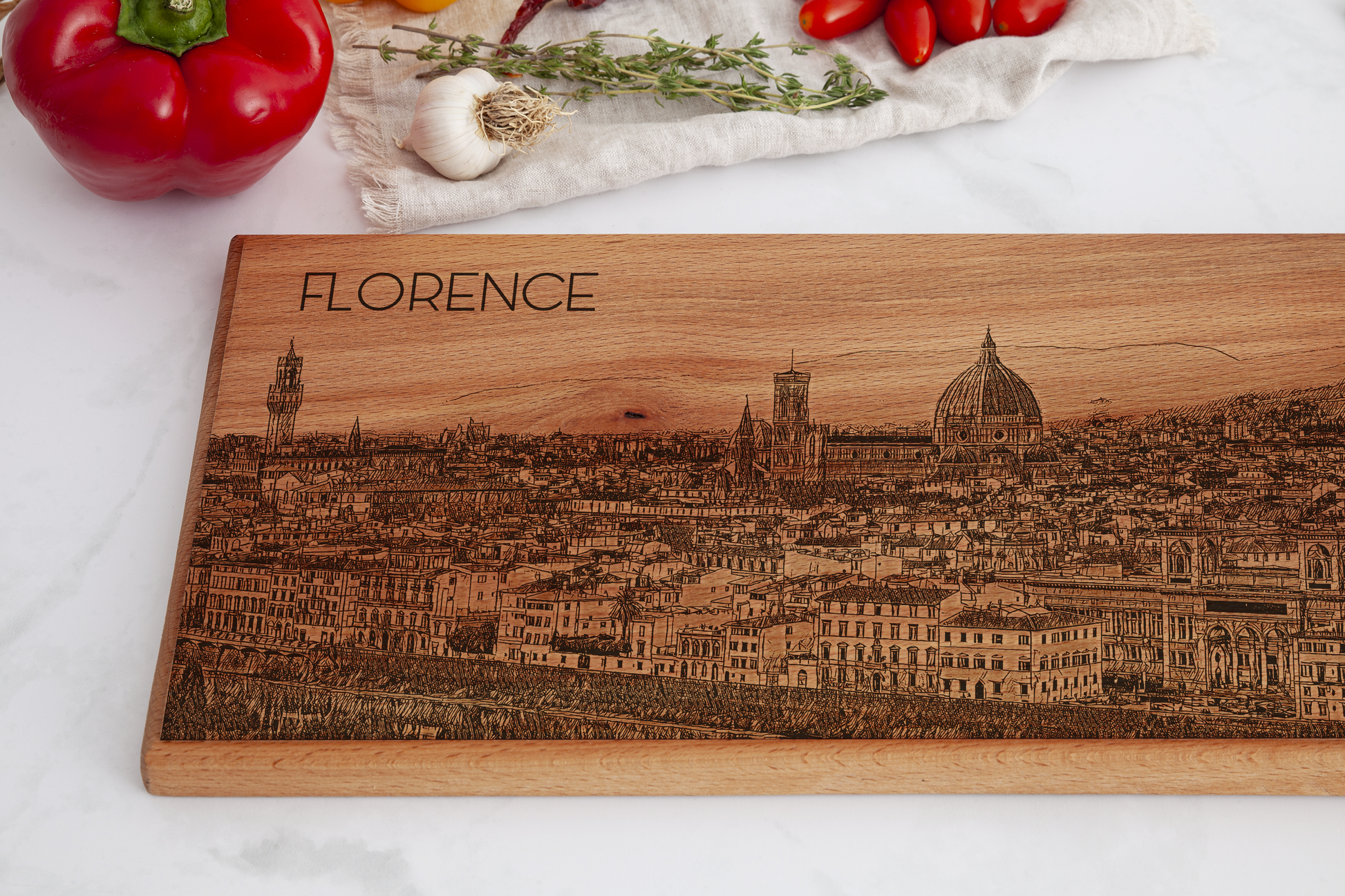 Haal de tijdloze schoonheid van Florence in huis met deze handgemaakte Florence skyline houten serveerplank. Deze houten serveerplank is met zorg vervaardigd in Nederland en voorzien van een verfijnde lijntekening geïnspireerd op de iconische architectuur van Florence. Een perfecte combinatie van functionaliteit en esthetiek voor serveren of decoratief gebruik.