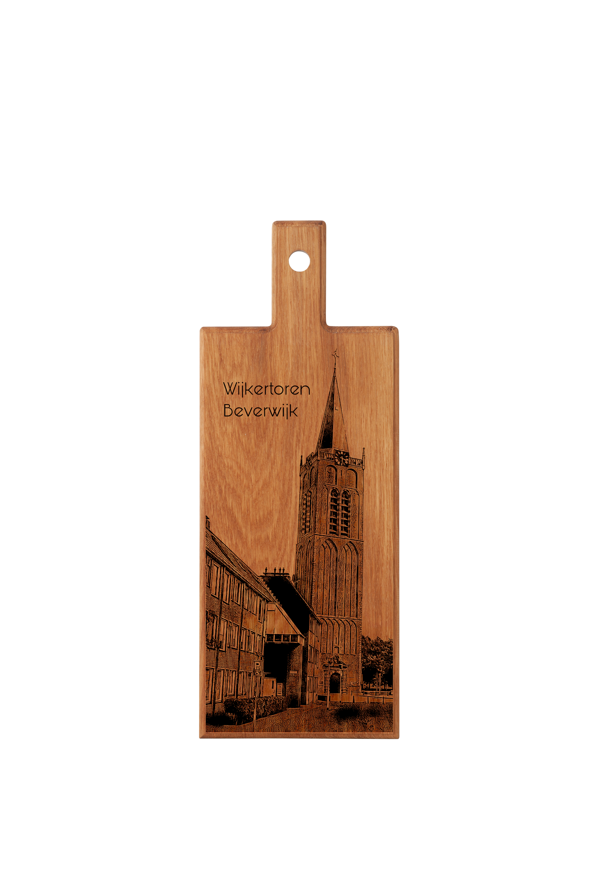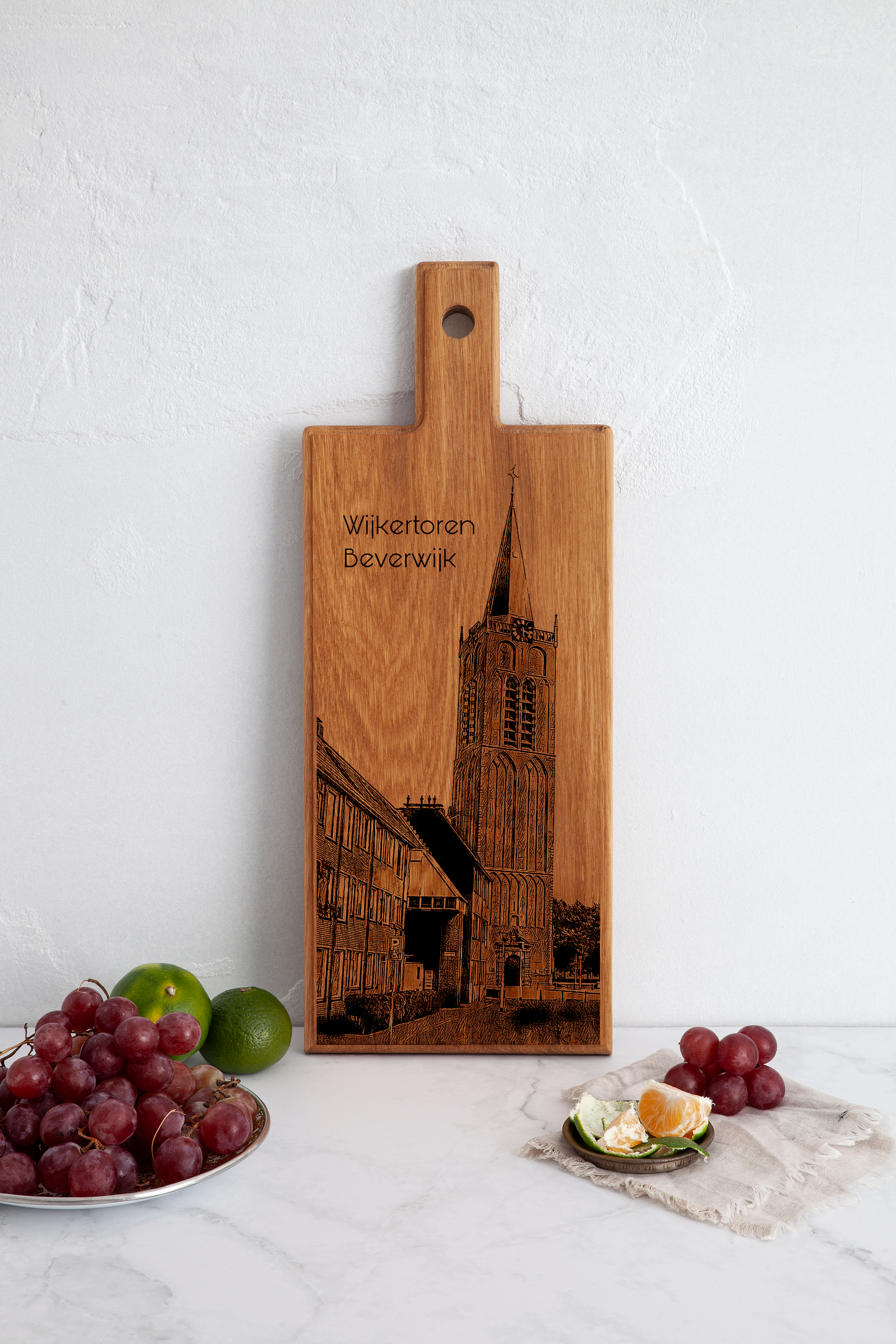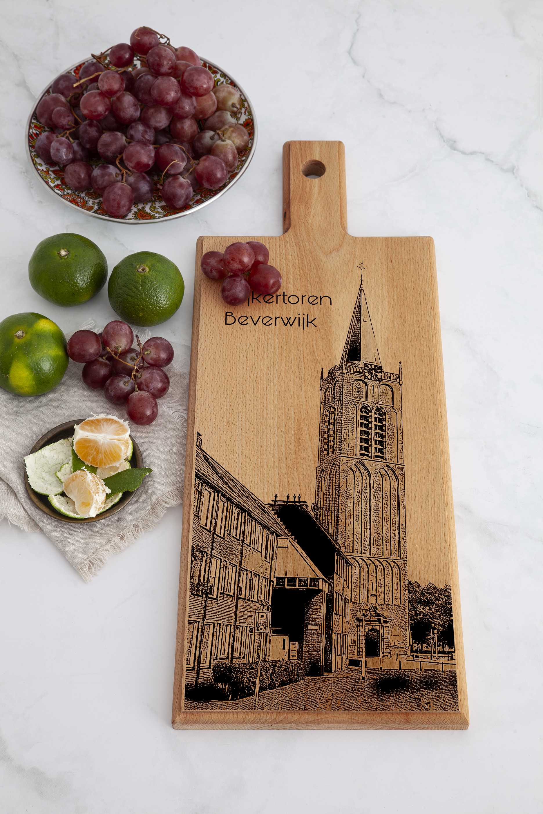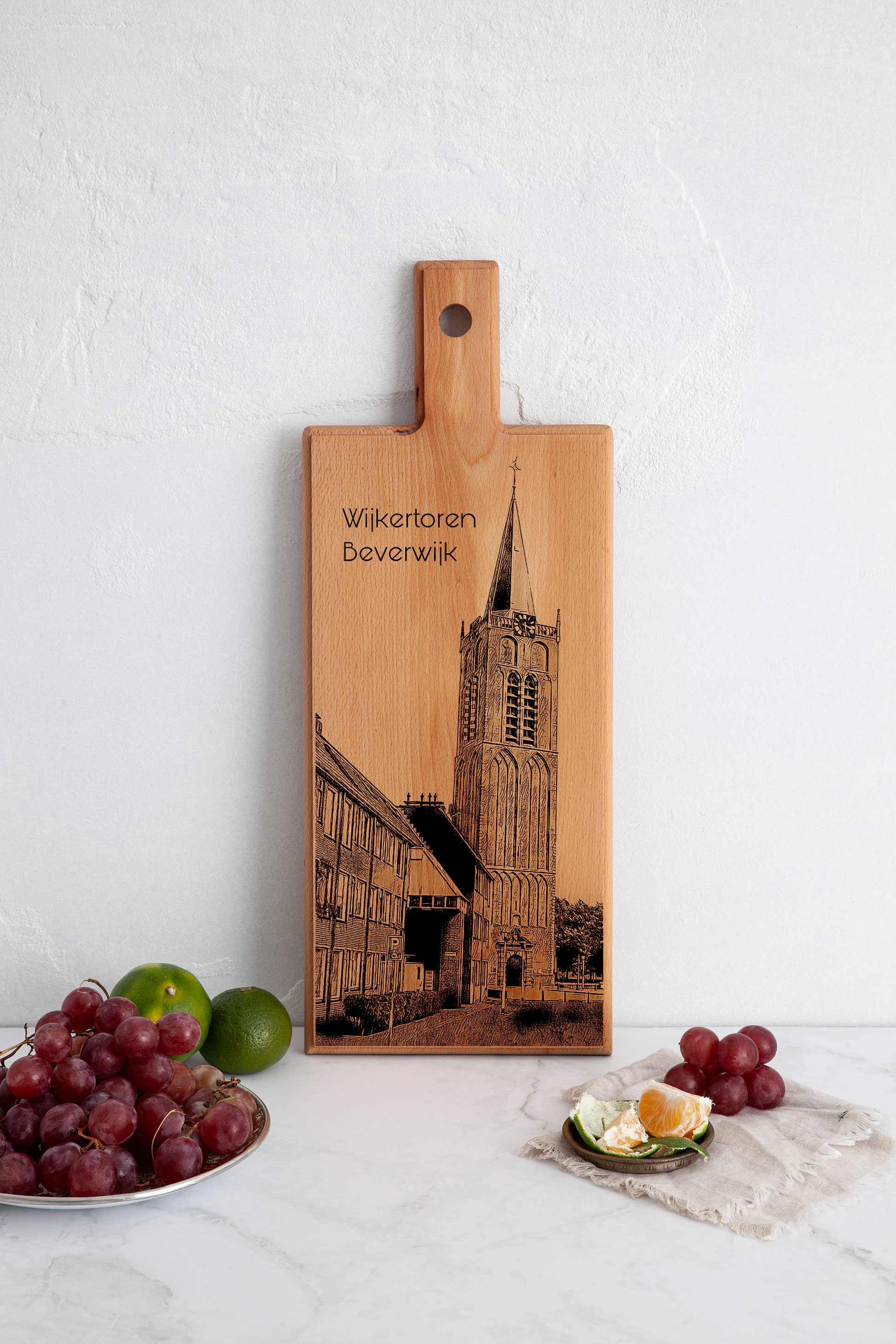 Verhoog Uw Serveerervaring met Onze Handgemaakte Beverwijk Wijkertoren Gegraveerde Serveerplank