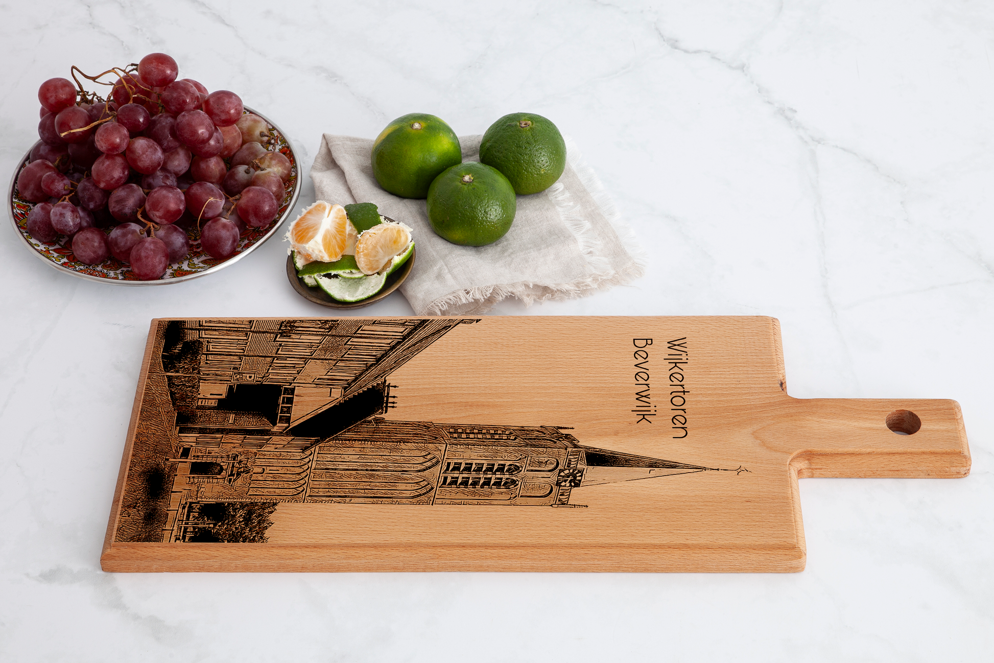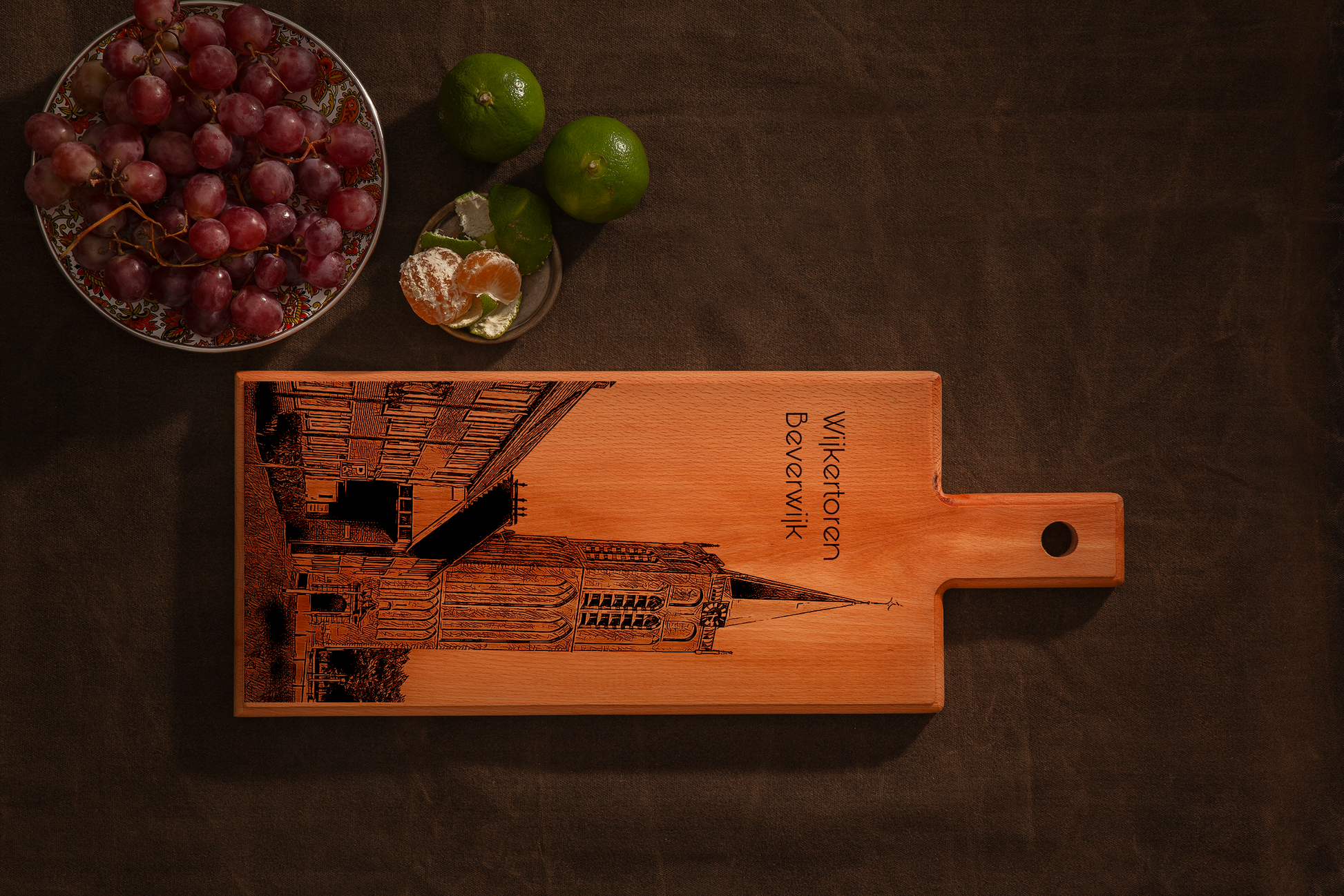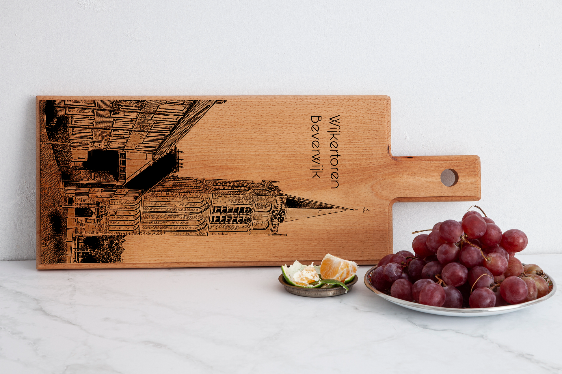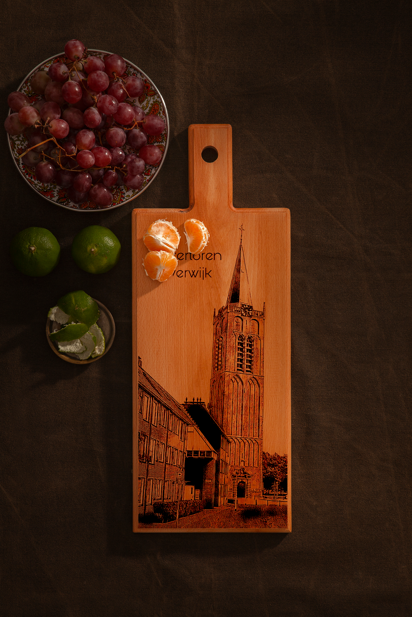 Verhoog Uw Serveerervaring met Onze Handgemaakte Beverwijk Wijkertoren Gegraveerde Serveerplank