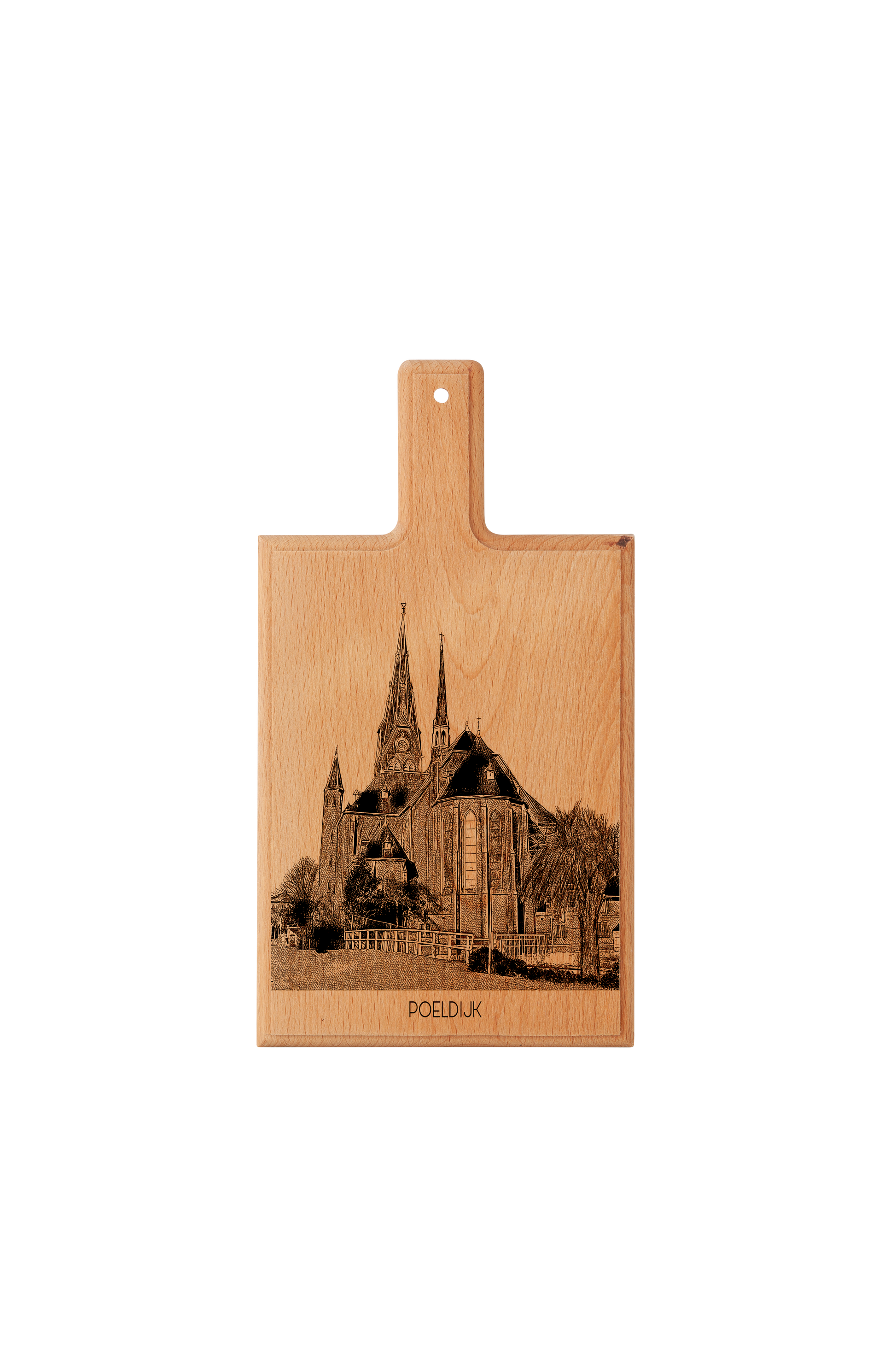 Voeg een vleugje Nederlandse elegantie toe aan uw keuken met onze Handgemaakte Poeldijk H. Bartholomeuskerk Gegraveerde Kaasplank!